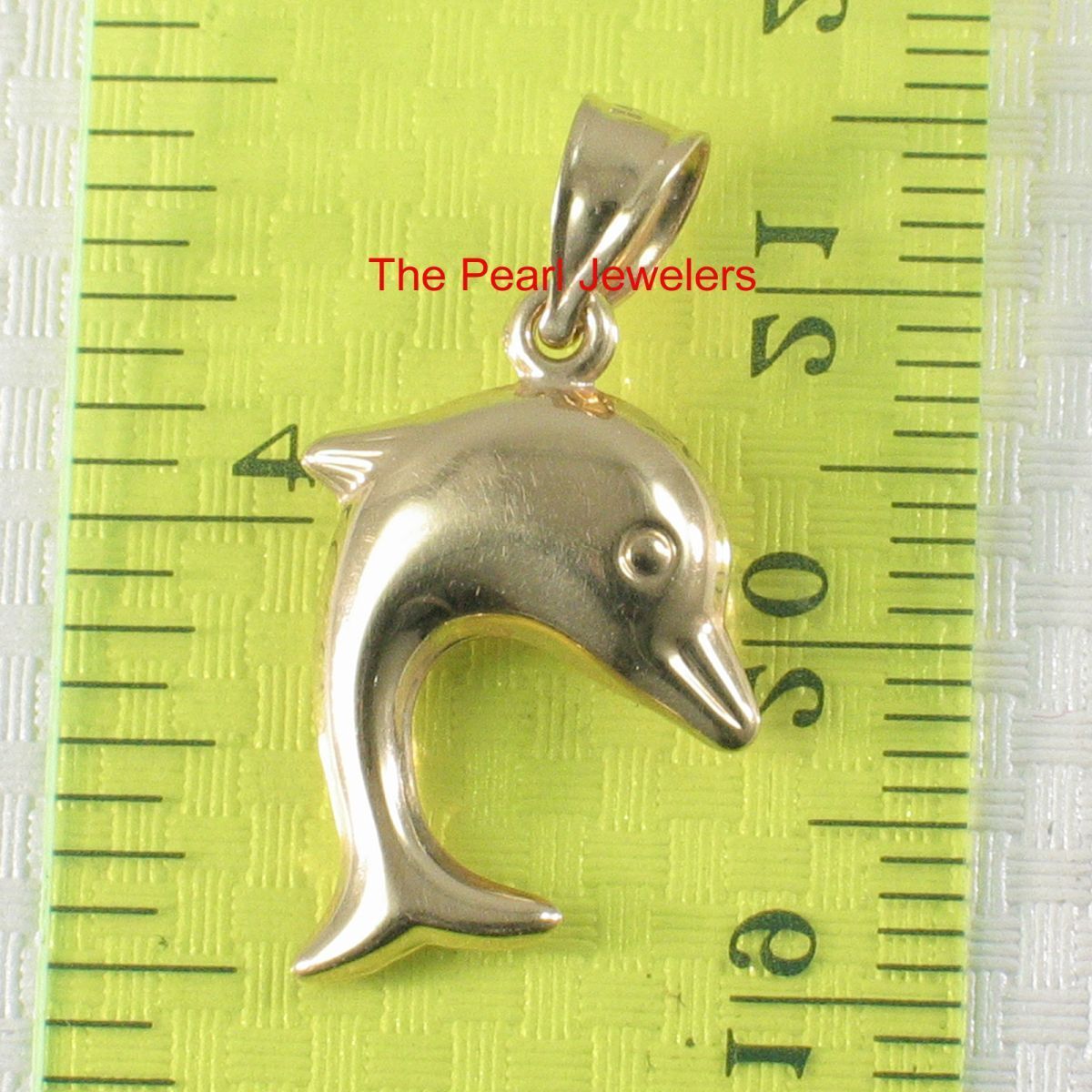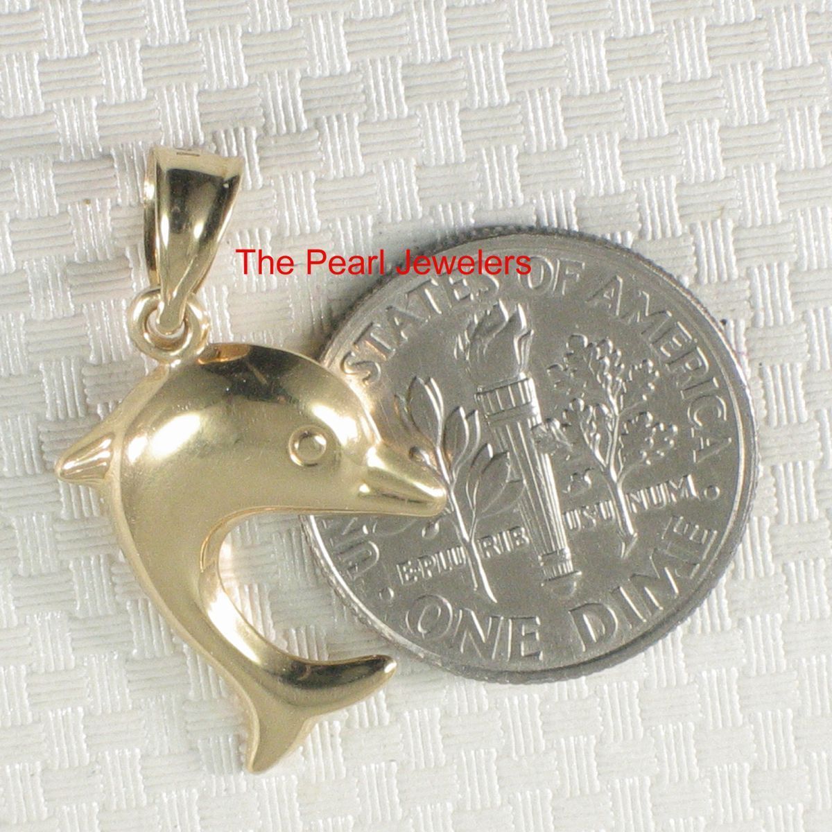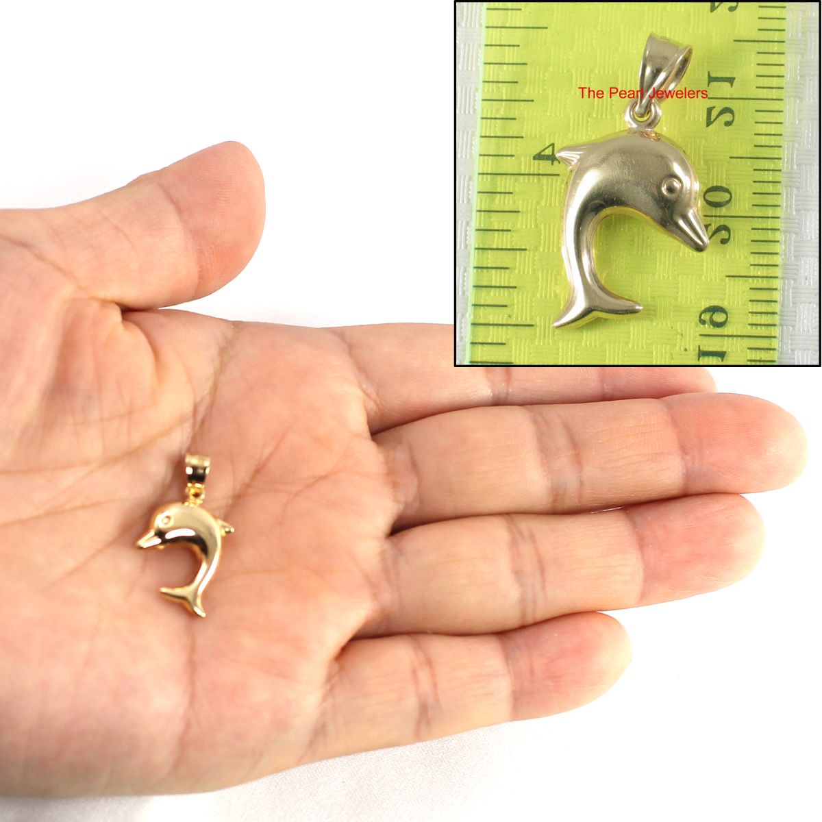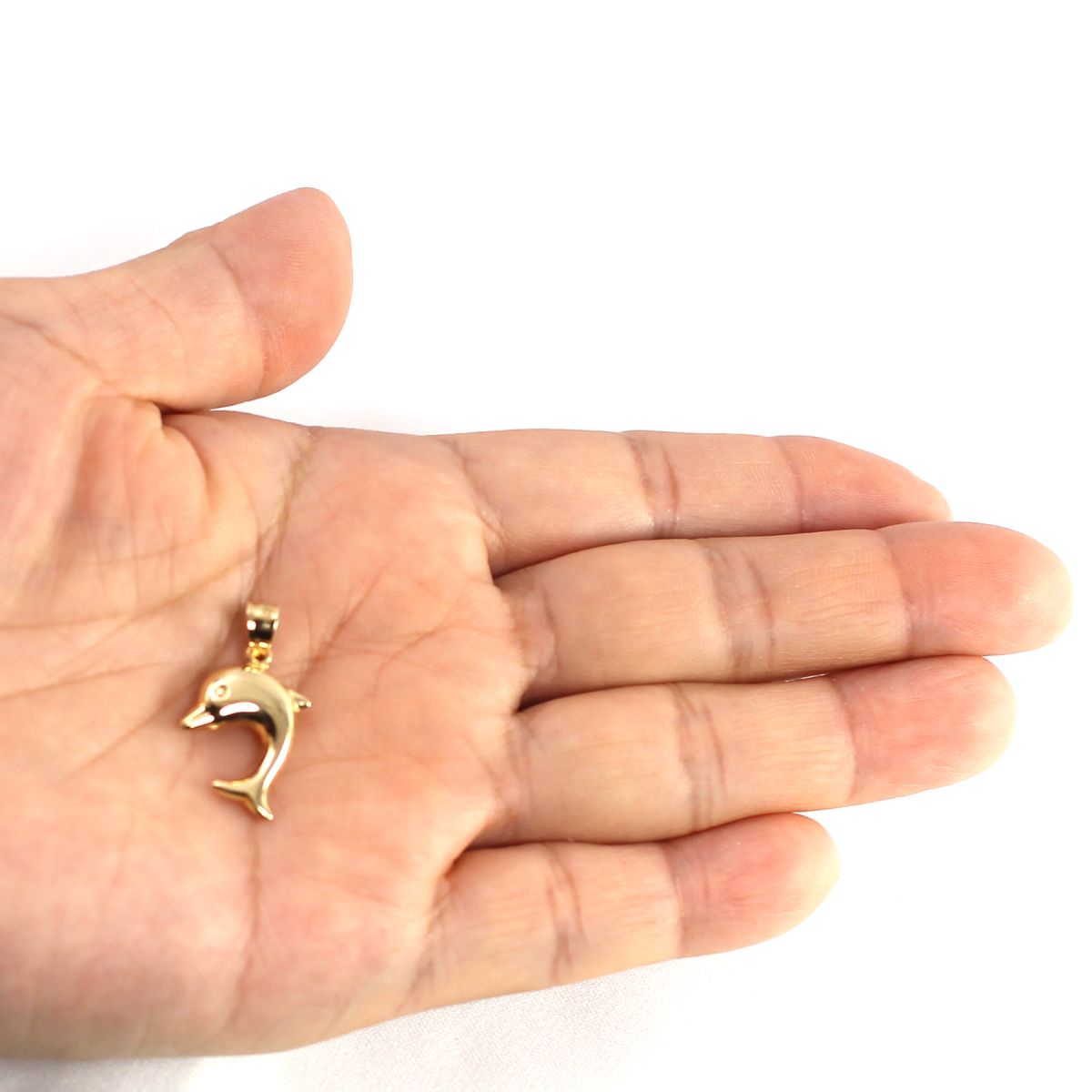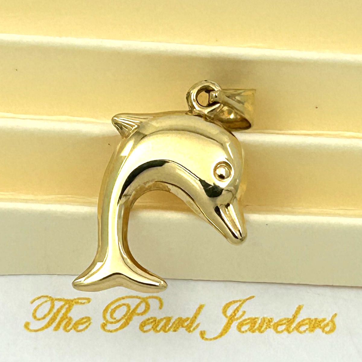 A beautifully handcrafted 3D dolphin pendant in solid 14K yellow gold, available as a pendant alone or with a matching gold chain.