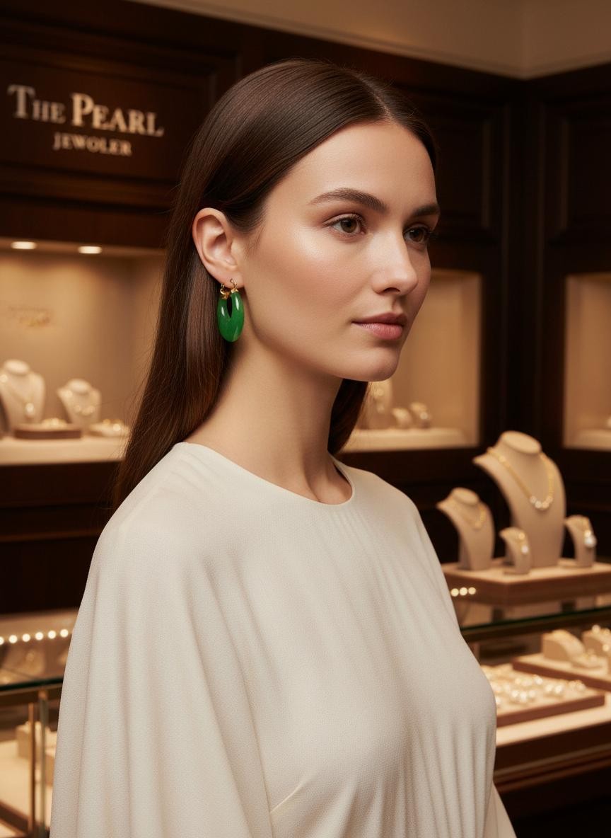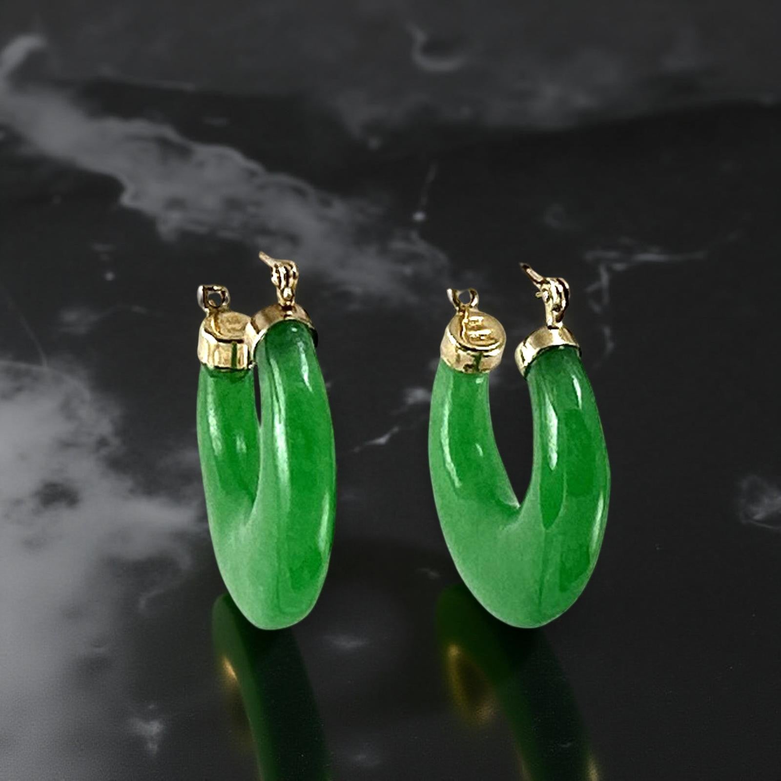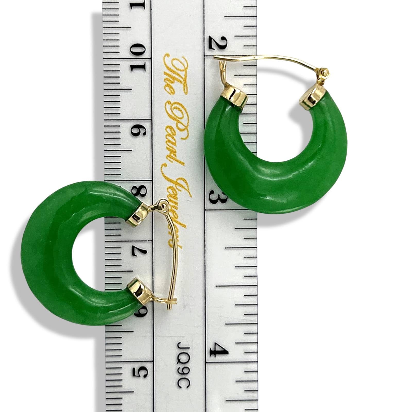 These solid 14K yellow gold earrings showcase a cabochon green jade moon shape, blending tradition with contemporary elegance, designed for comfort and dependable daily wear.