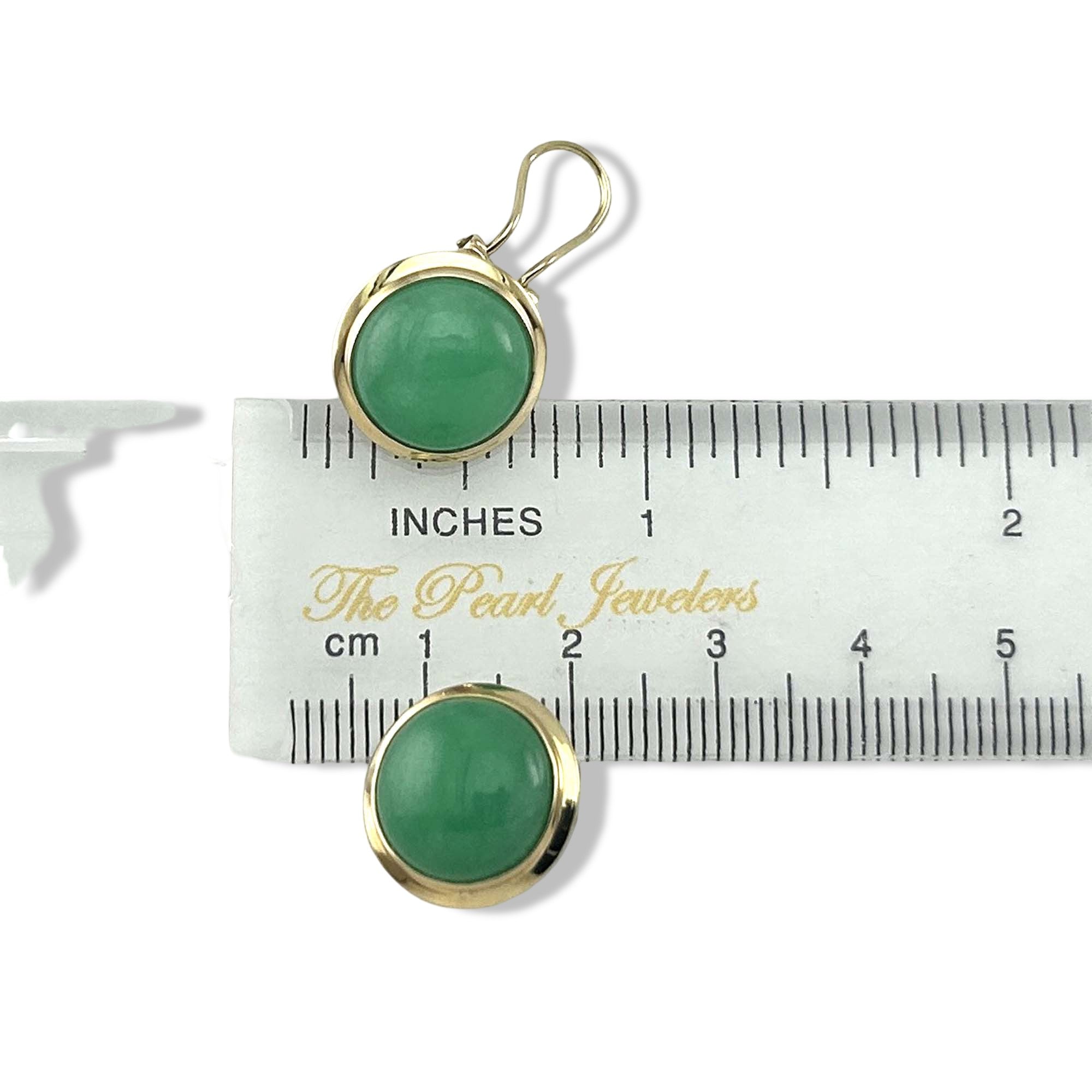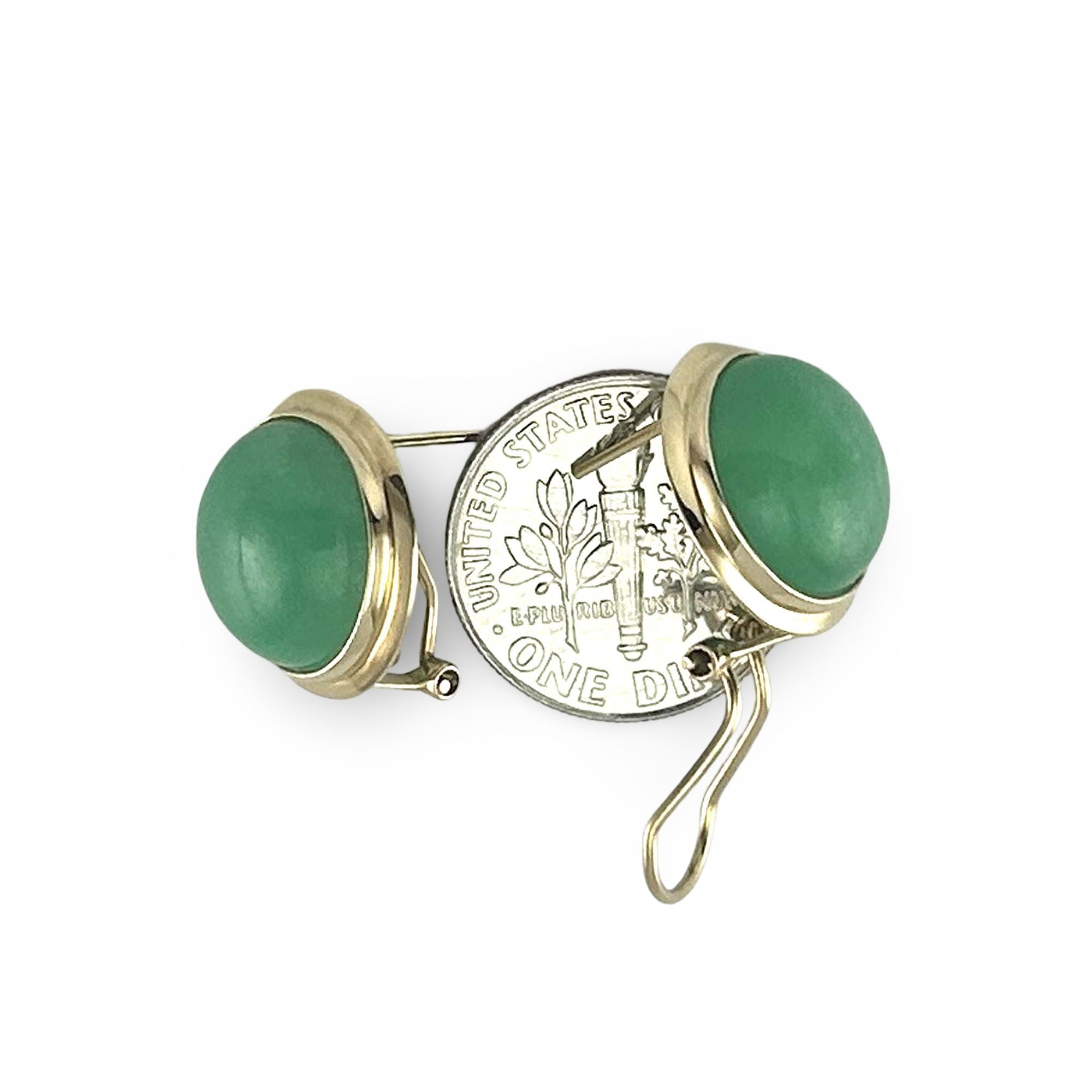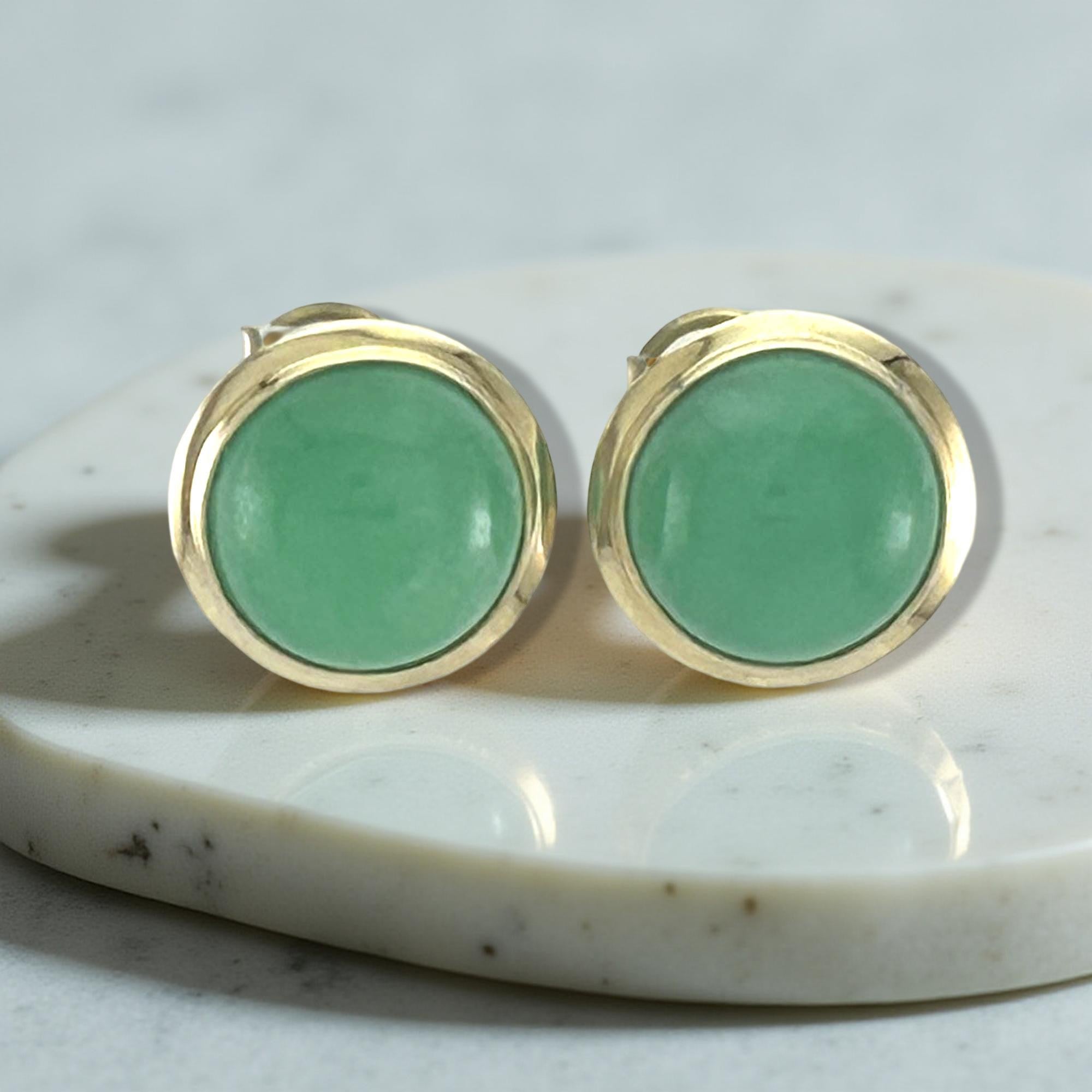 ✨These elegant round dome jade earrings feature a polished 12mm green jade cabochon in a solid 14K yellow gold bezel.