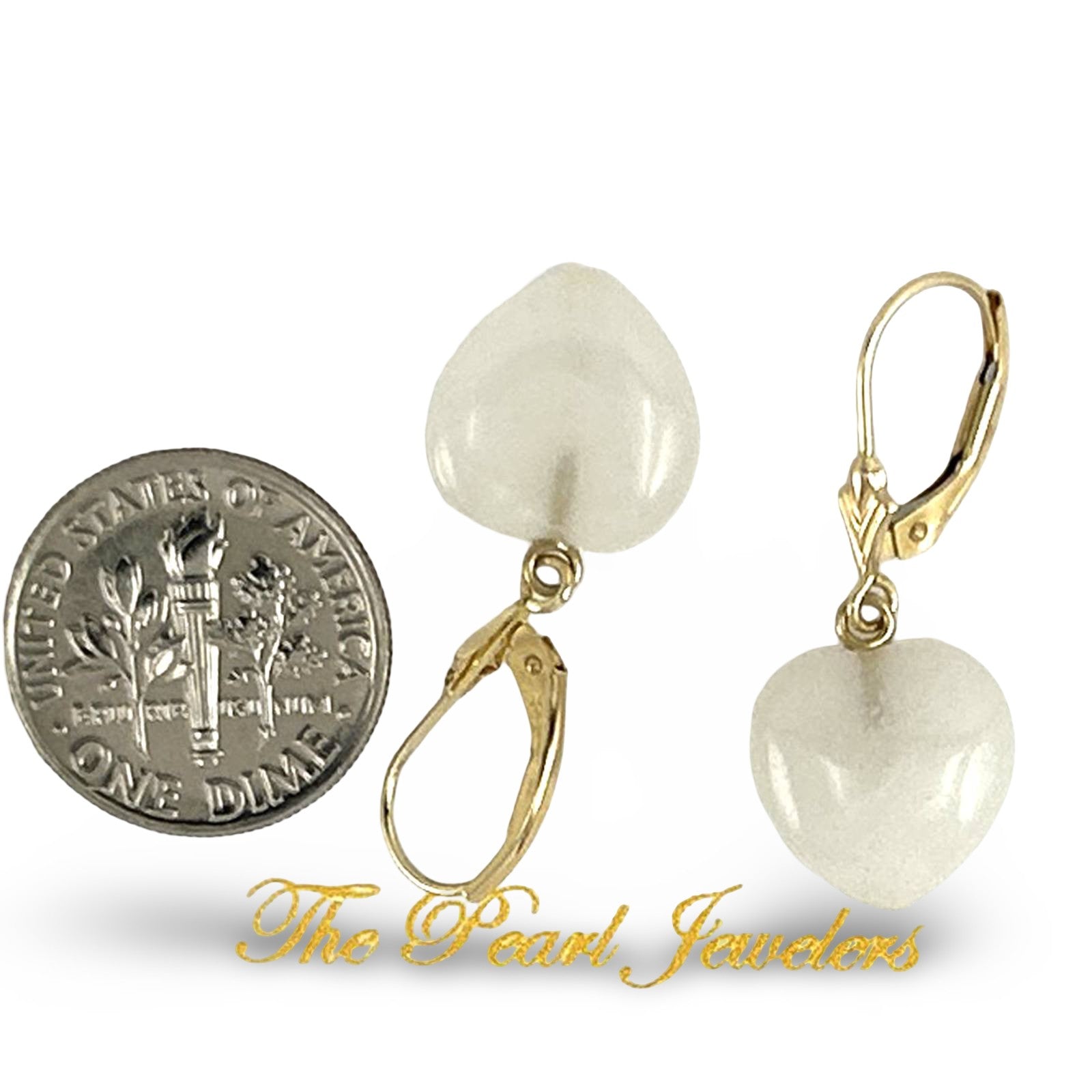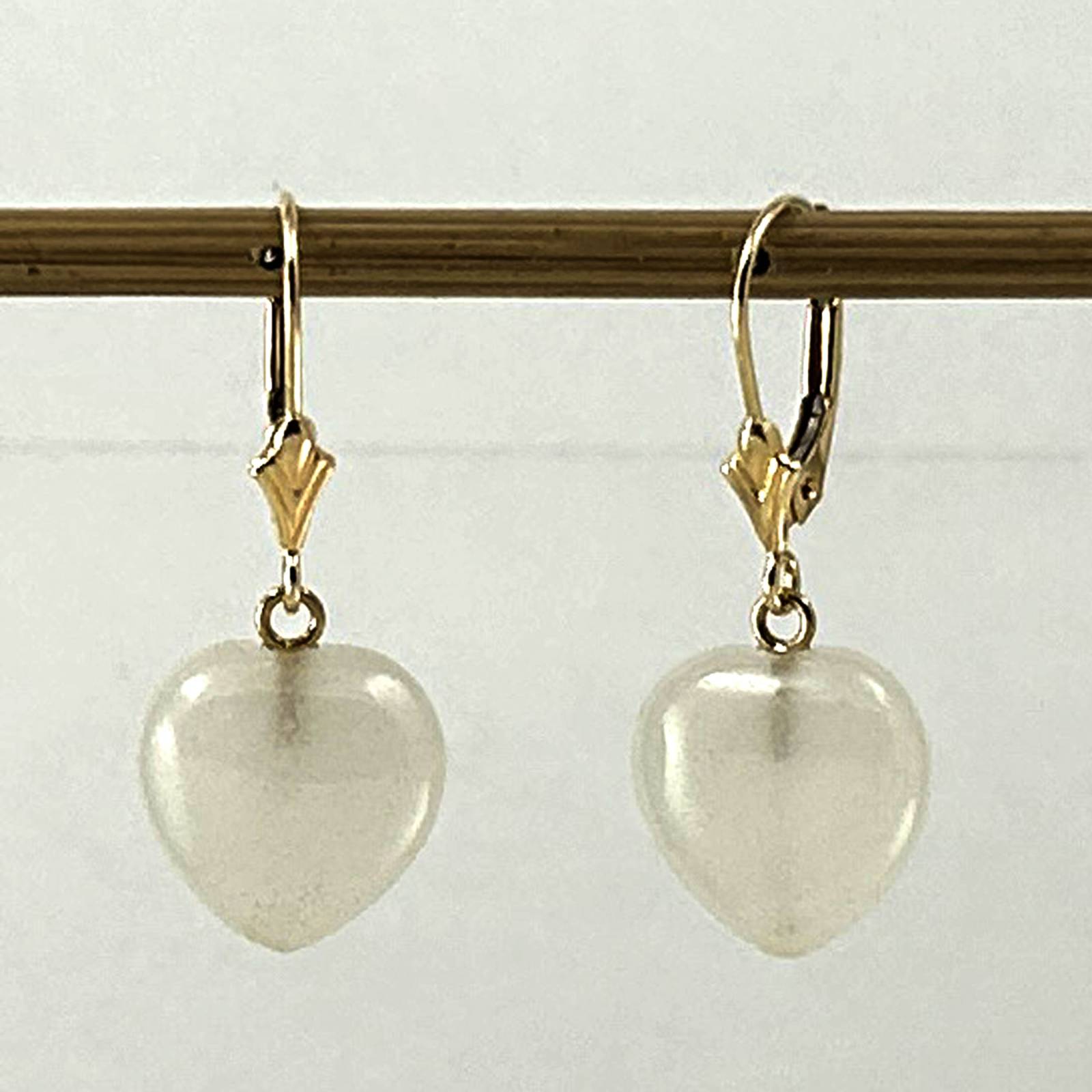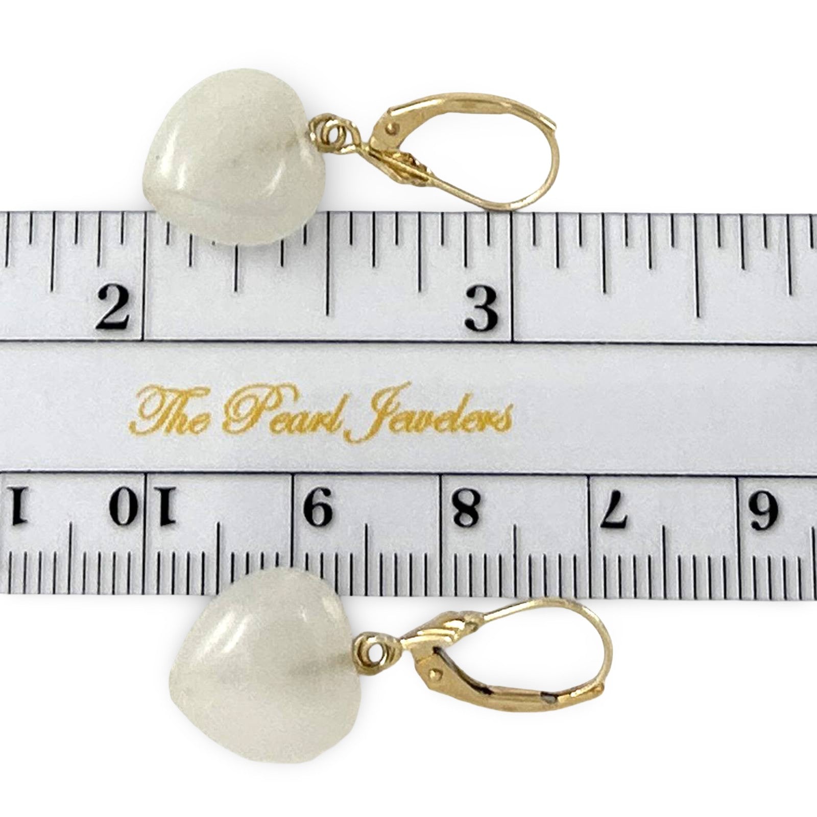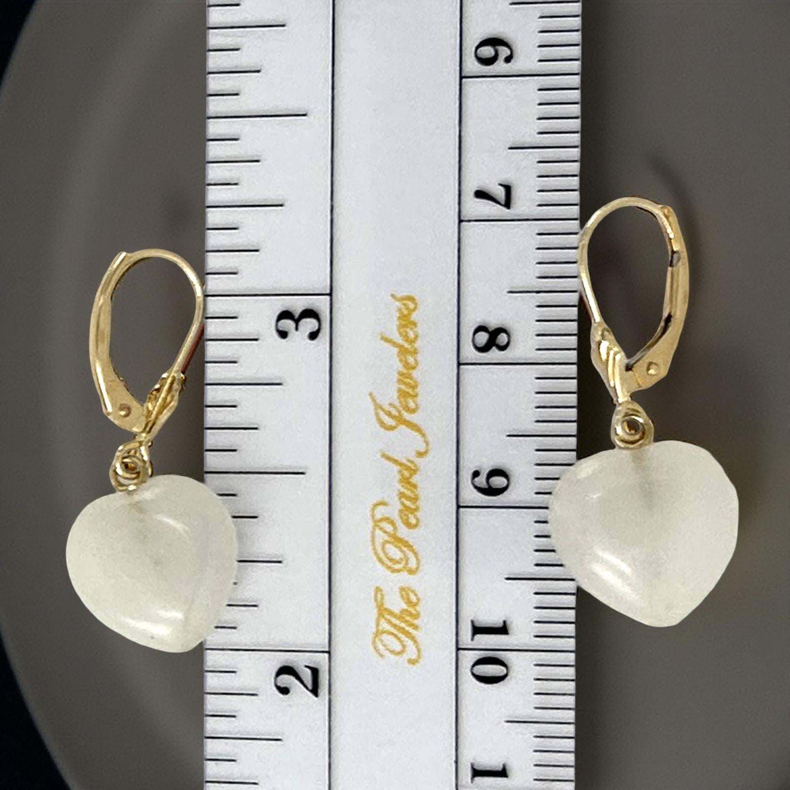 These solid 14K yellow gold earrings feature a heart-shaped white jade stone, delicately suspended from leverback closures for a secure and elegant look, designed for comfort and dependable daily wear.
