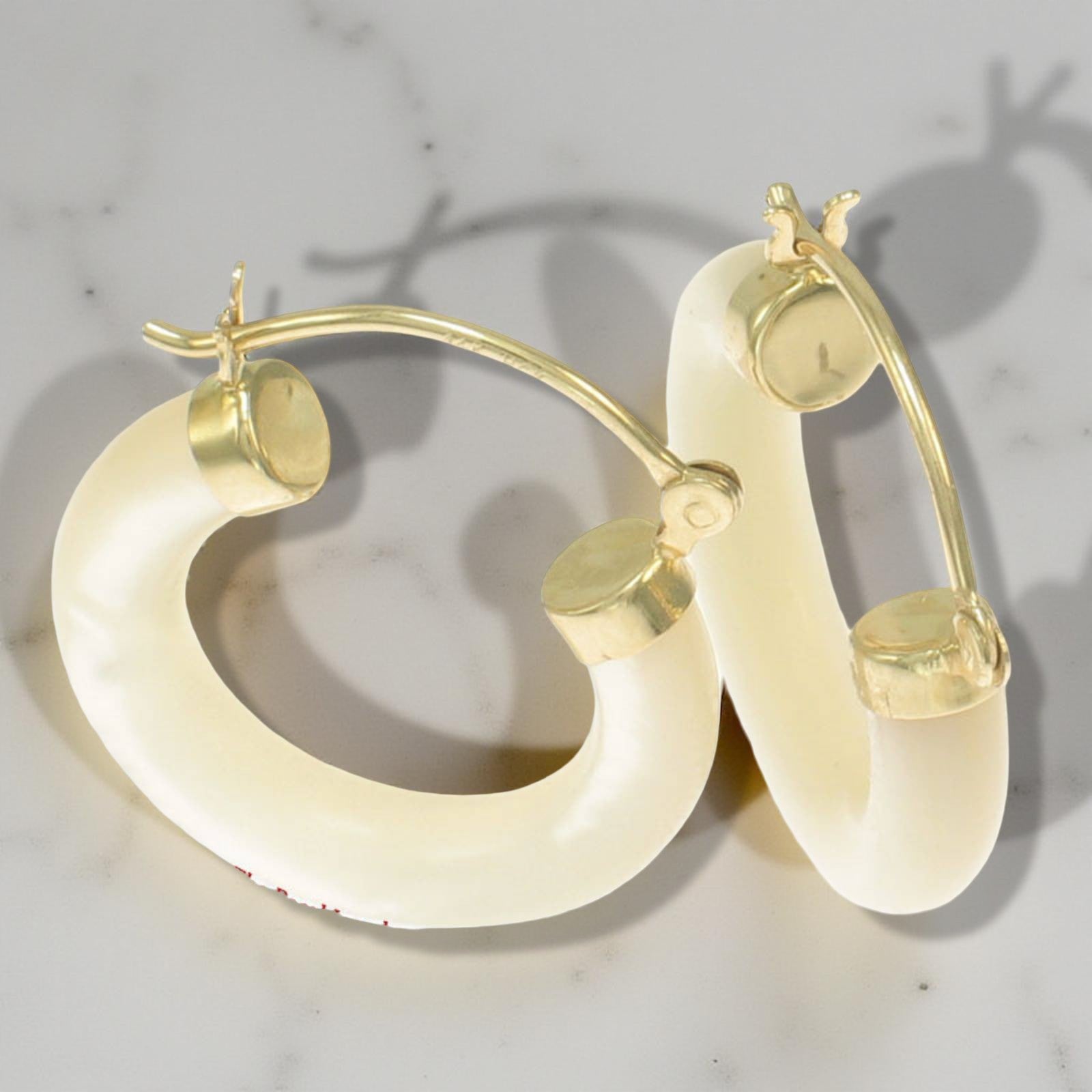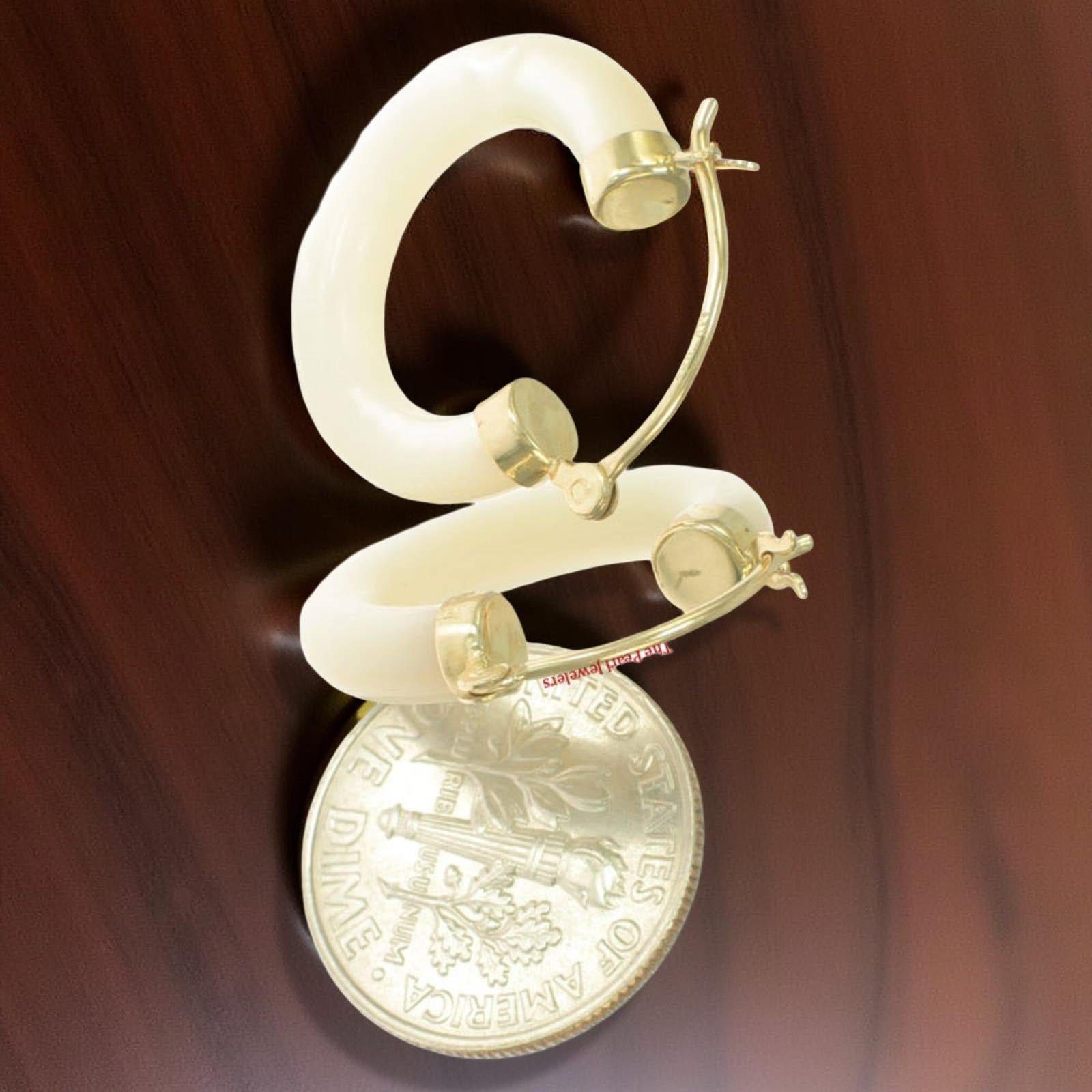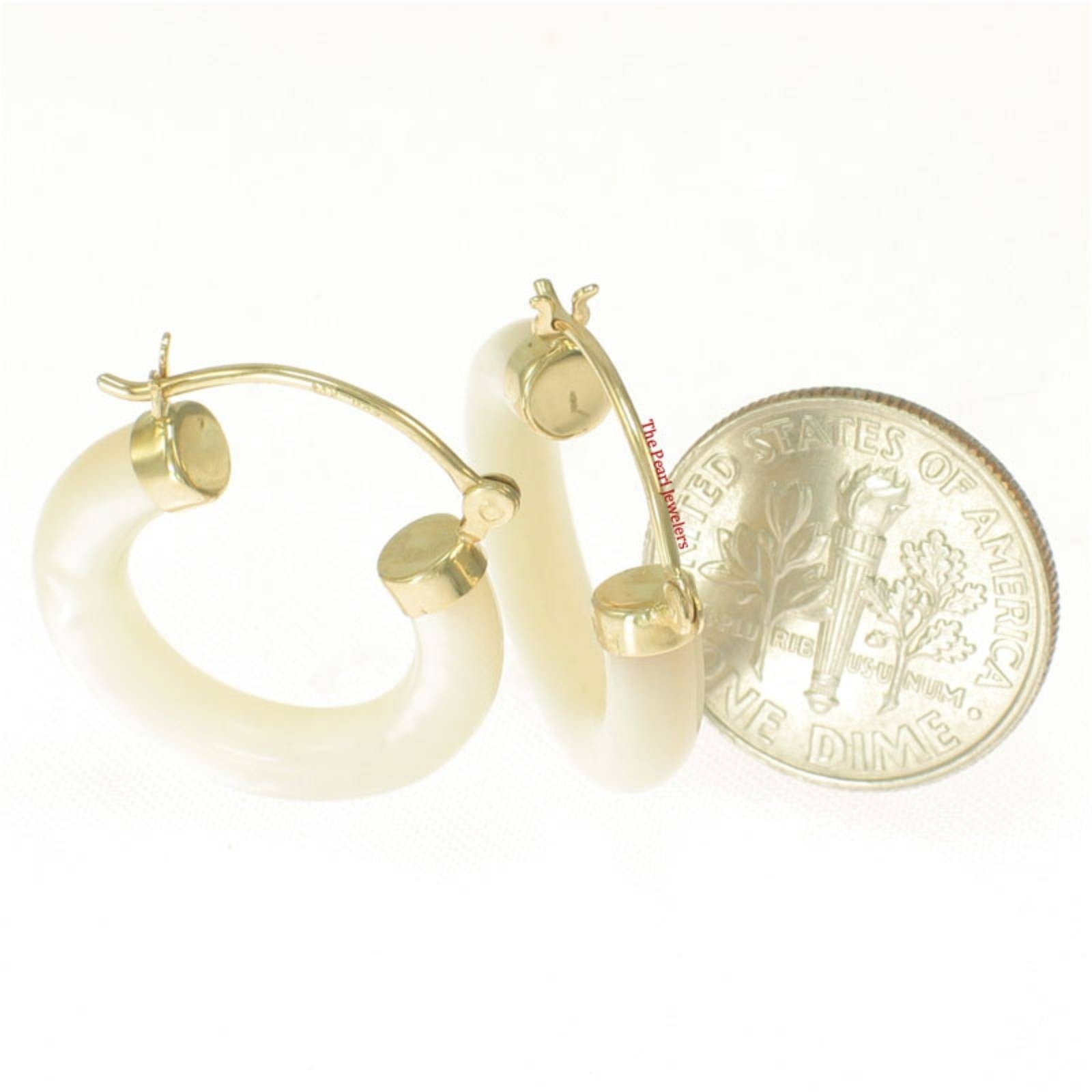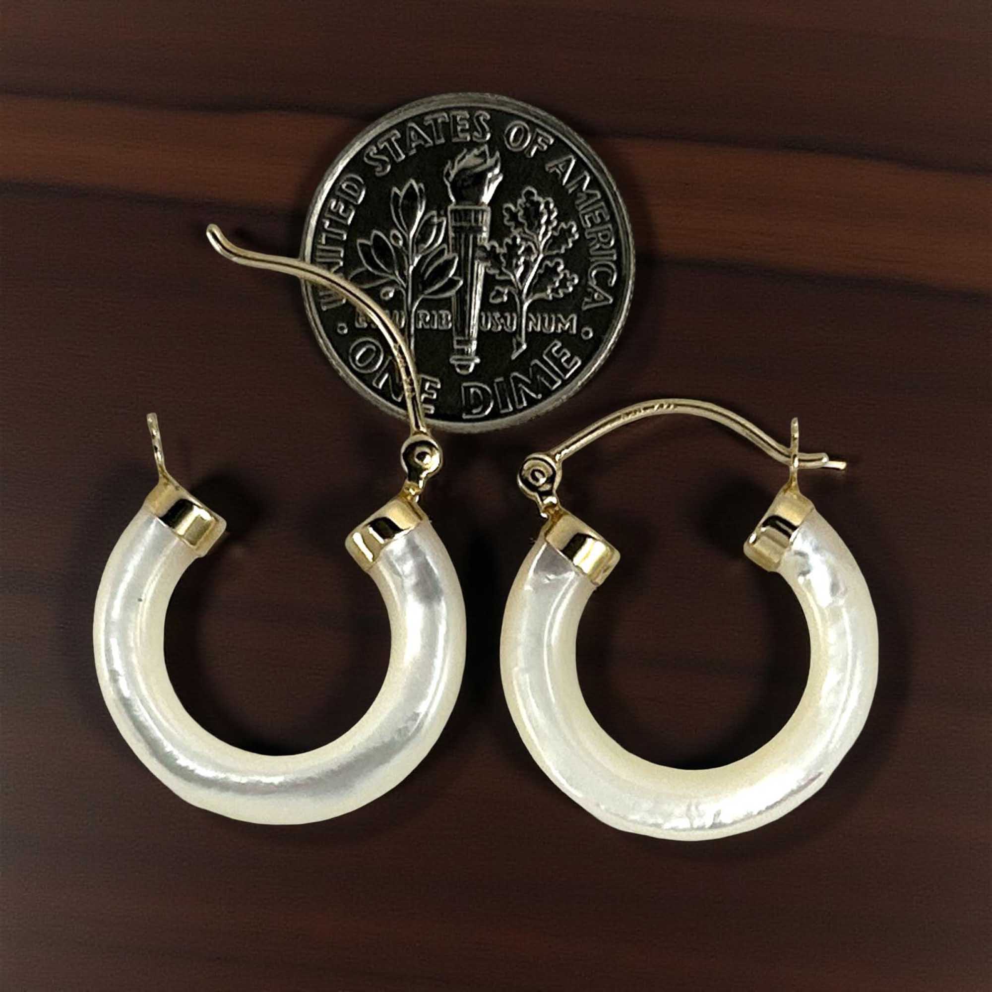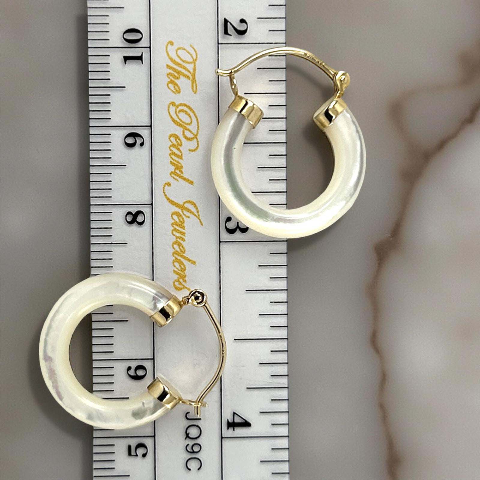 These solid 14K yellow gold hoop earrings feature a tube ring of genuine white mother of pearl, offering classic sophistication and elegance, designed for comfort and dependable daily wear.