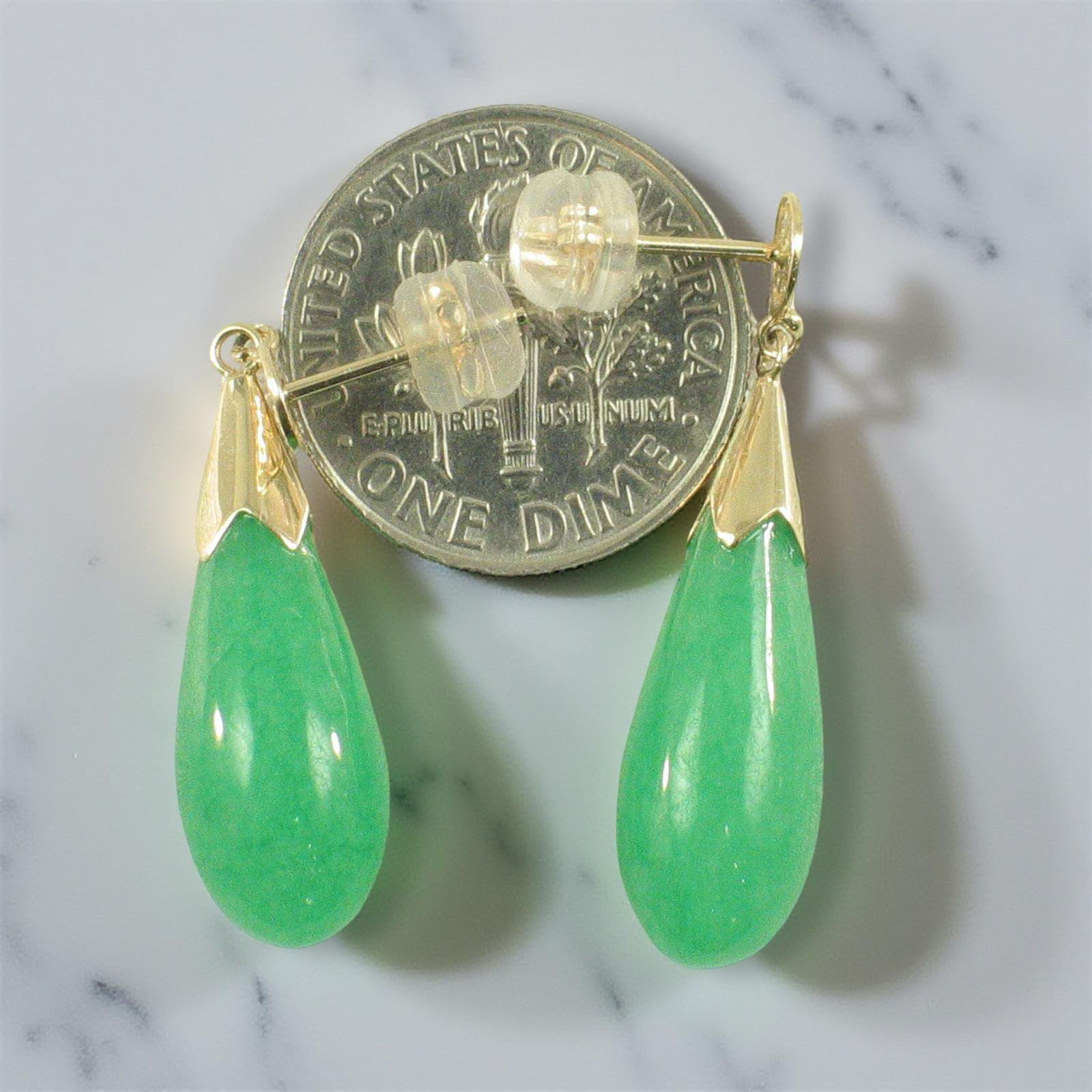14K Yellow Gold Raindrop Green Jade Dangle Earrings