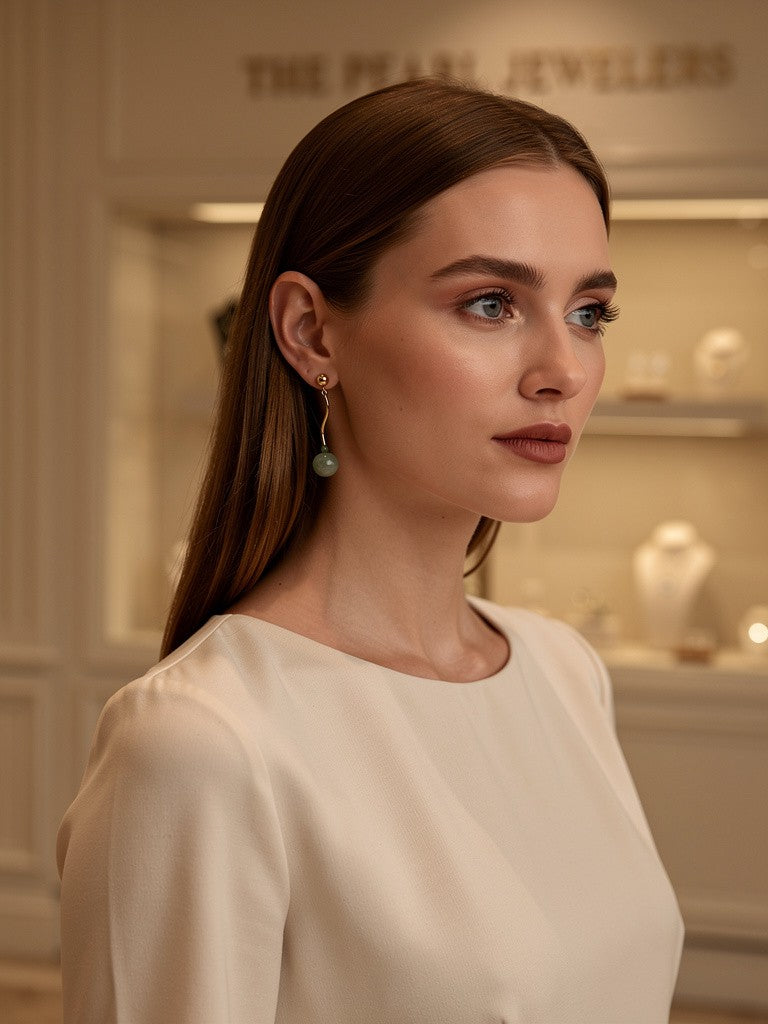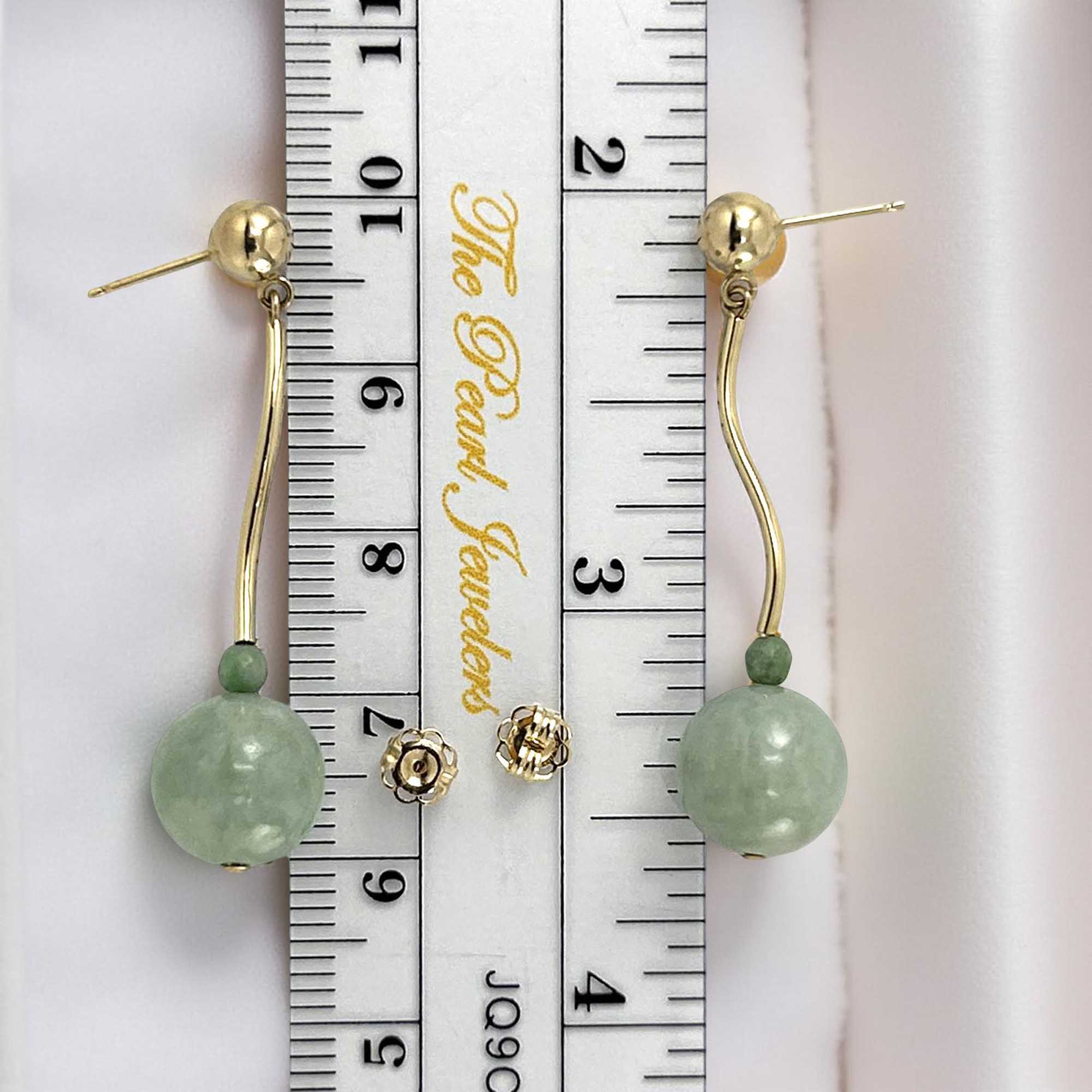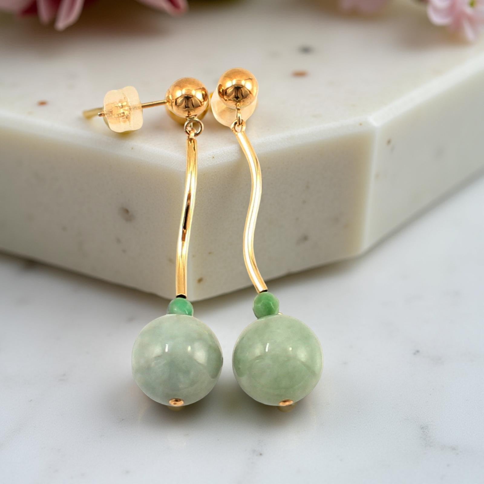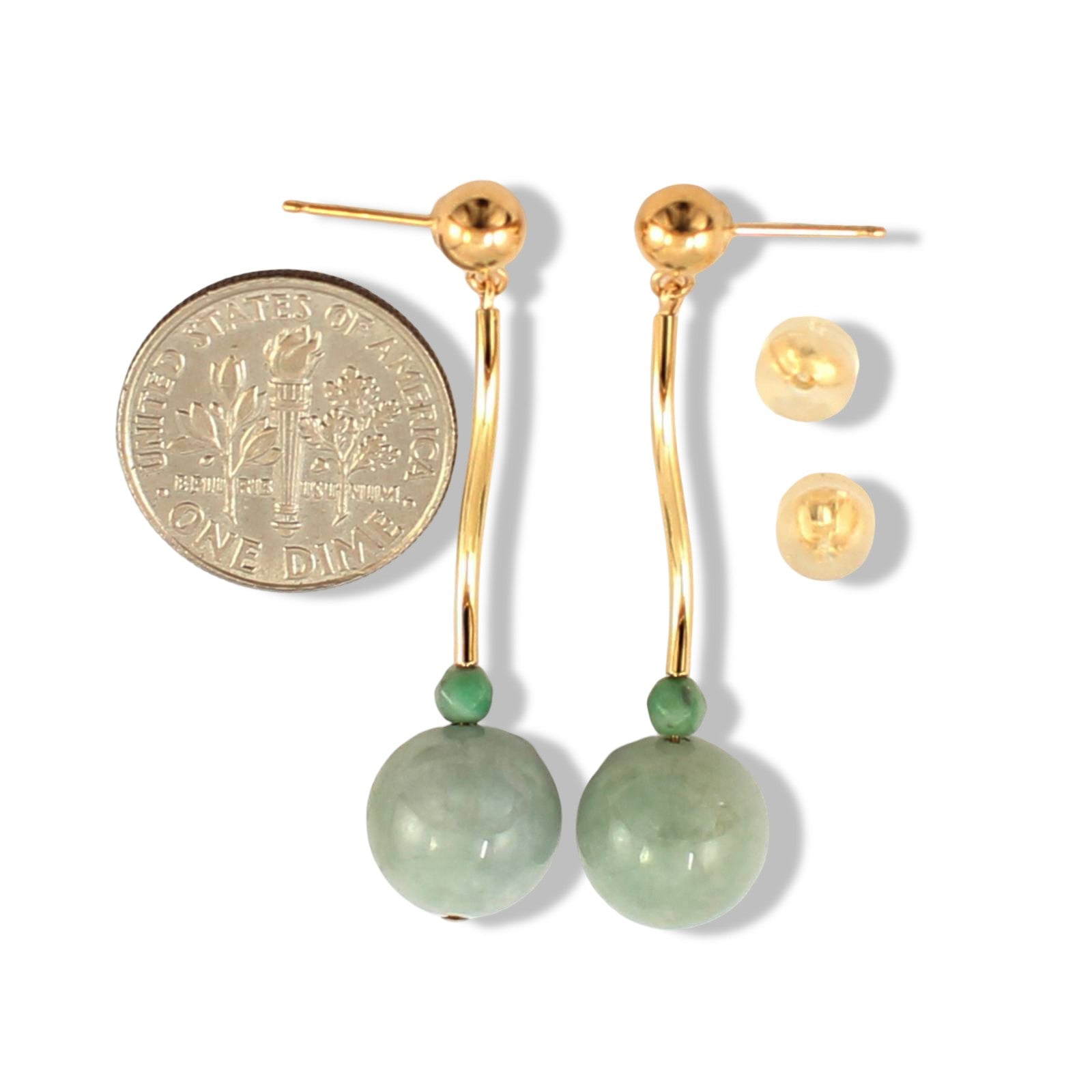These elegant 14K yellow gold earrings feature celadon green jadeite beads with S-shape detailing, blending classic and modern styles, designed for comfort and dependable daily wear.
