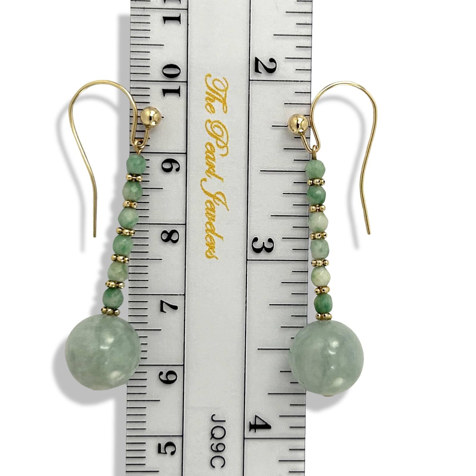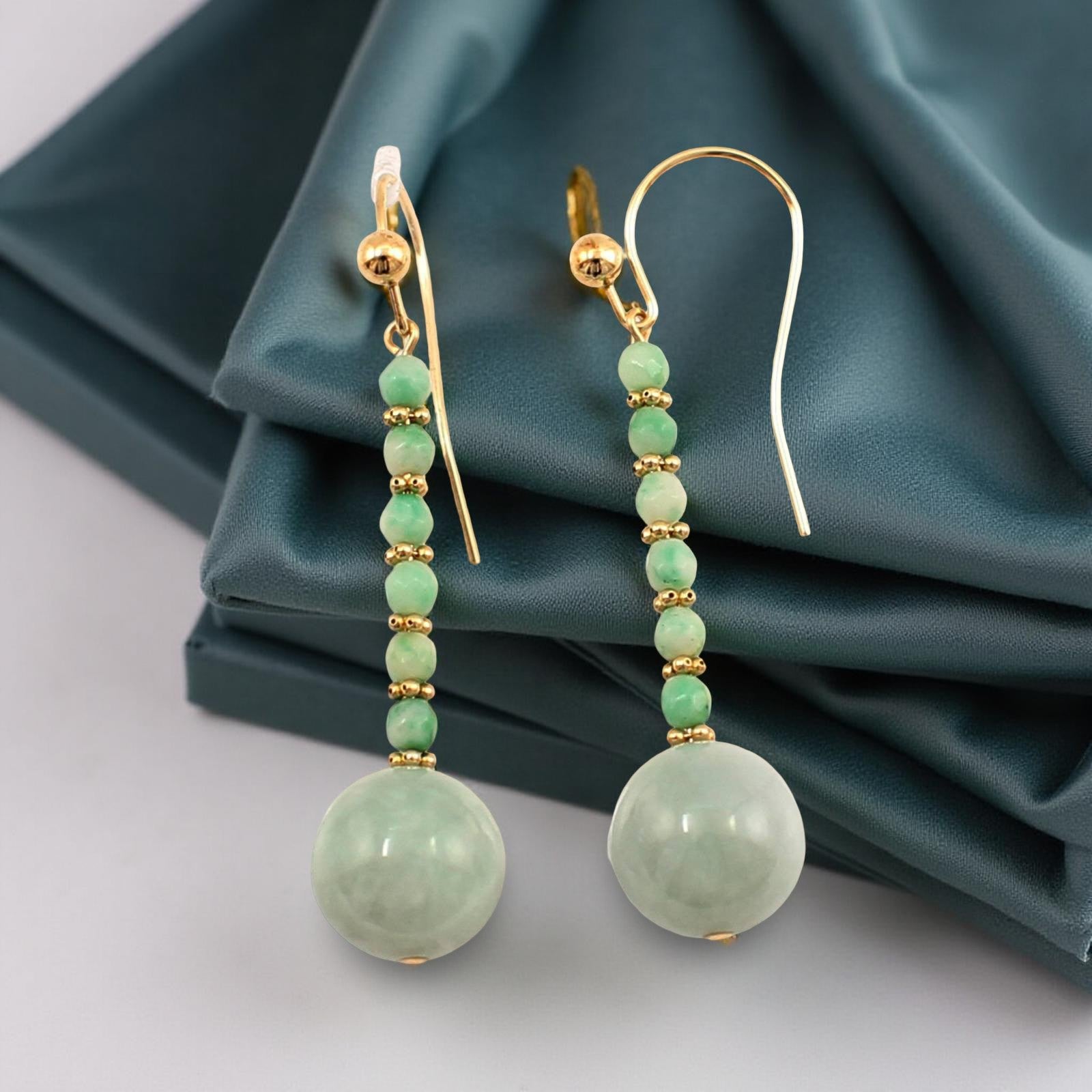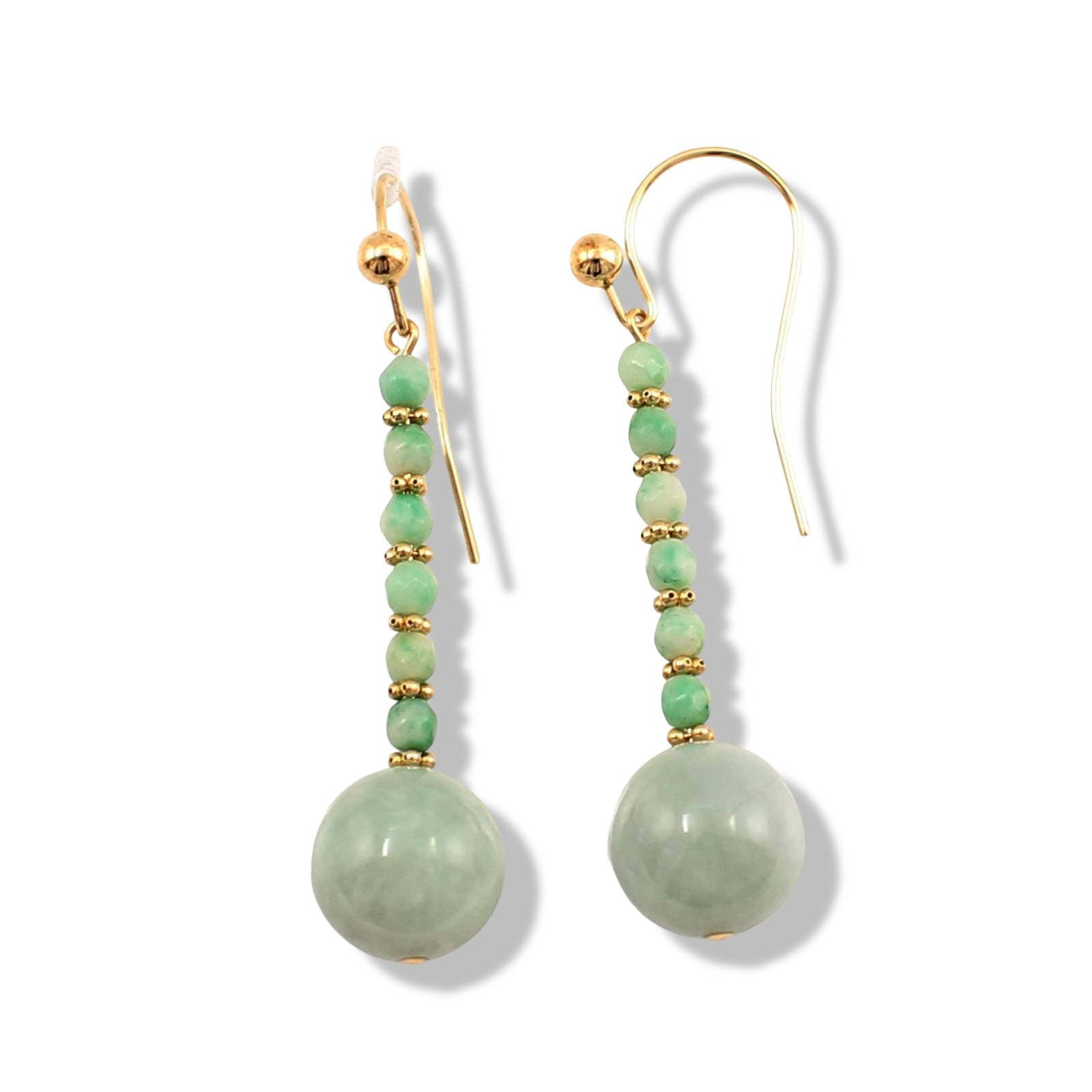 These handmade 14K yellow gold earrings feature celadon green jadeite beads on a classic fish hook setting, perfect for an elegant and unique look, designed for comfort and dependable daily wear.