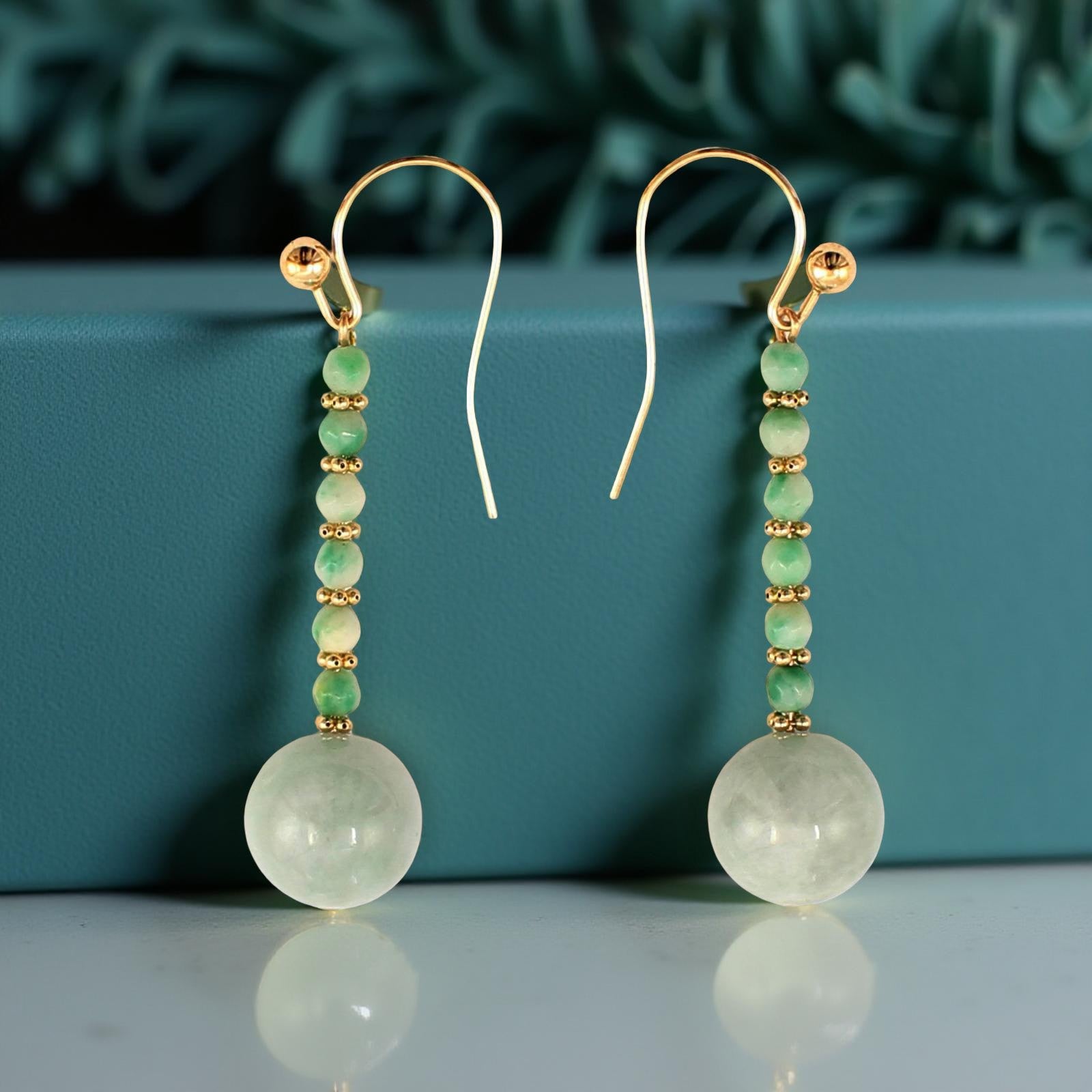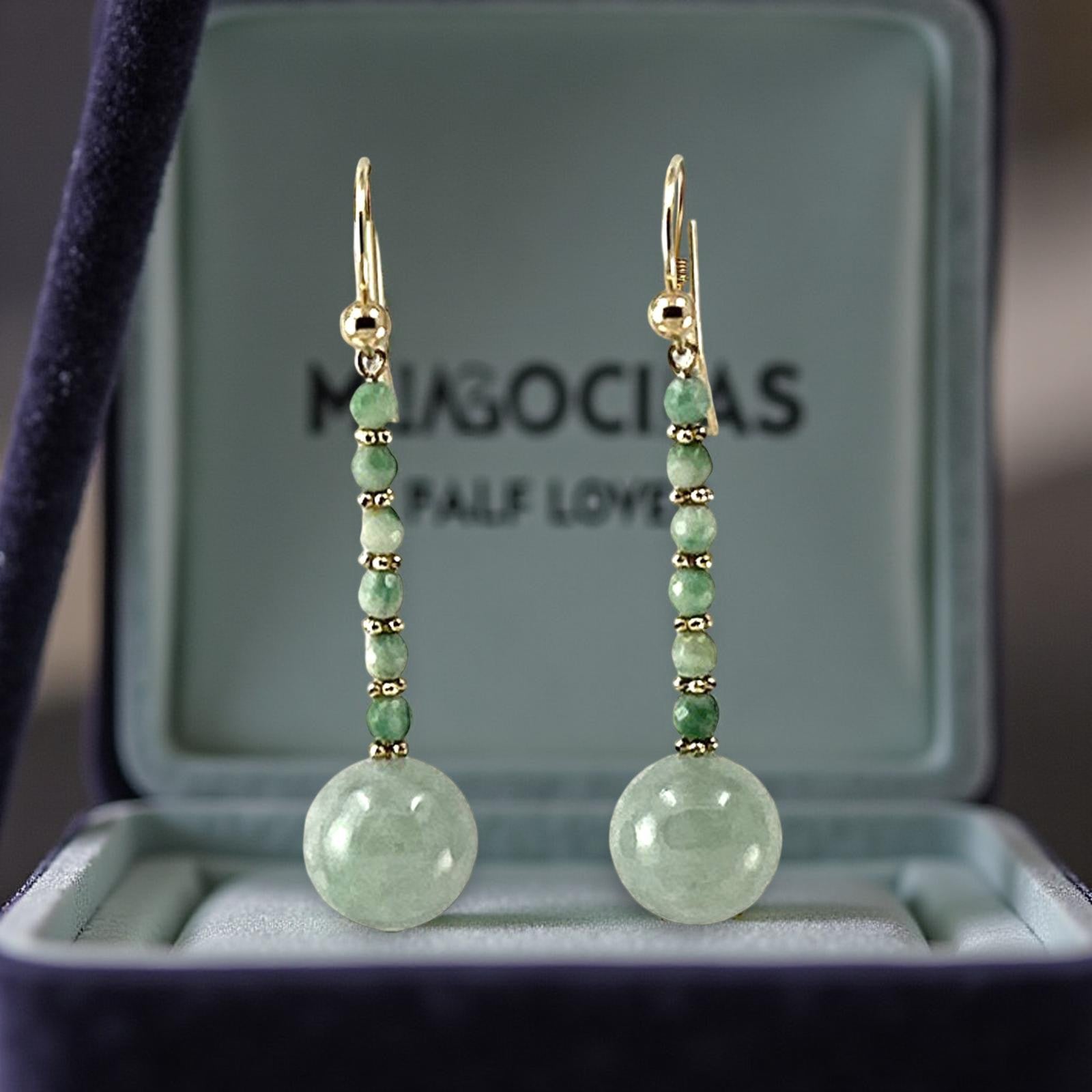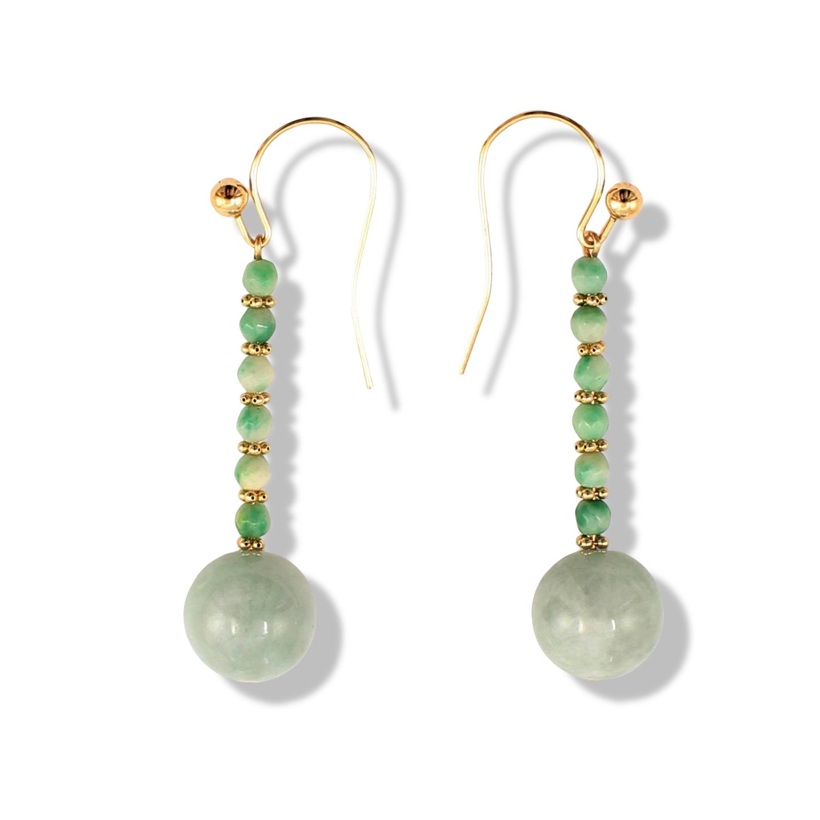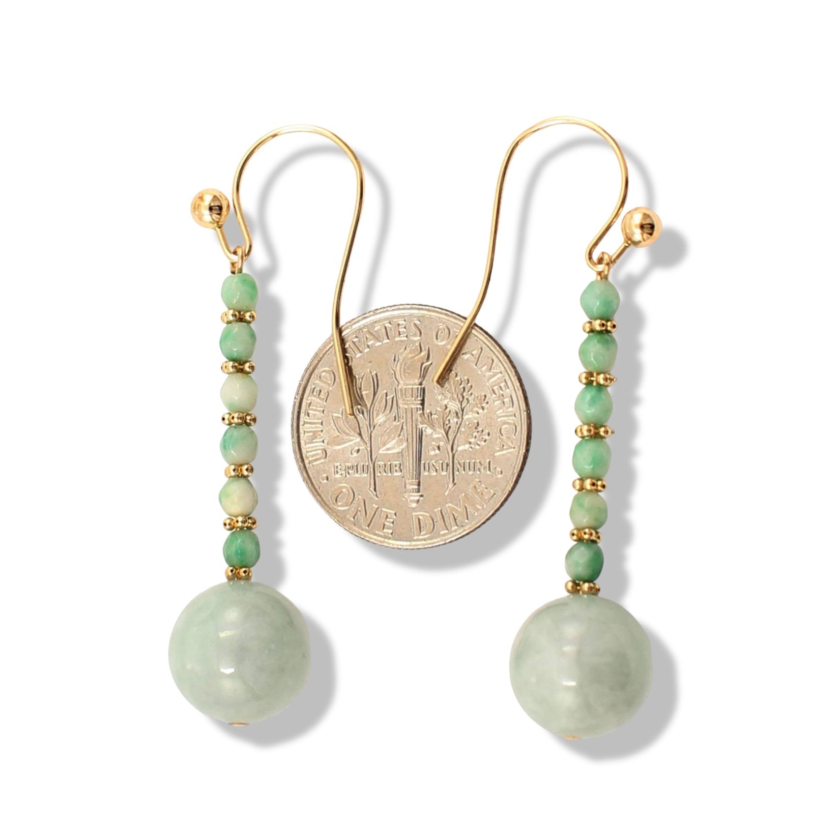 These handmade 14K yellow gold earrings feature celadon green jadeite beads on a classic fish hook setting, perfect for an elegant and unique look, designed for comfort and dependable daily wear.