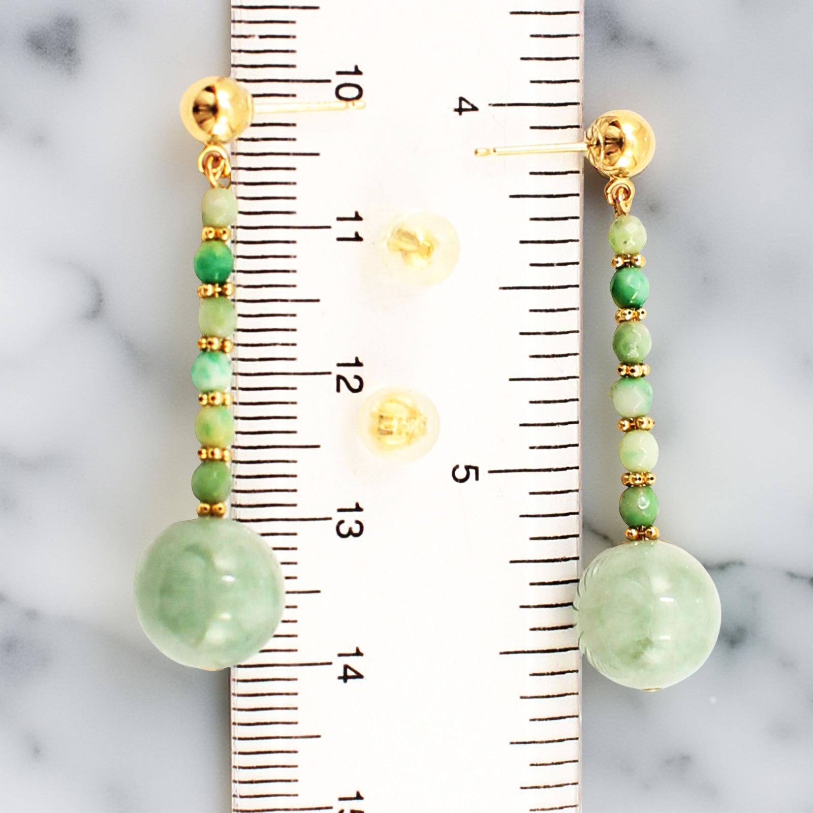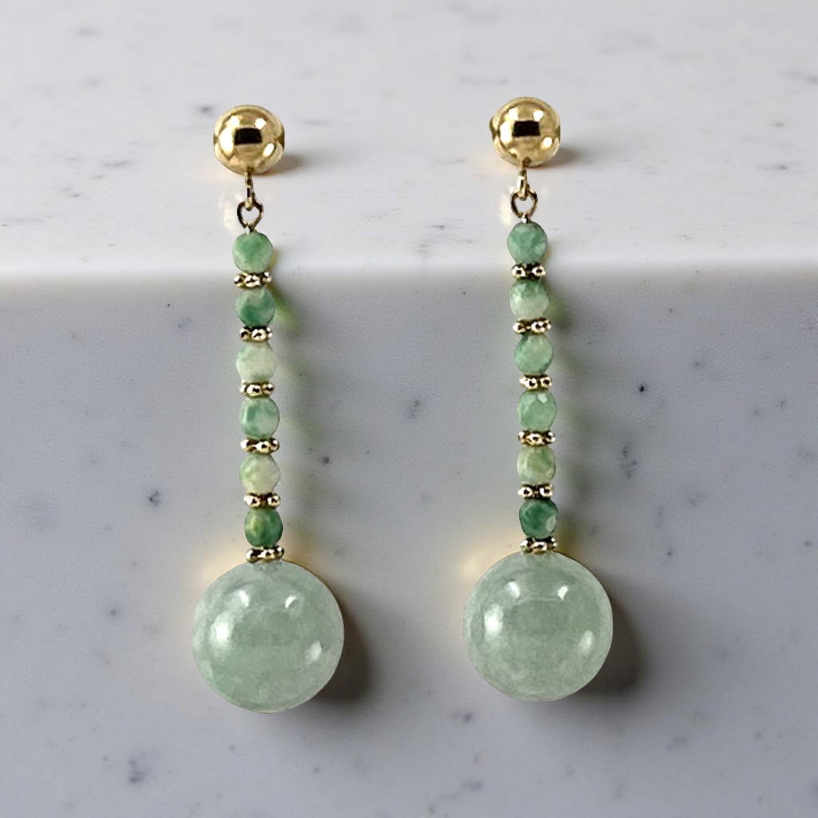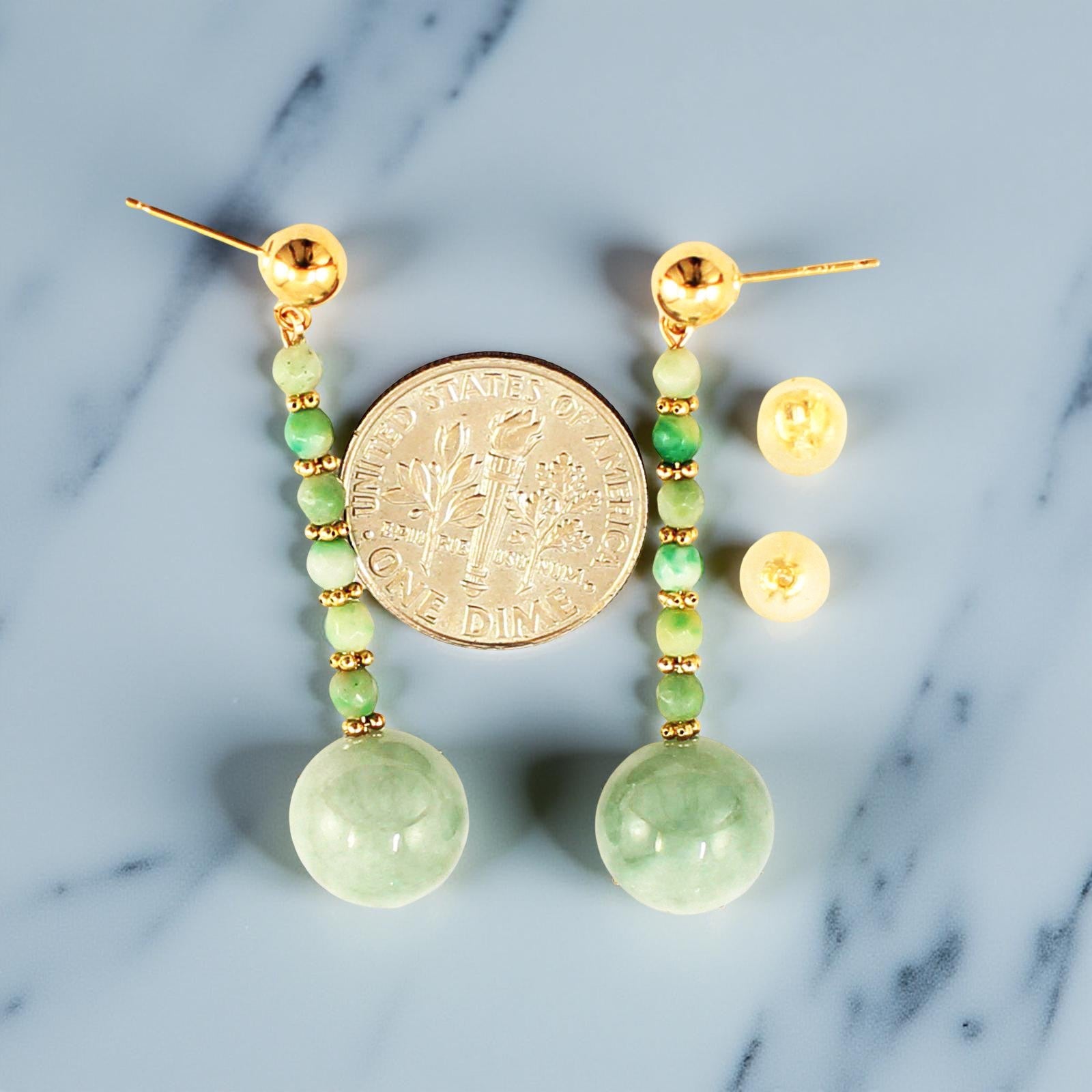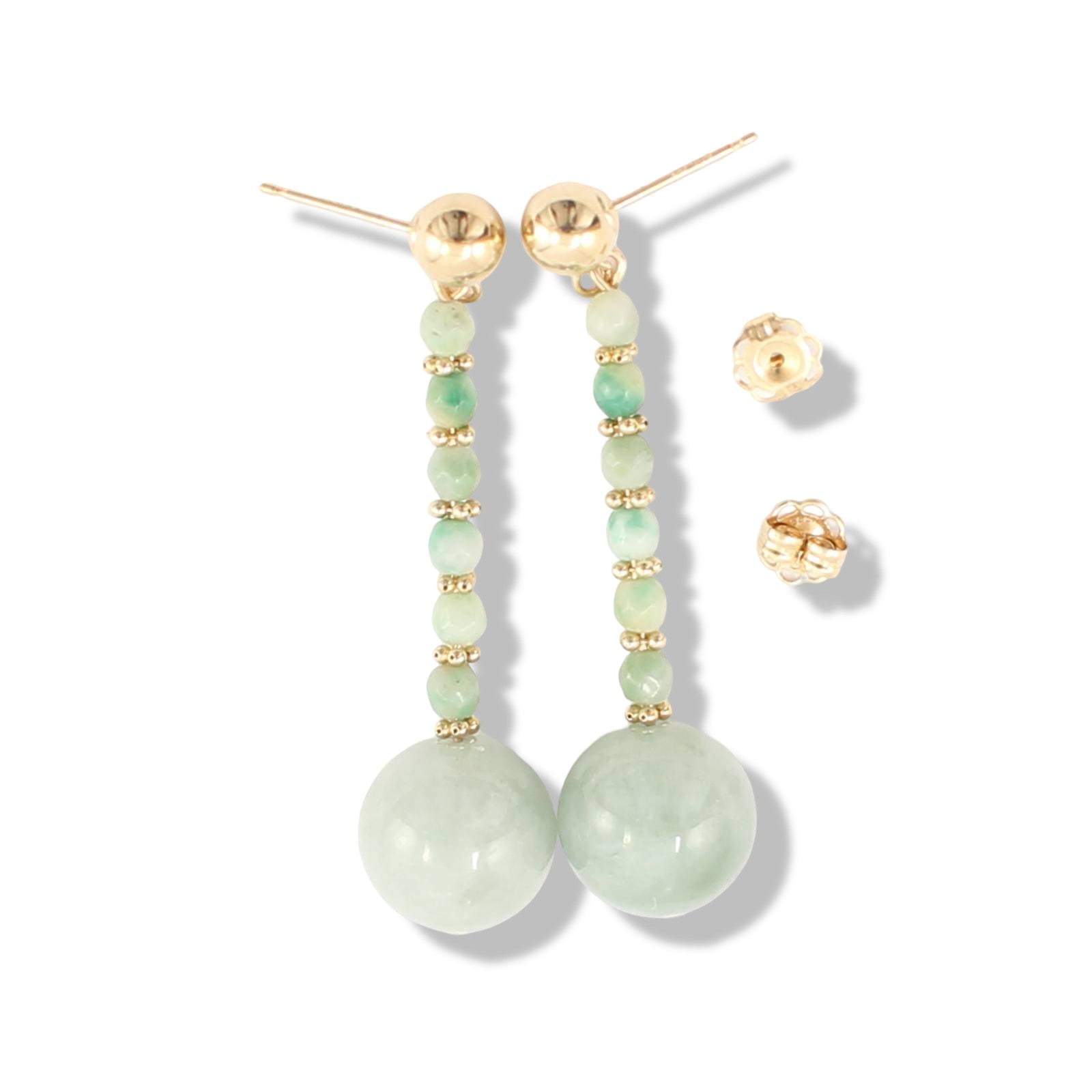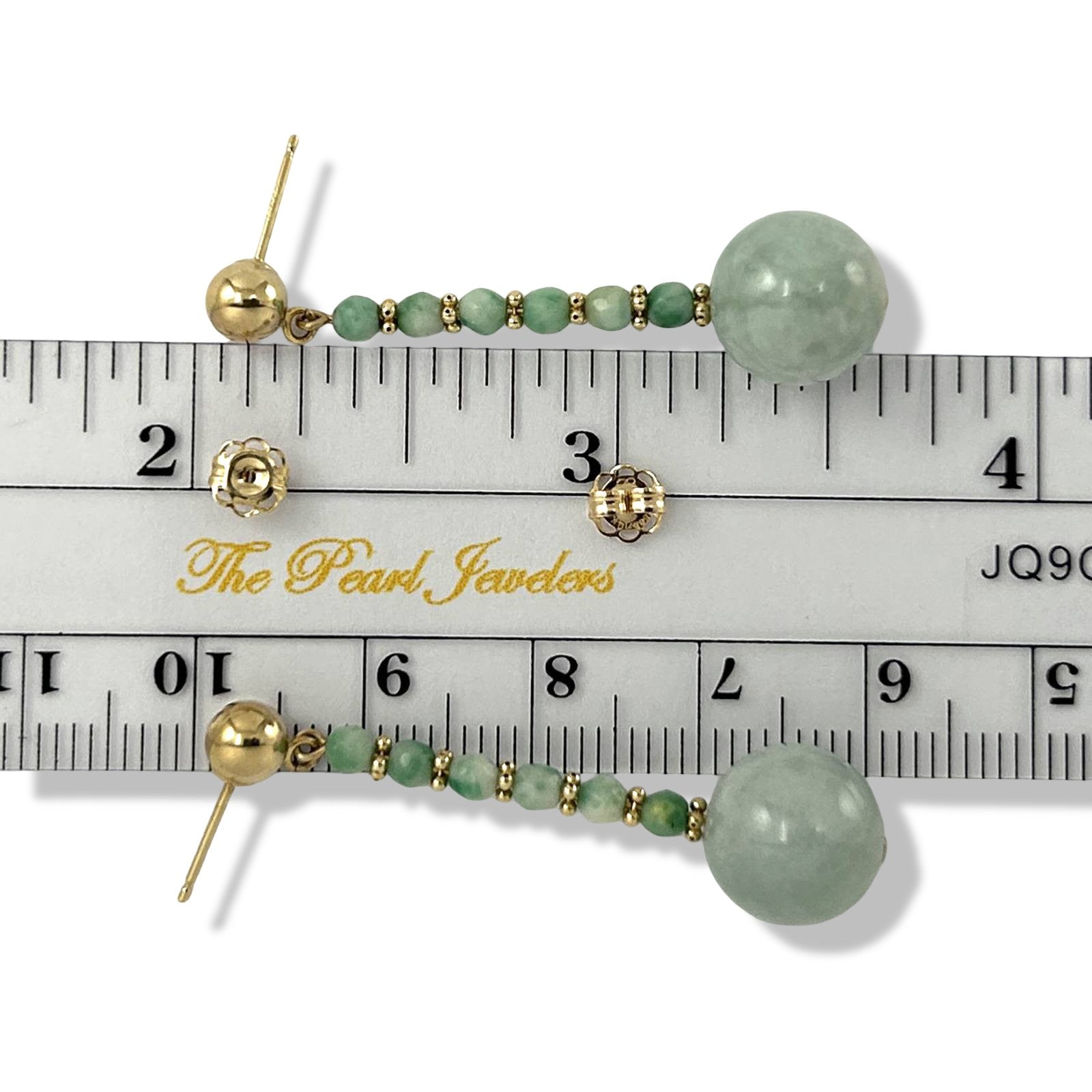 Handcrafted in 14K yellow gold, these dangle earrings feature celadon green jadeite beads, adding a touch of elegance to any look, designed for comfort and dependable daily wear.