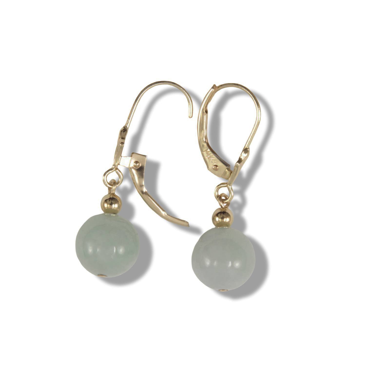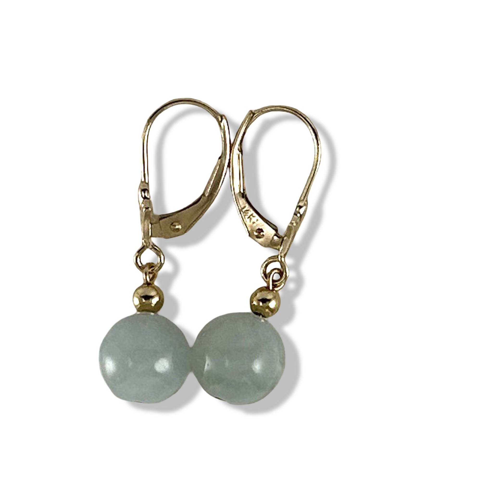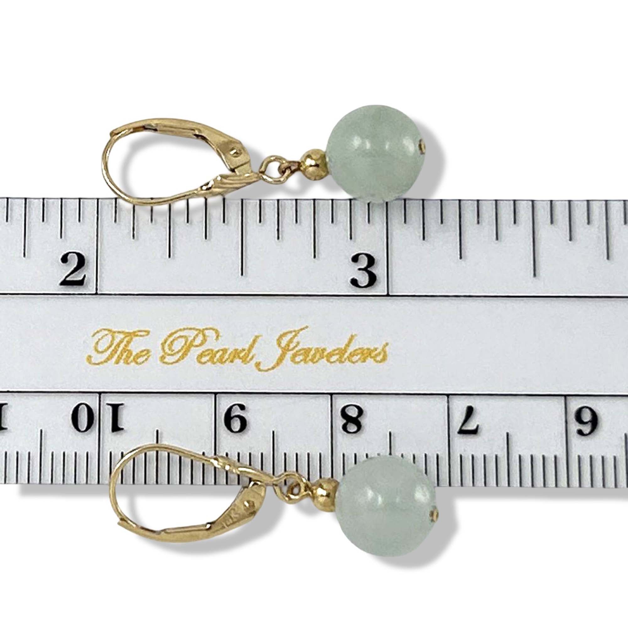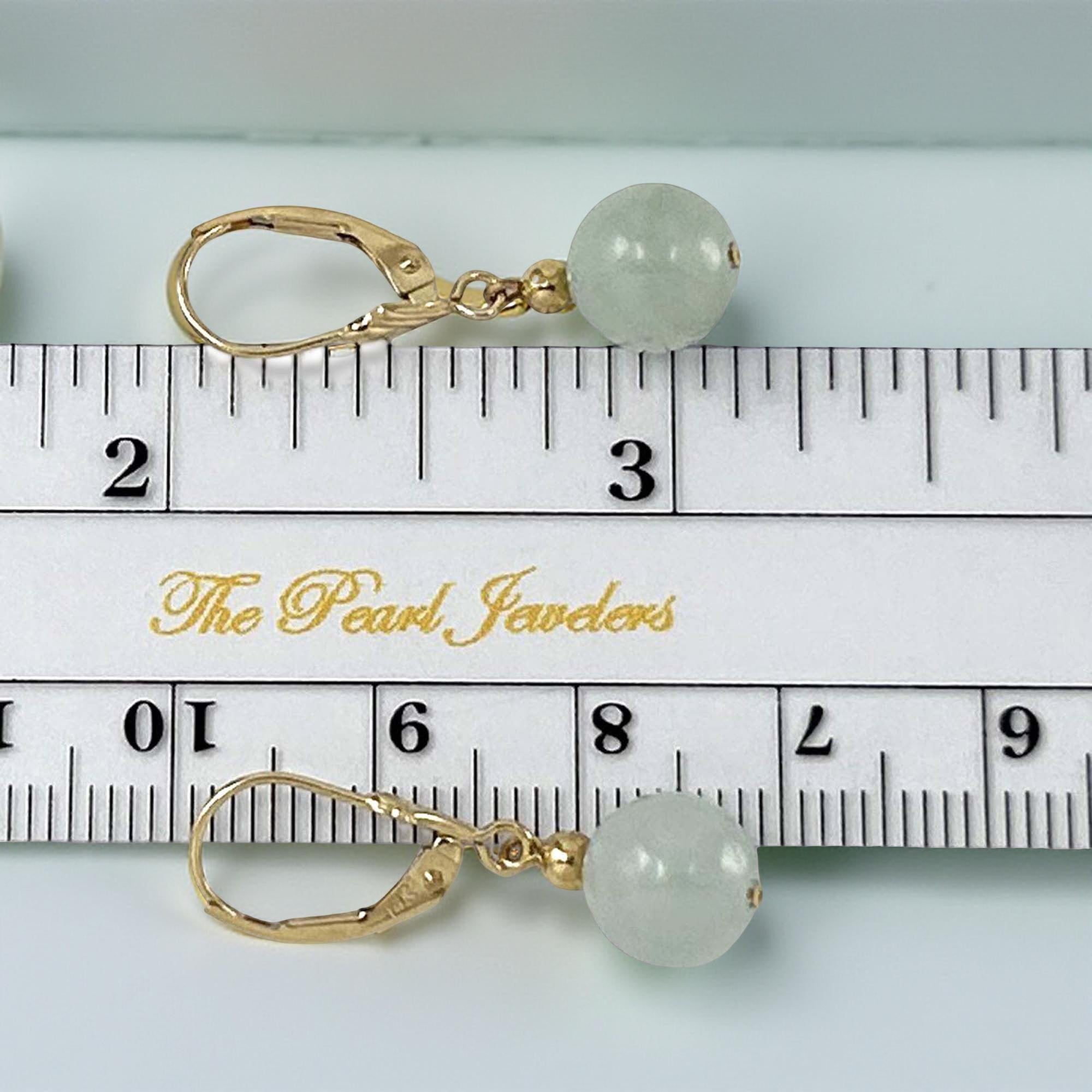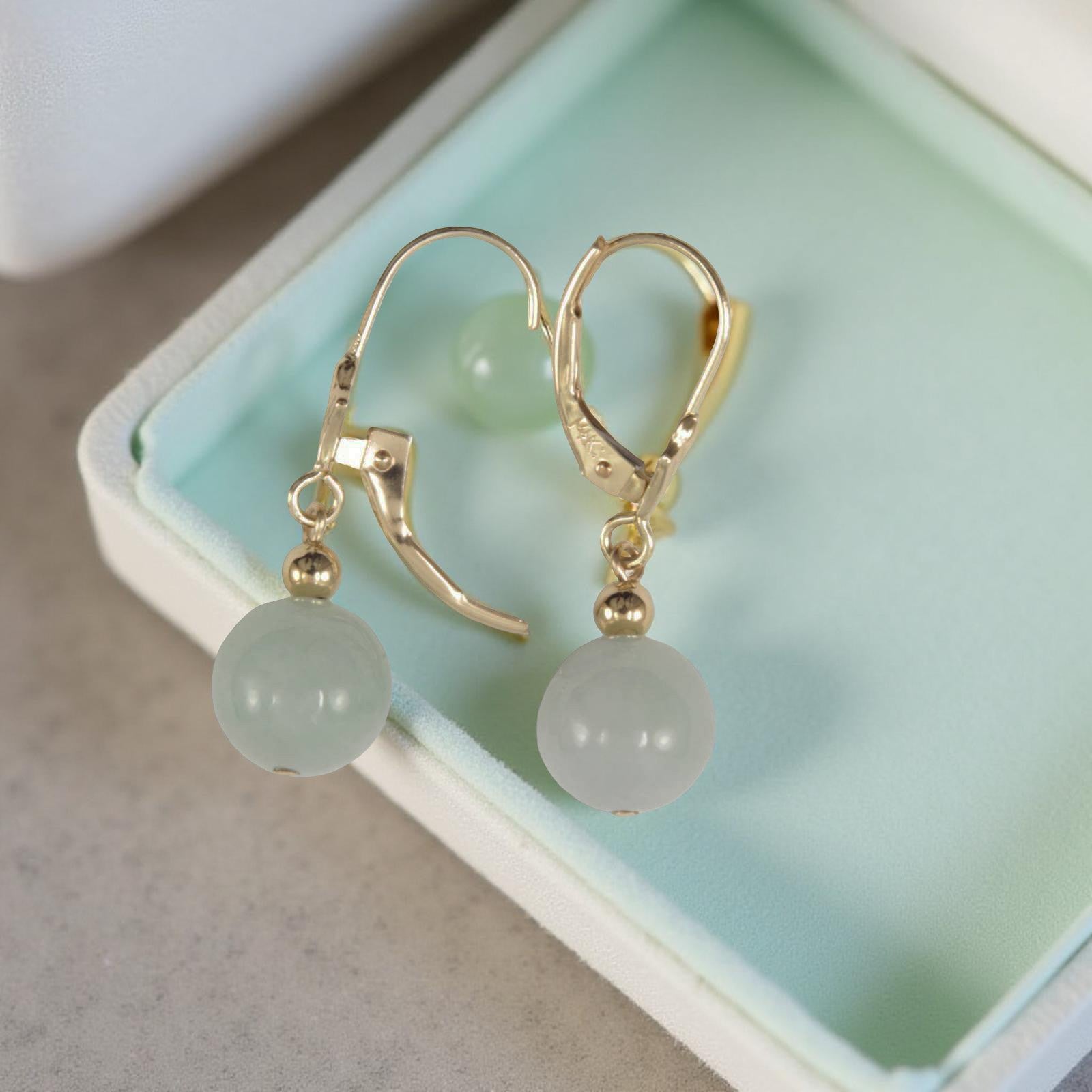 These elegant drop earrings feature 8.5mm round bean-green jade gemstones set in 14K yellow gold leverbacks, adding a sophisticated touch to any outfit, designed for comfort and dependable daily wear.
