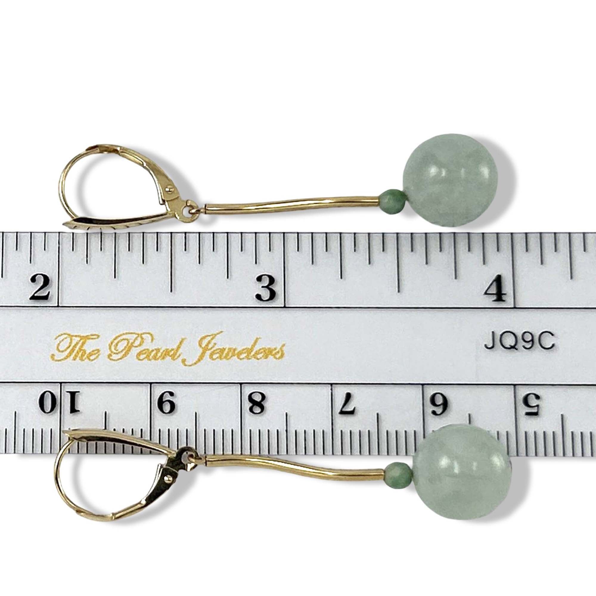 These handcrafted dangle earrings feature celadon green jadeite beads suspended from a 14K yellow gold euro back design, blending timeless elegance with modern craftsmanship, designed for comfort and dependable daily wear.