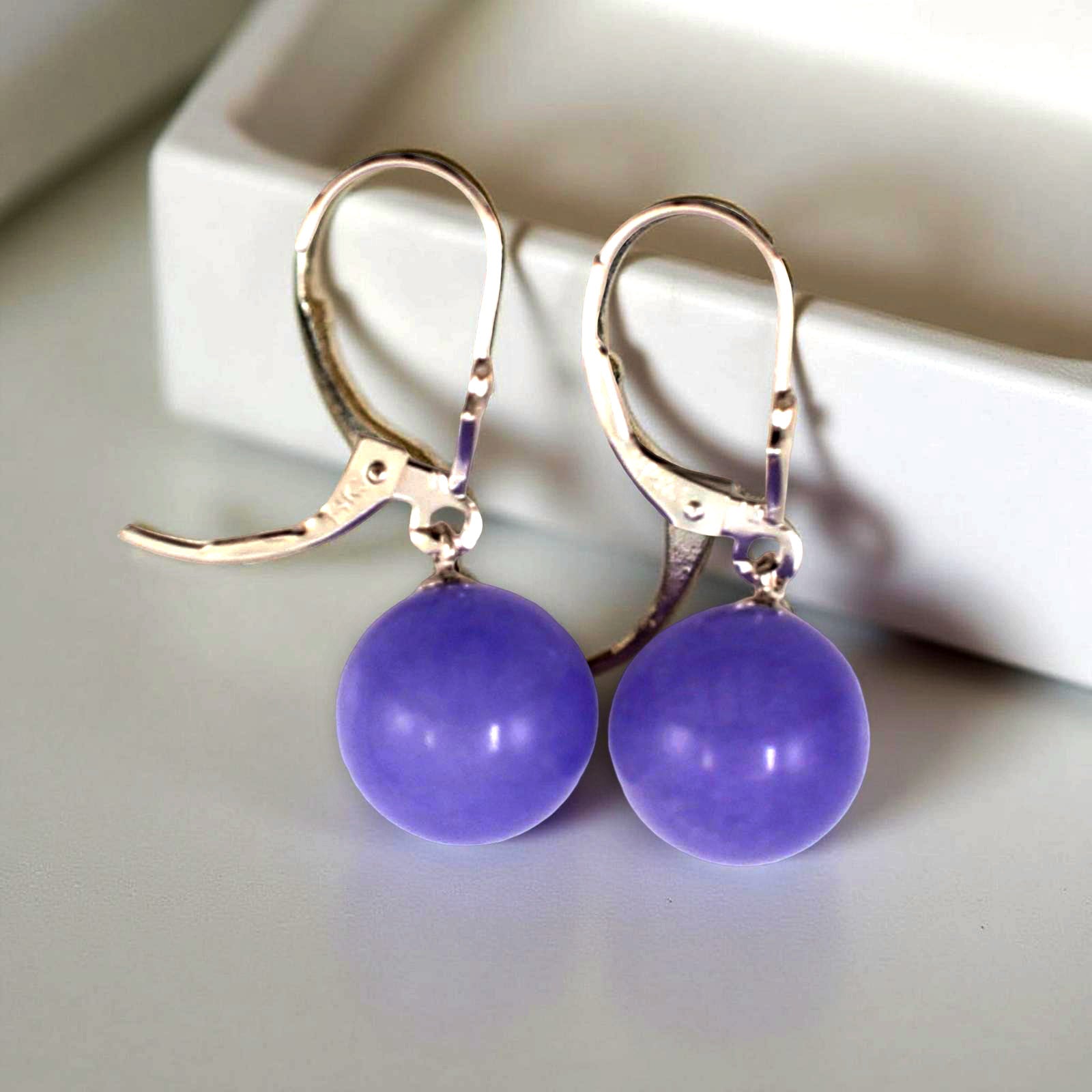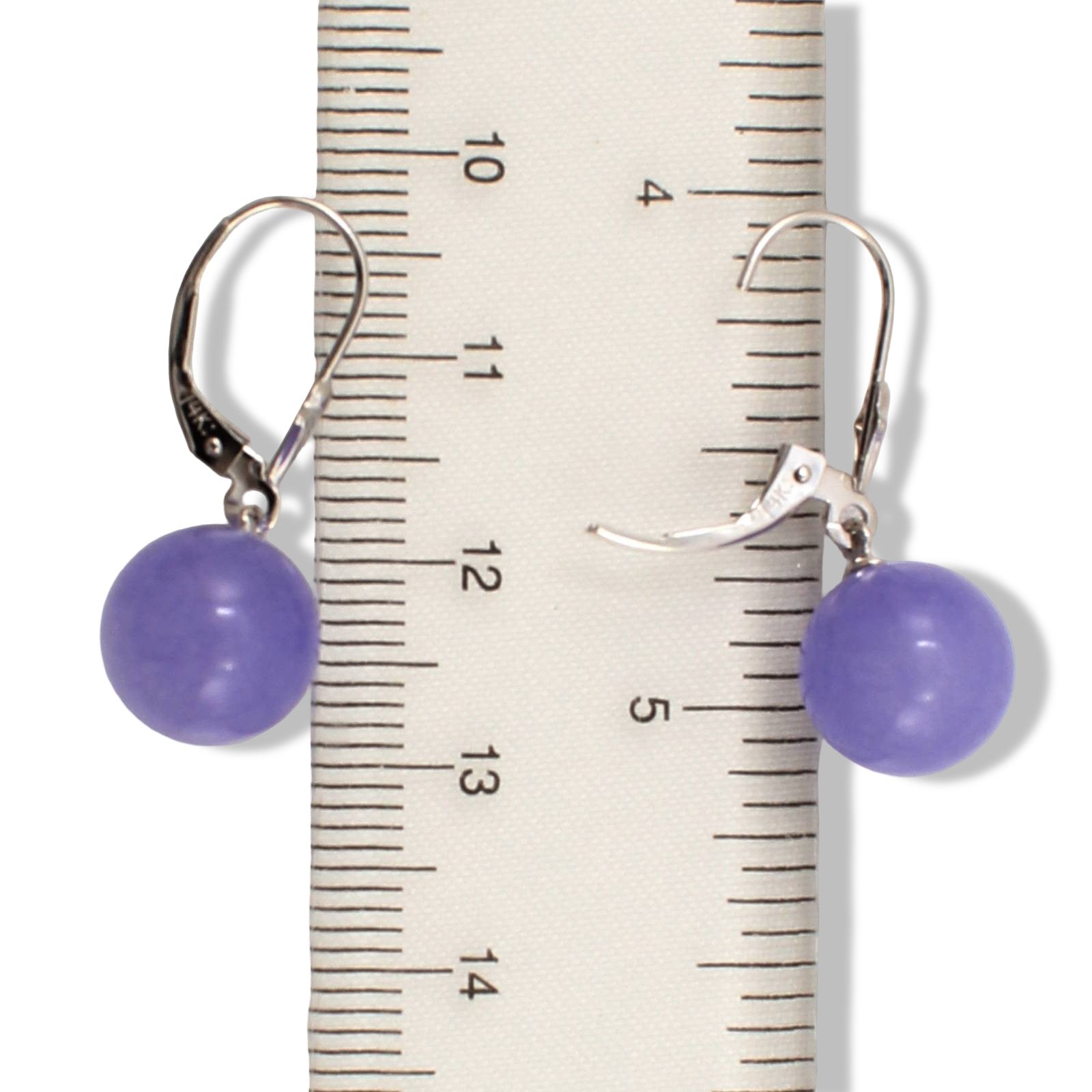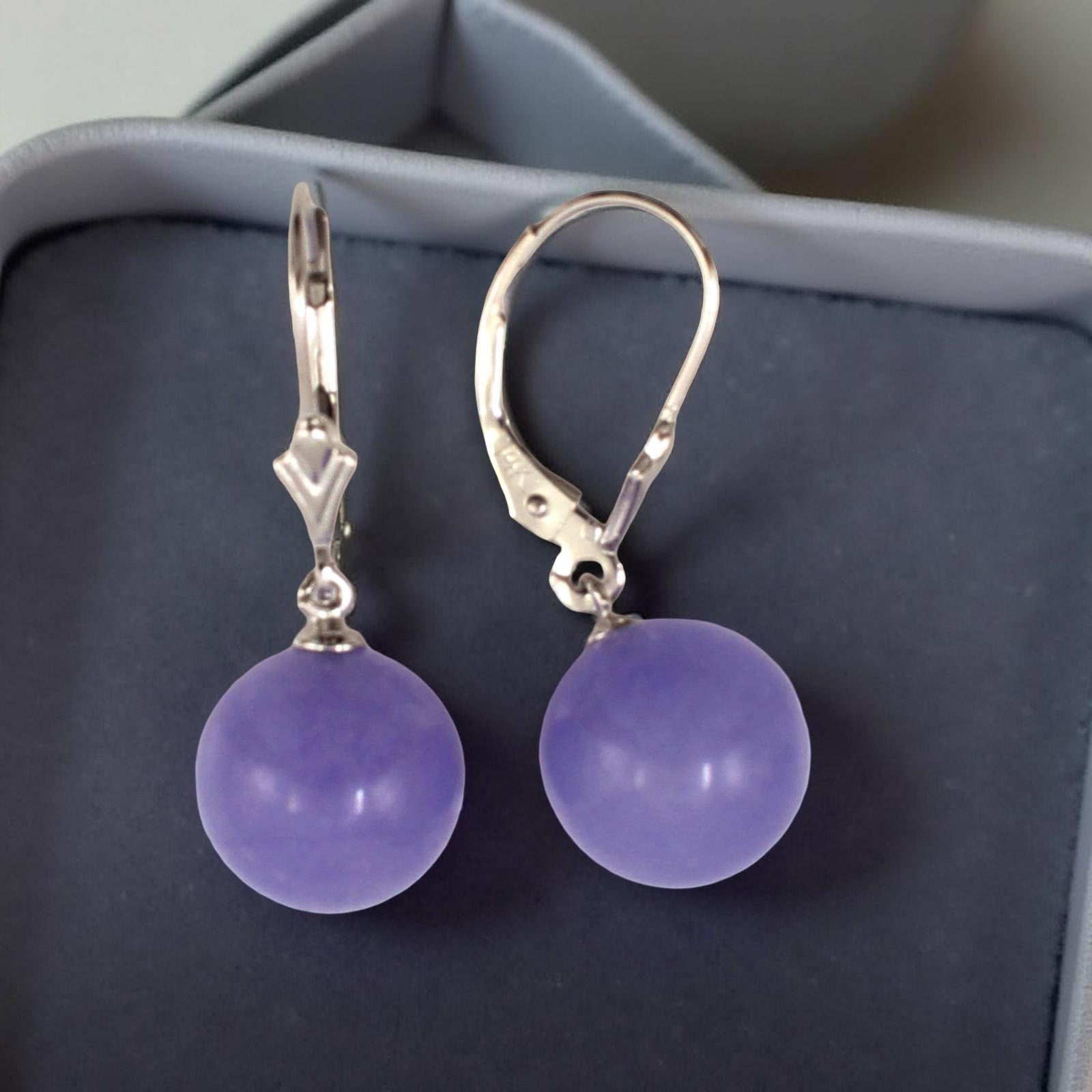 Designed for effortless elegance, these leverback earrings feature 10mm round lavender jade gemstones set in 14K white gold for a timeless look, designed for comfort and dependable daily wear.