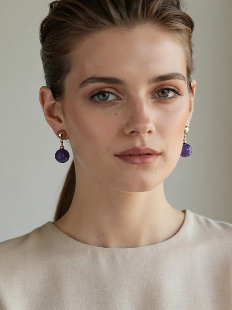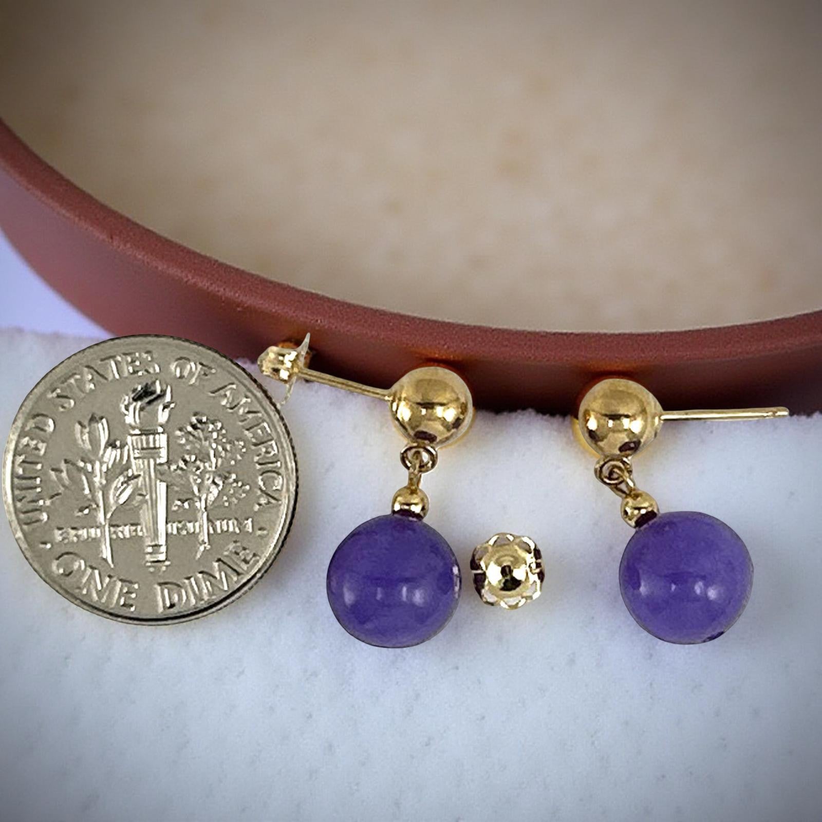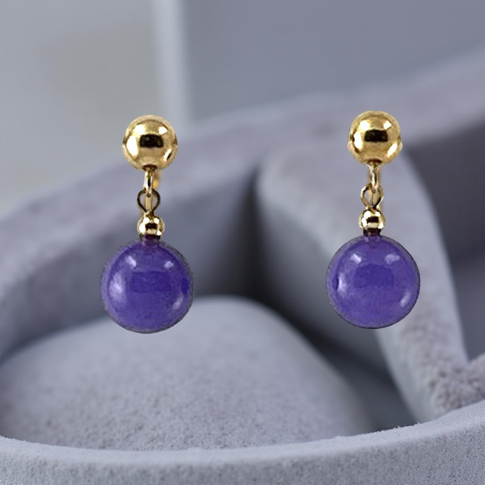 A classic post stud design, featuring a solid 14K gold ball with dangling purple jade beads for a timeless and elegant look, designed for comfort and dependable daily wear.