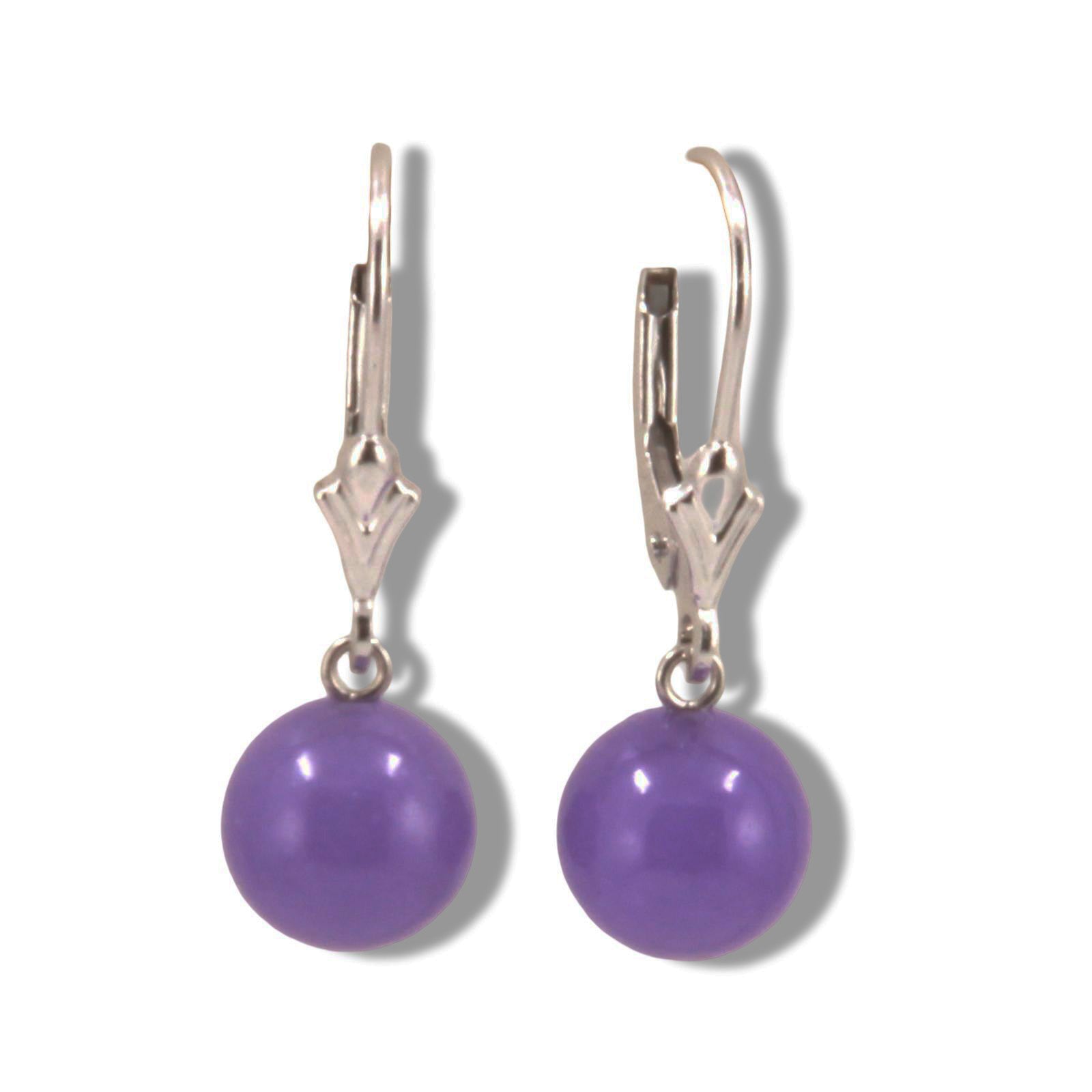 These 14K white gold leverback earrings feature beautiful lavender jade round beads, symbolizing peace and prosperity, designed for comfort and dependable daily wear.