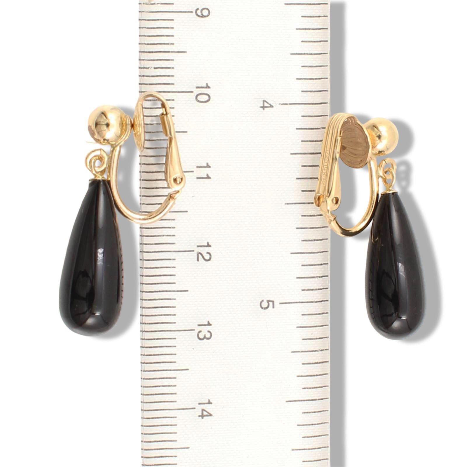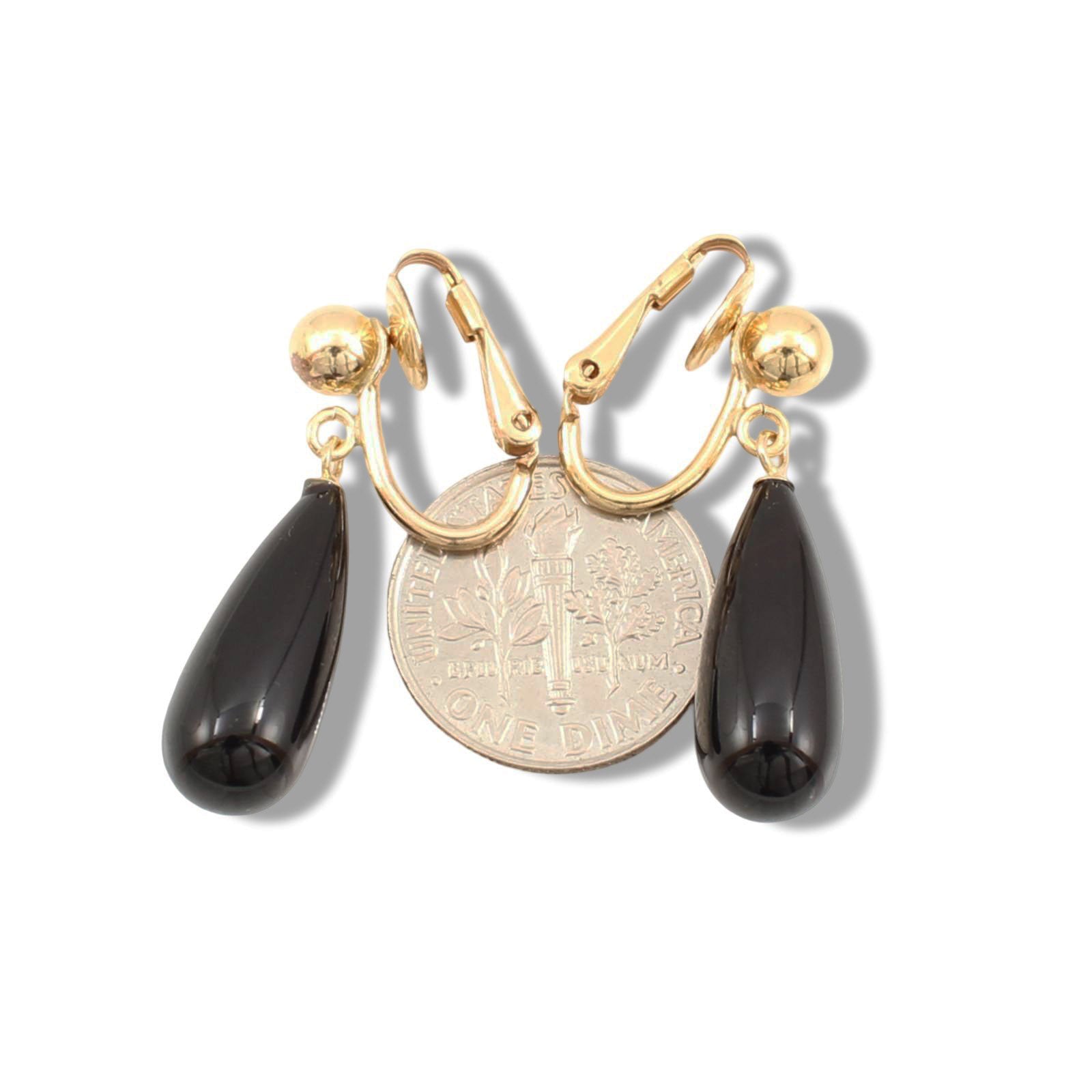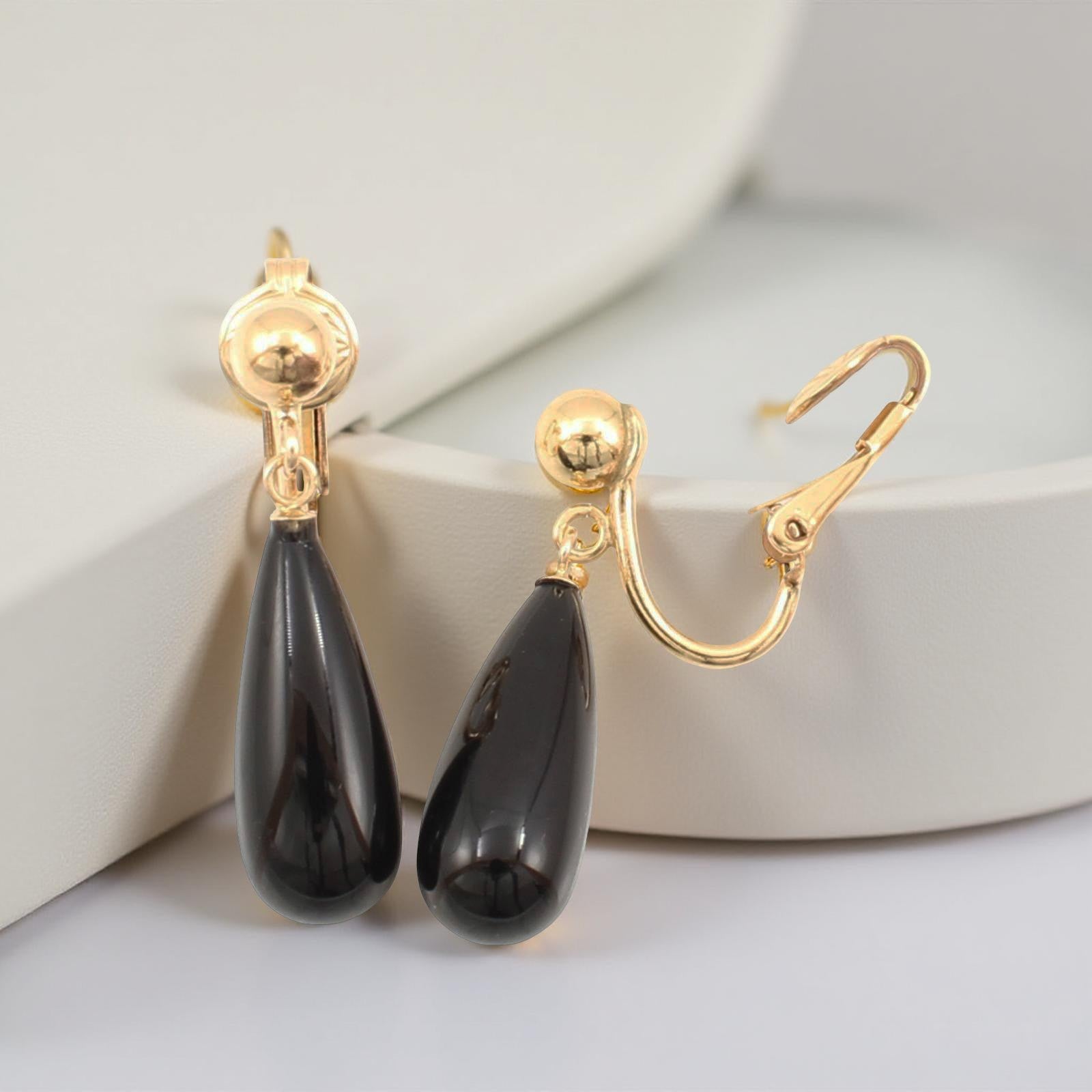 Designed for non-pierced ears, these black onyx raindrop earrings, set in gold-filled metal, offer elegance and versatility.