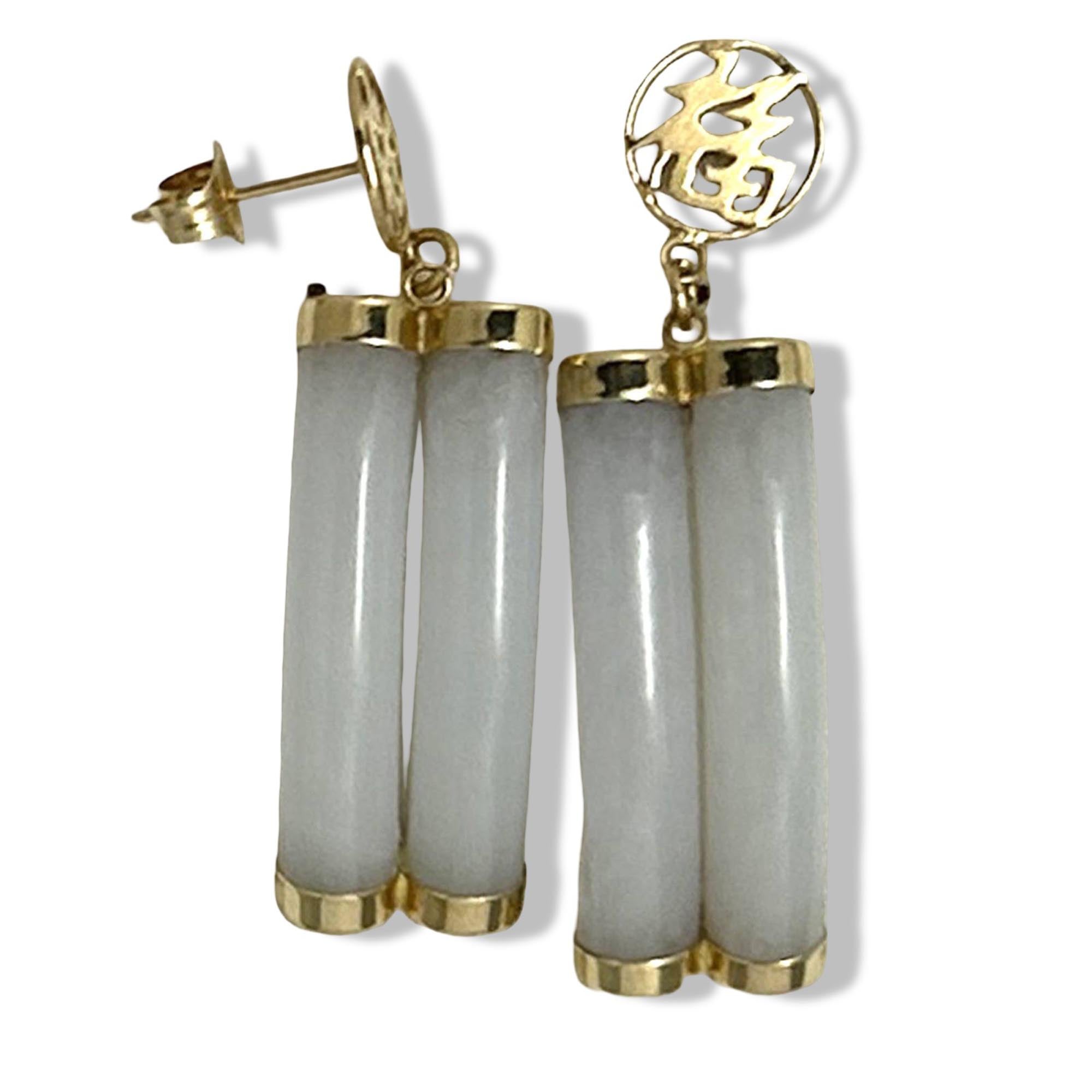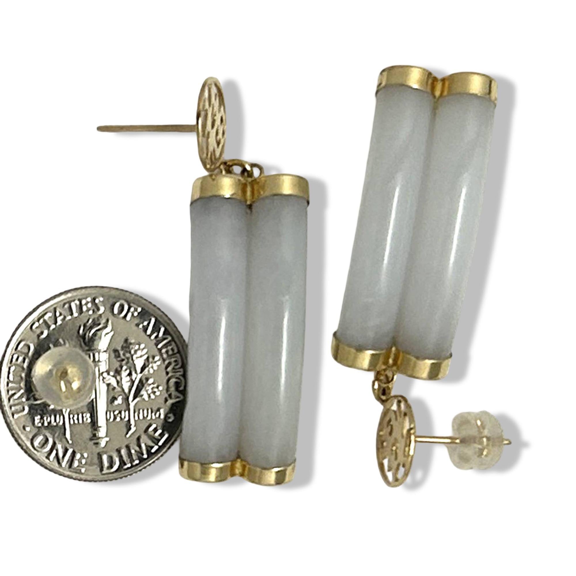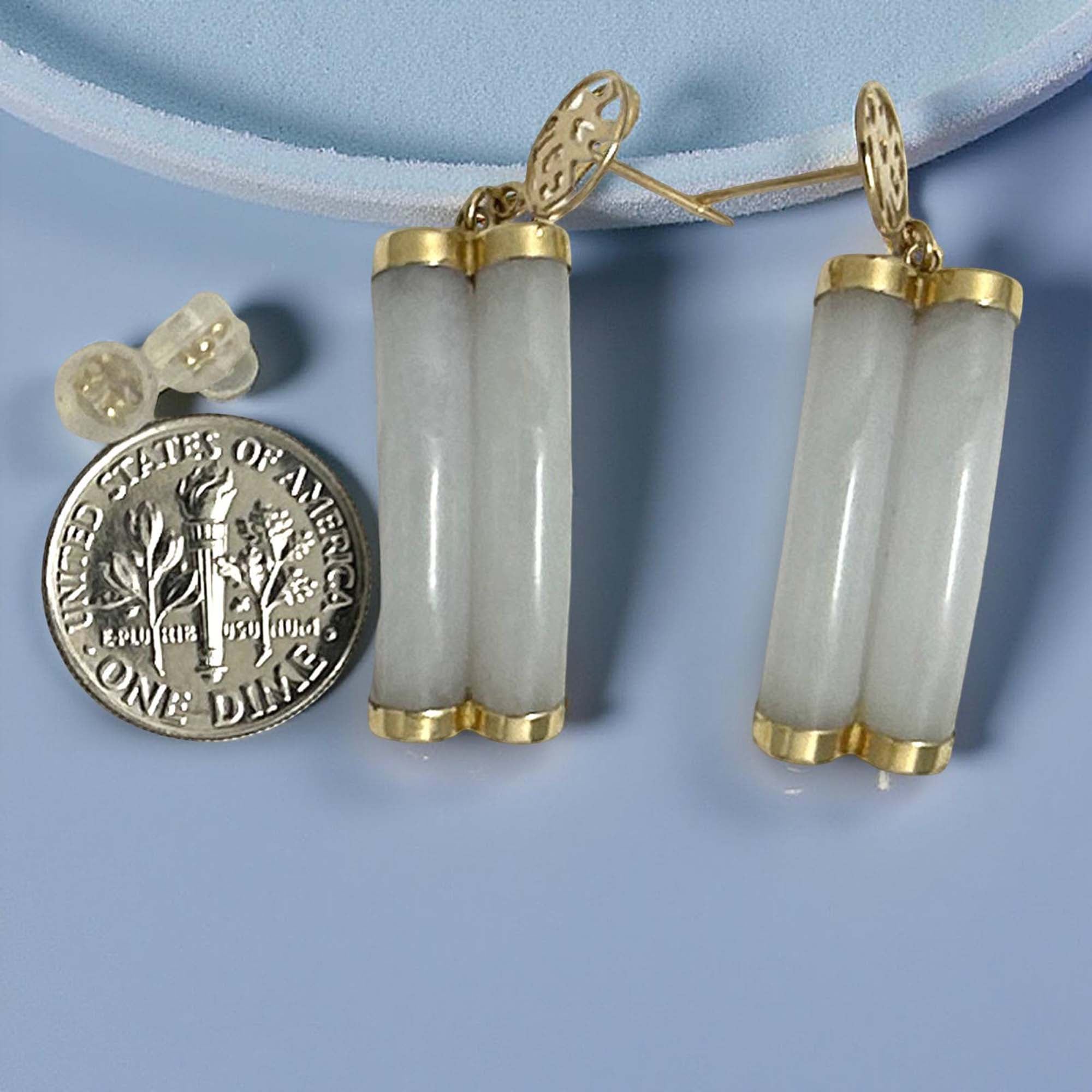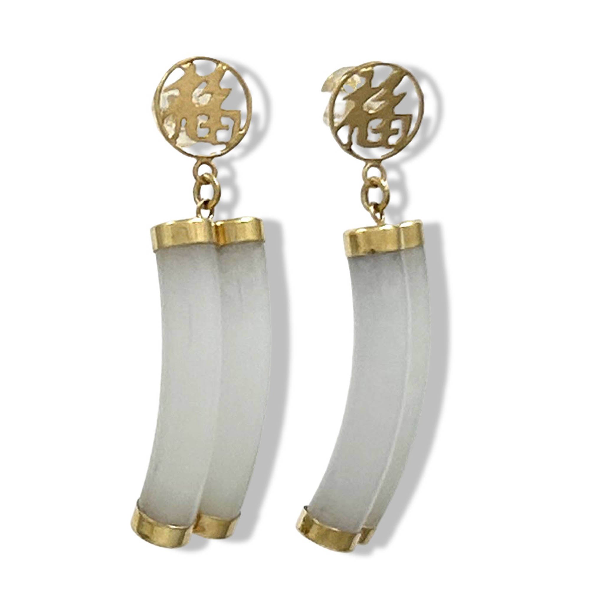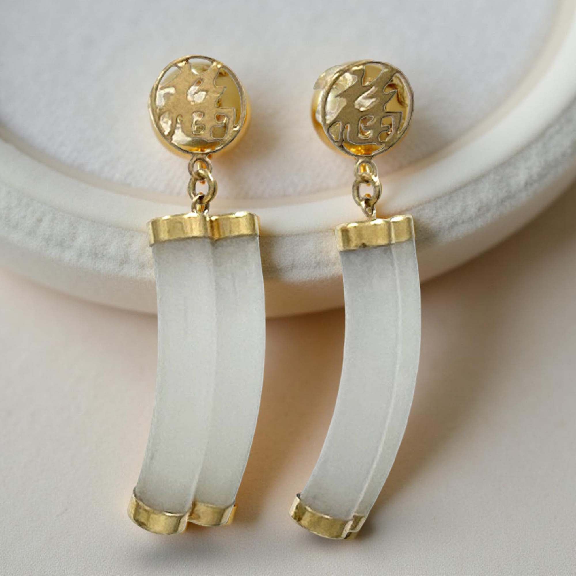 These handcrafted 14K gold earrings feature curve twin tube jadeite gemstones in celadon white, symbolizing luck and beauty. A perfect balance of tradition and modern elegance.