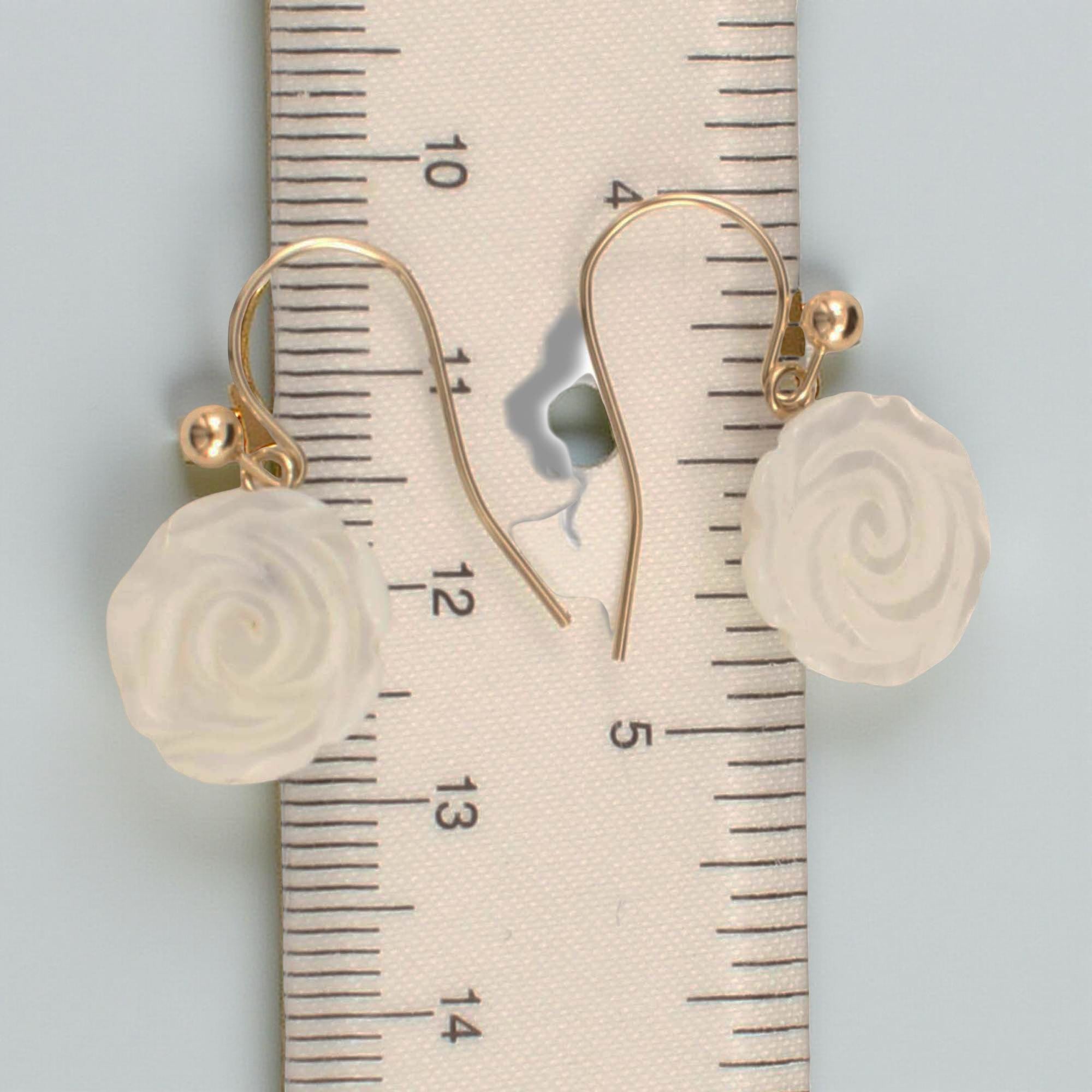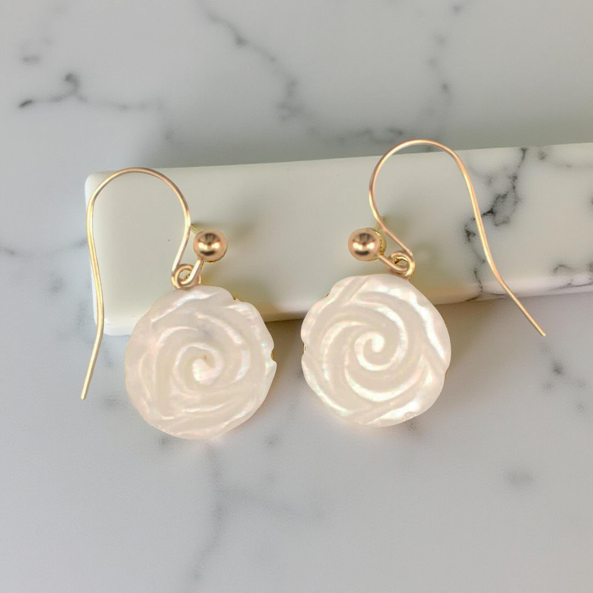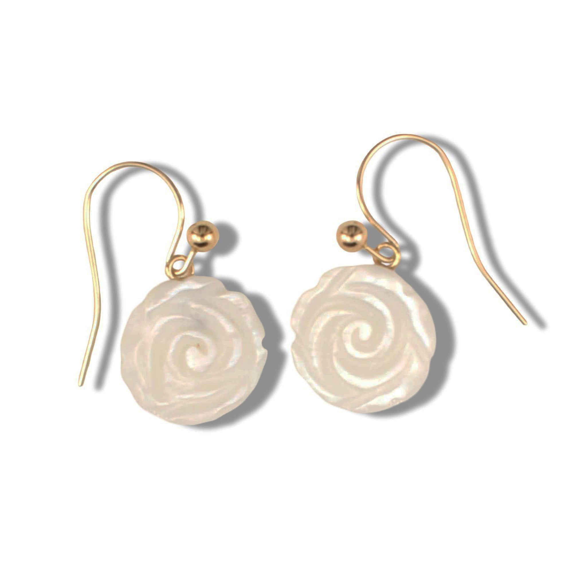 Designed for graceful elegance, these 14K yellow gold earrings feature a rose-shaped mother of pearl, symbolizing timeless beauty and sophistication.