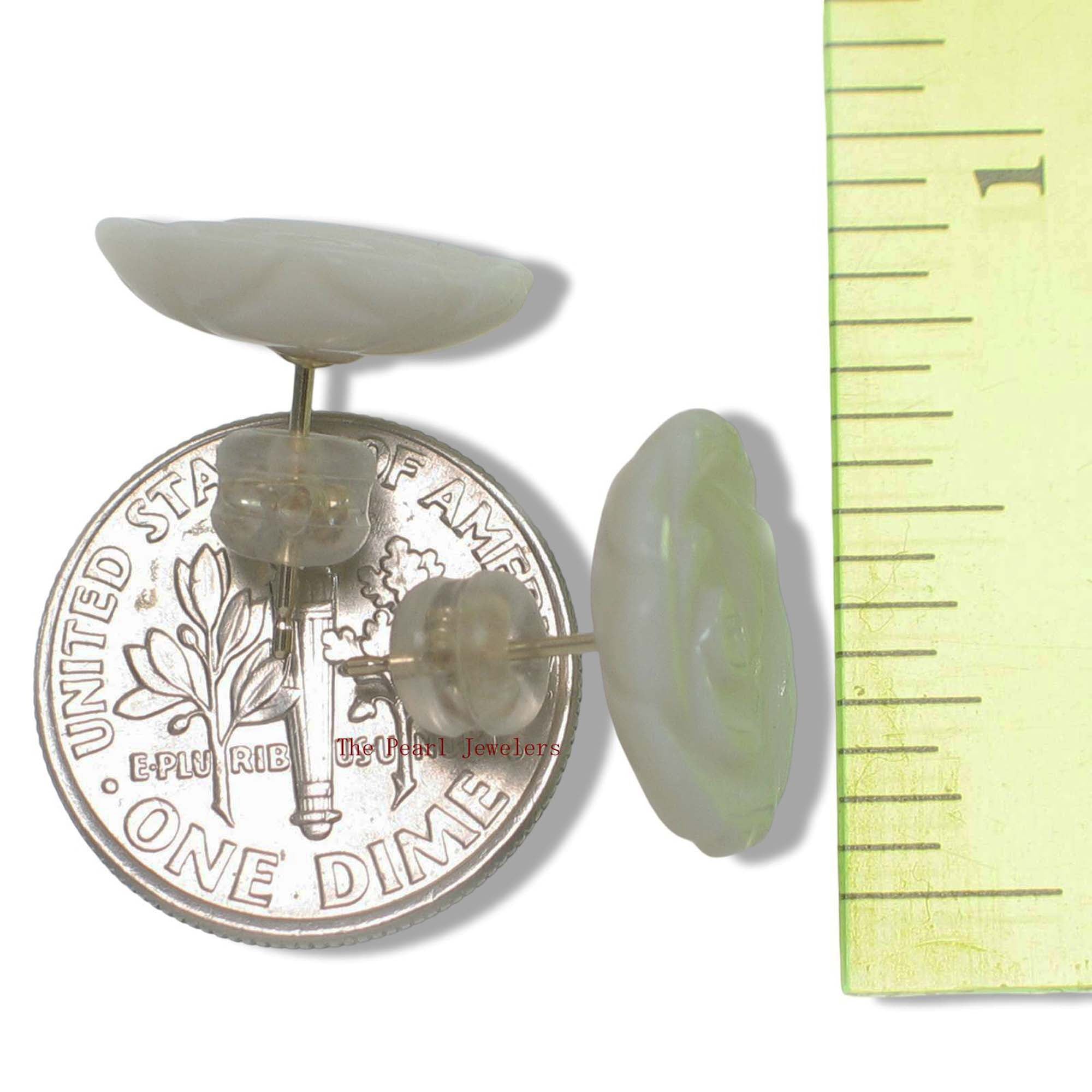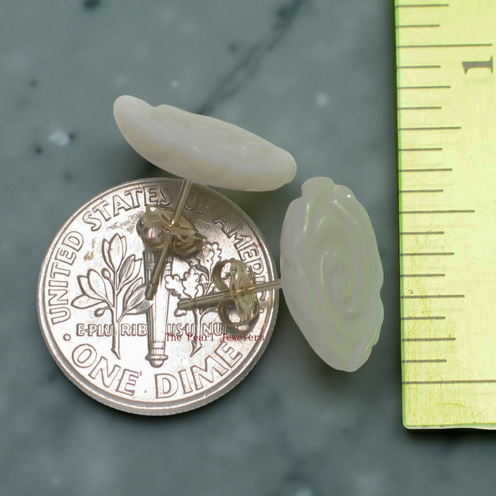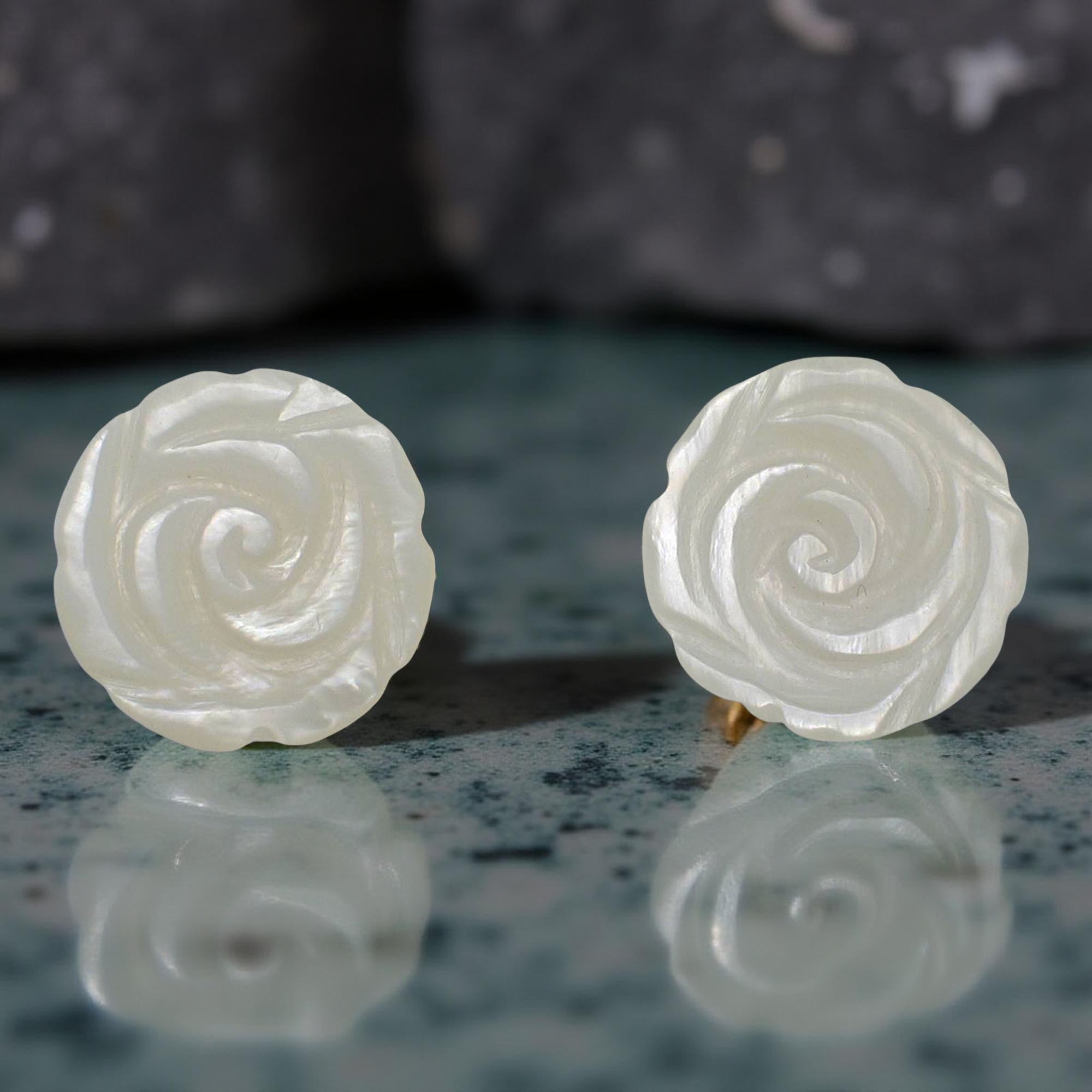 Featuring hand-carved mother of pearl roses, these 14K yellow gold earrings offer a timeless and elegant touch.