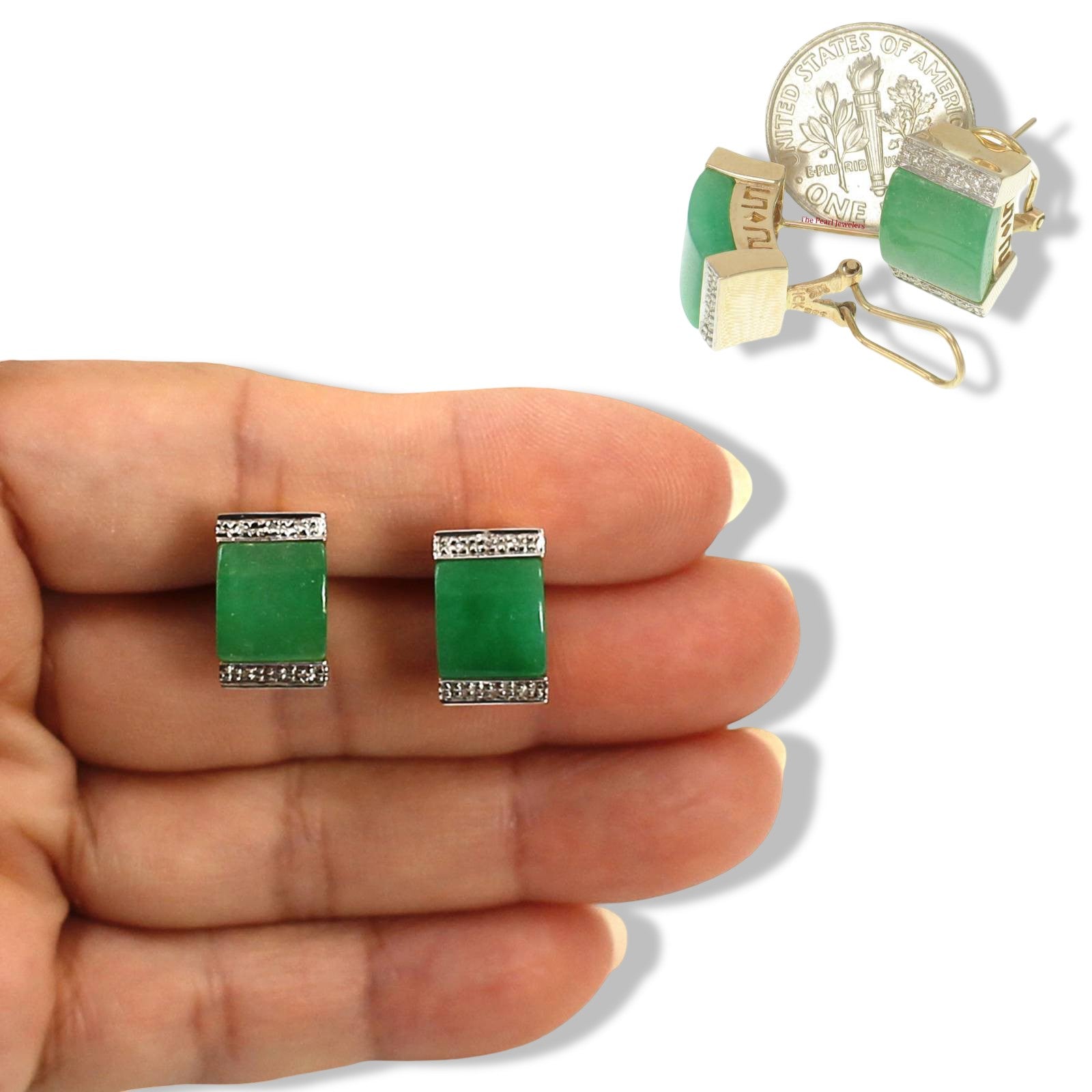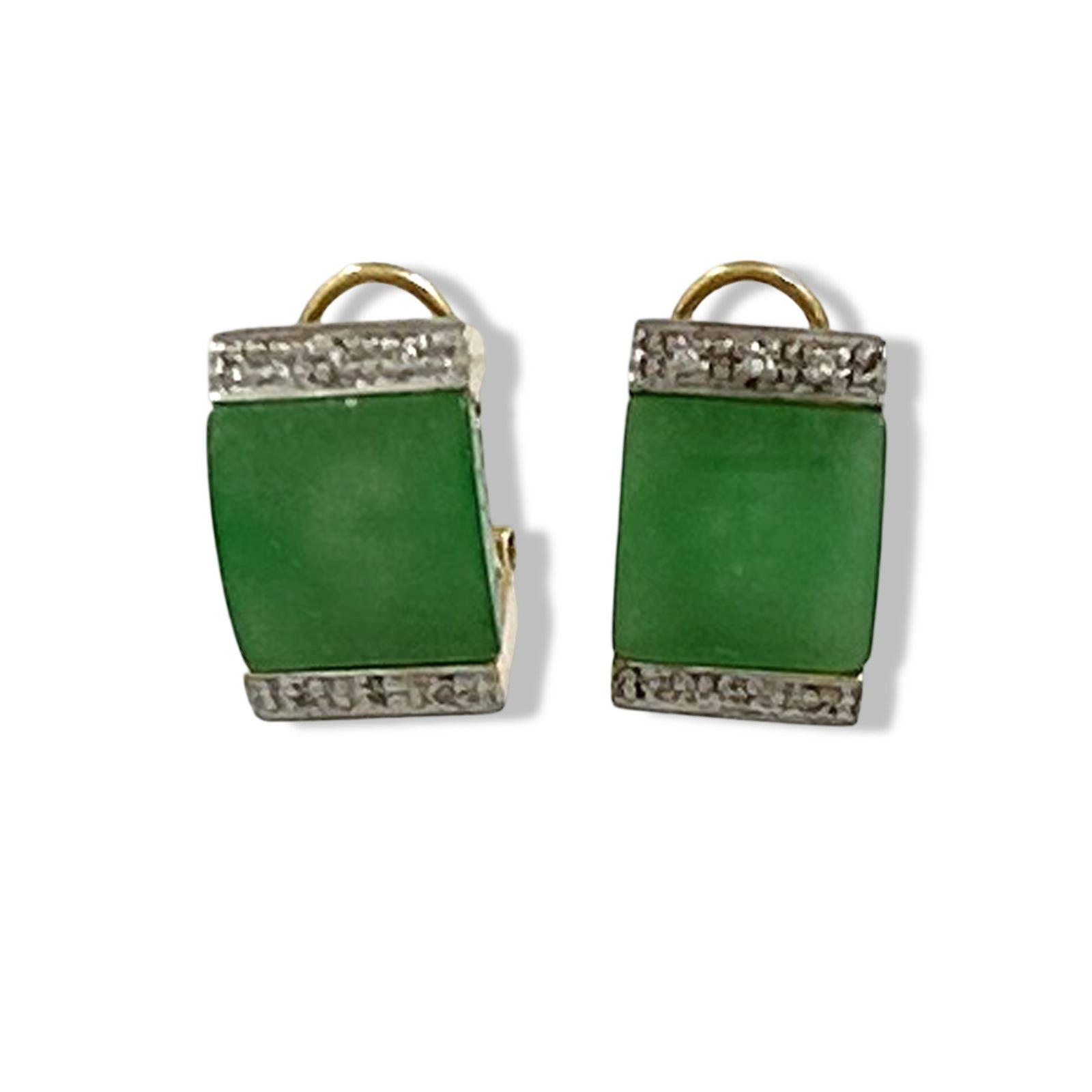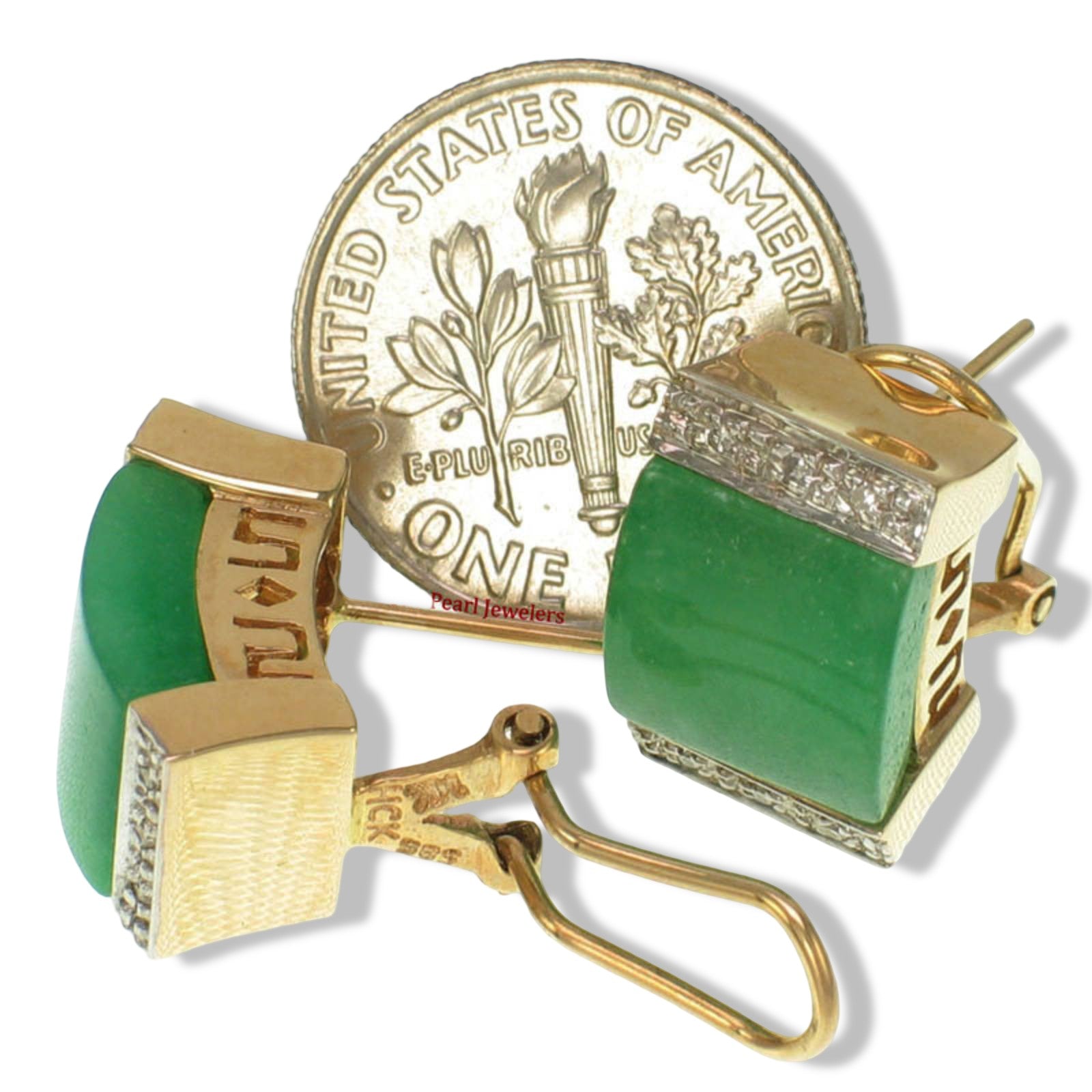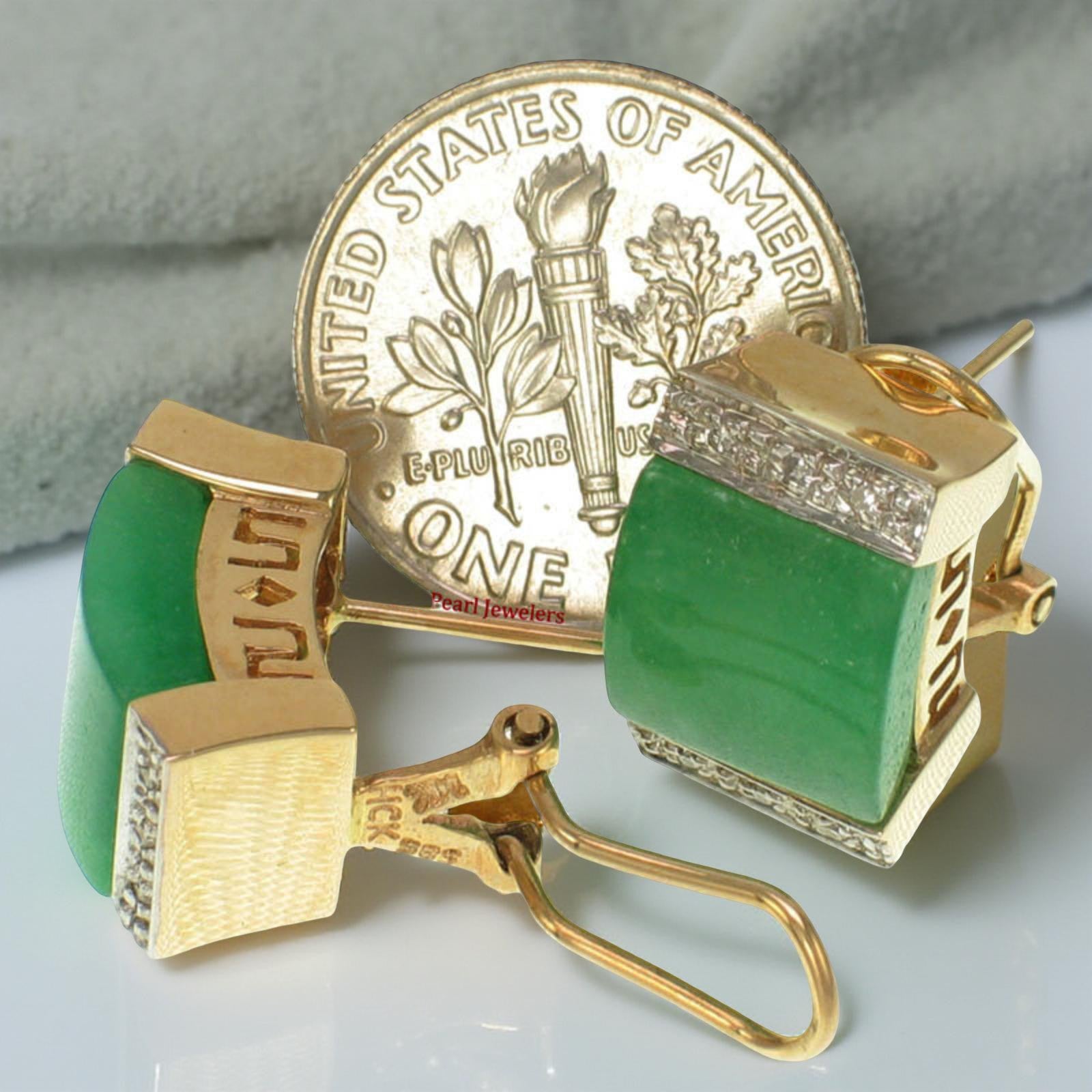 Crafted in solid 14K yellow gold, these earrings feature a cabochon green jade stone accented with 12 dazzling diamonds, creating a luxurious statement piece, designed for comfort and dependable daily wear.