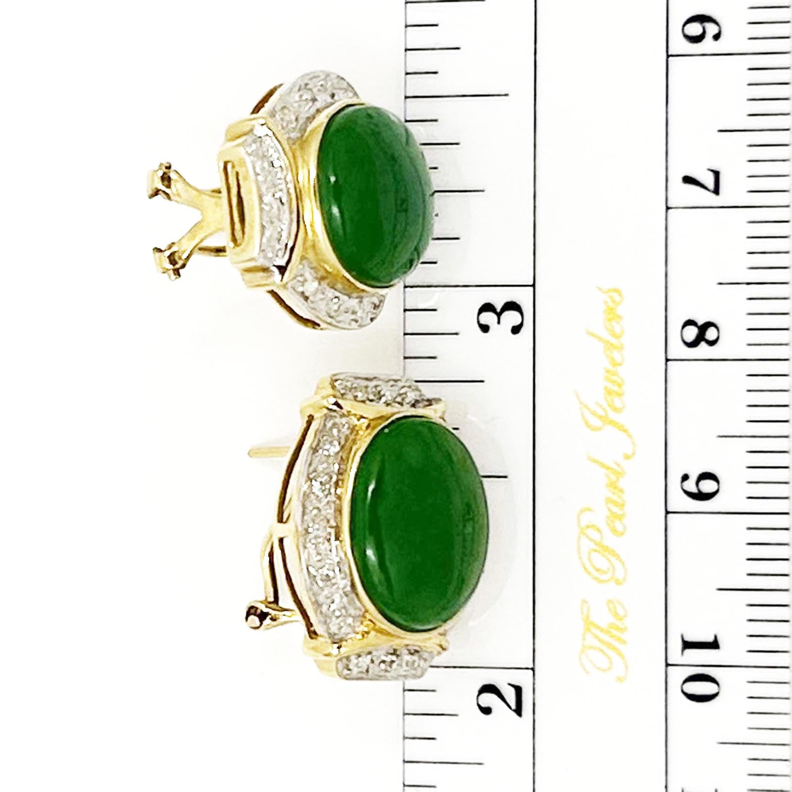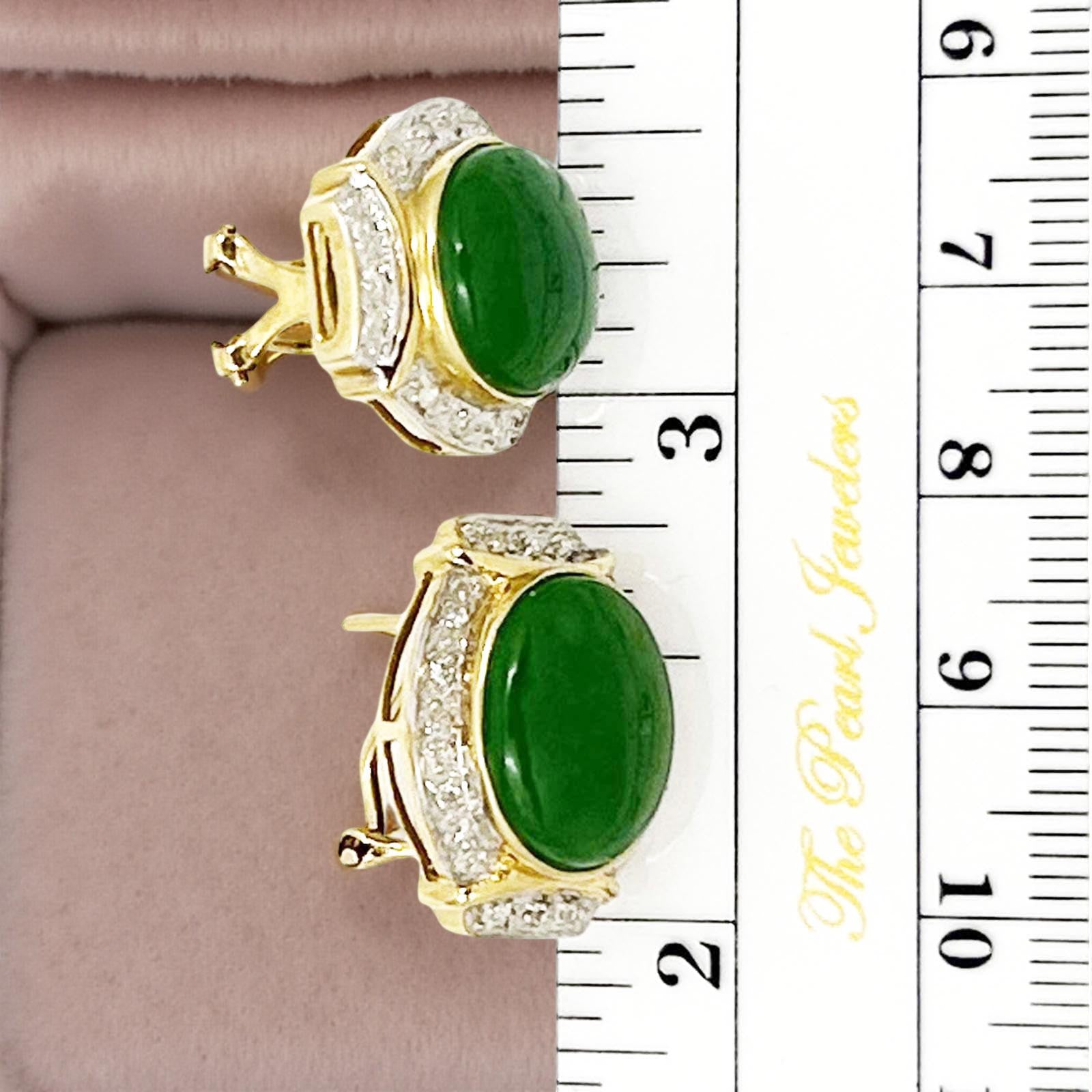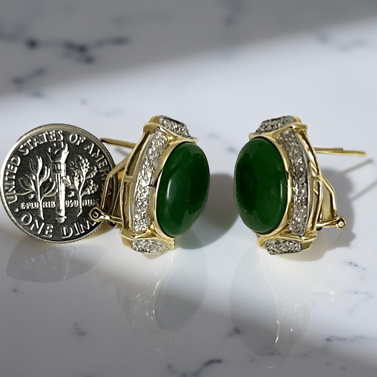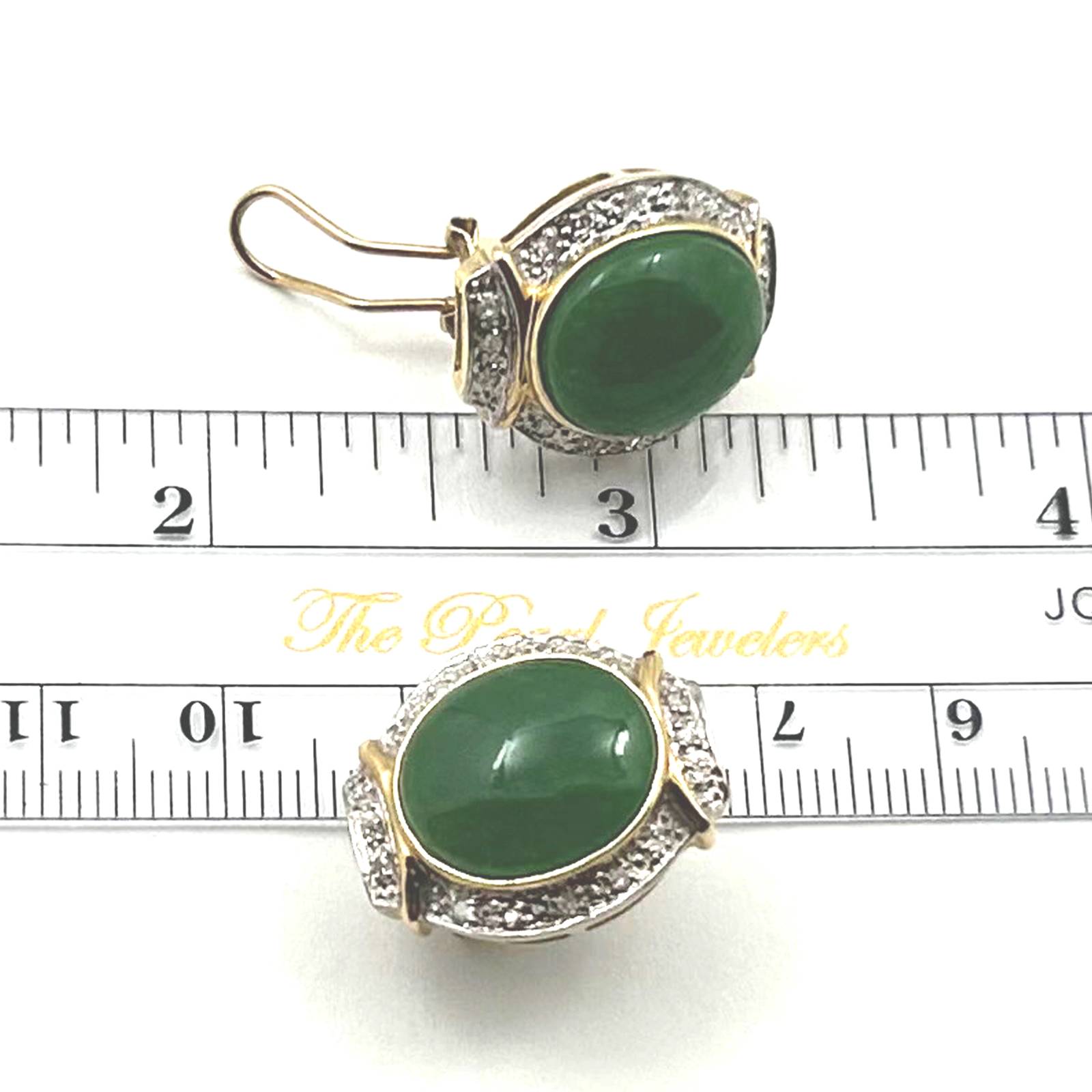 These solid 14K yellow gold earrings feature oval cabochon green jade, accented with brilliant diamonds, creating a luxurious and elegant look, designed for comfort and dependable daily wear.