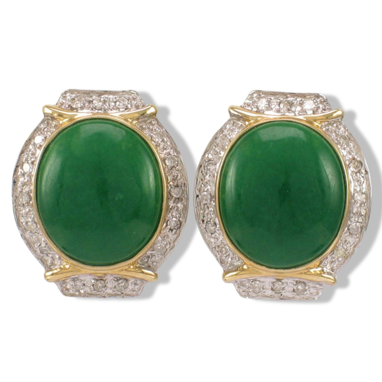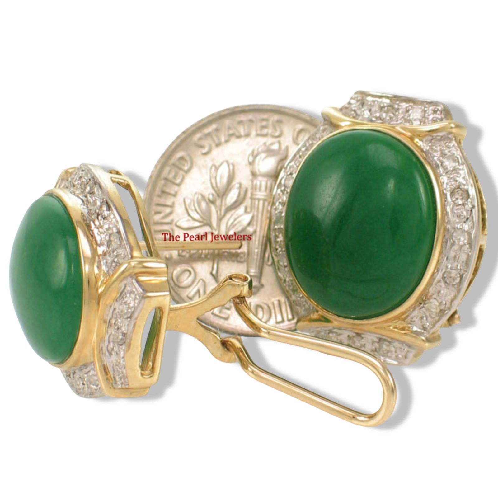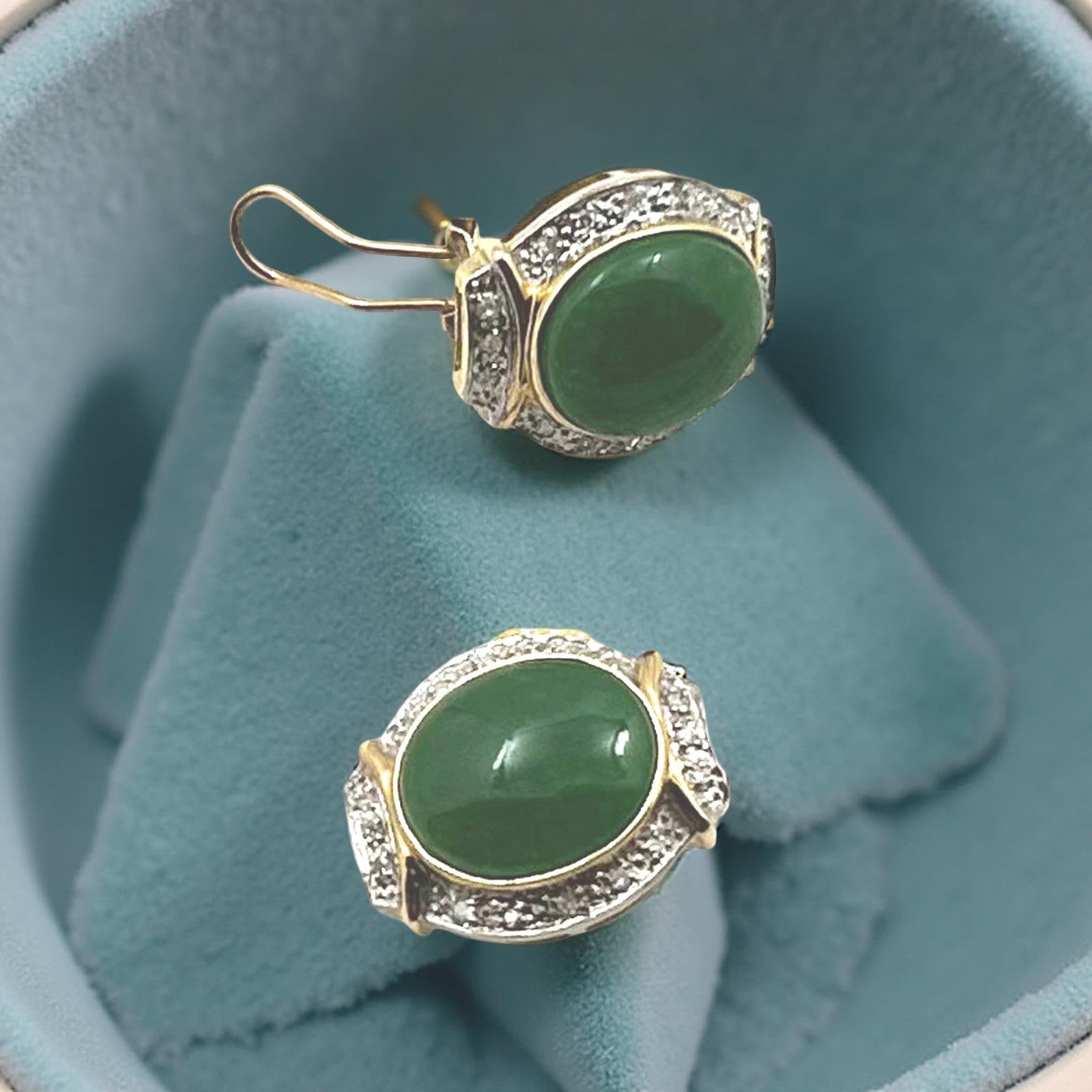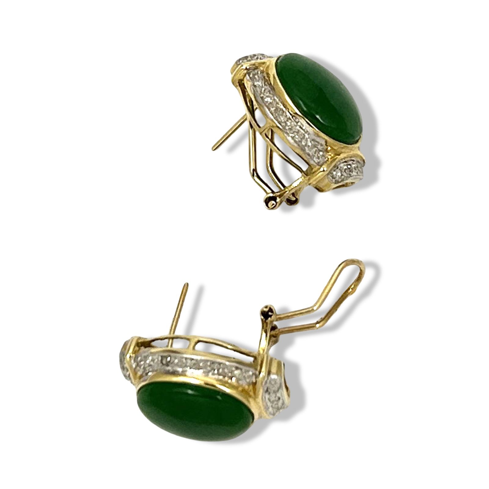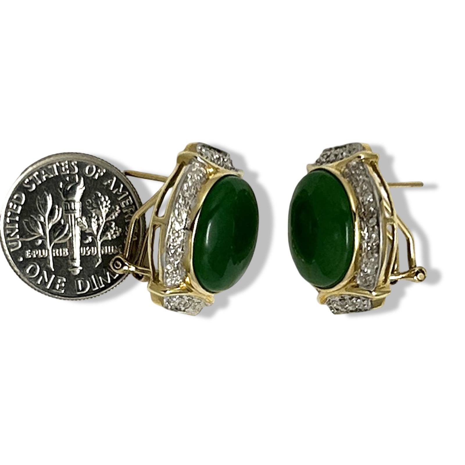 These solid 14K yellow gold earrings feature oval cabochon green jade, accented with brilliant diamonds, creating a luxurious and elegant look, designed for comfort and dependable daily wear.