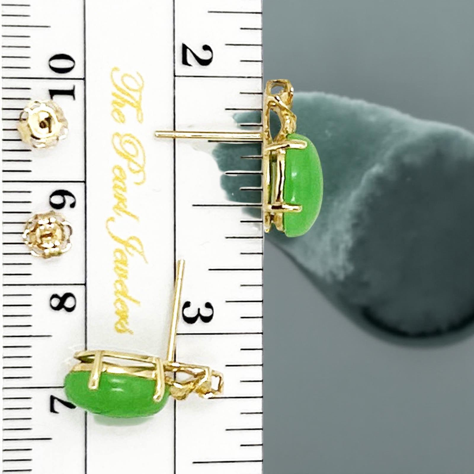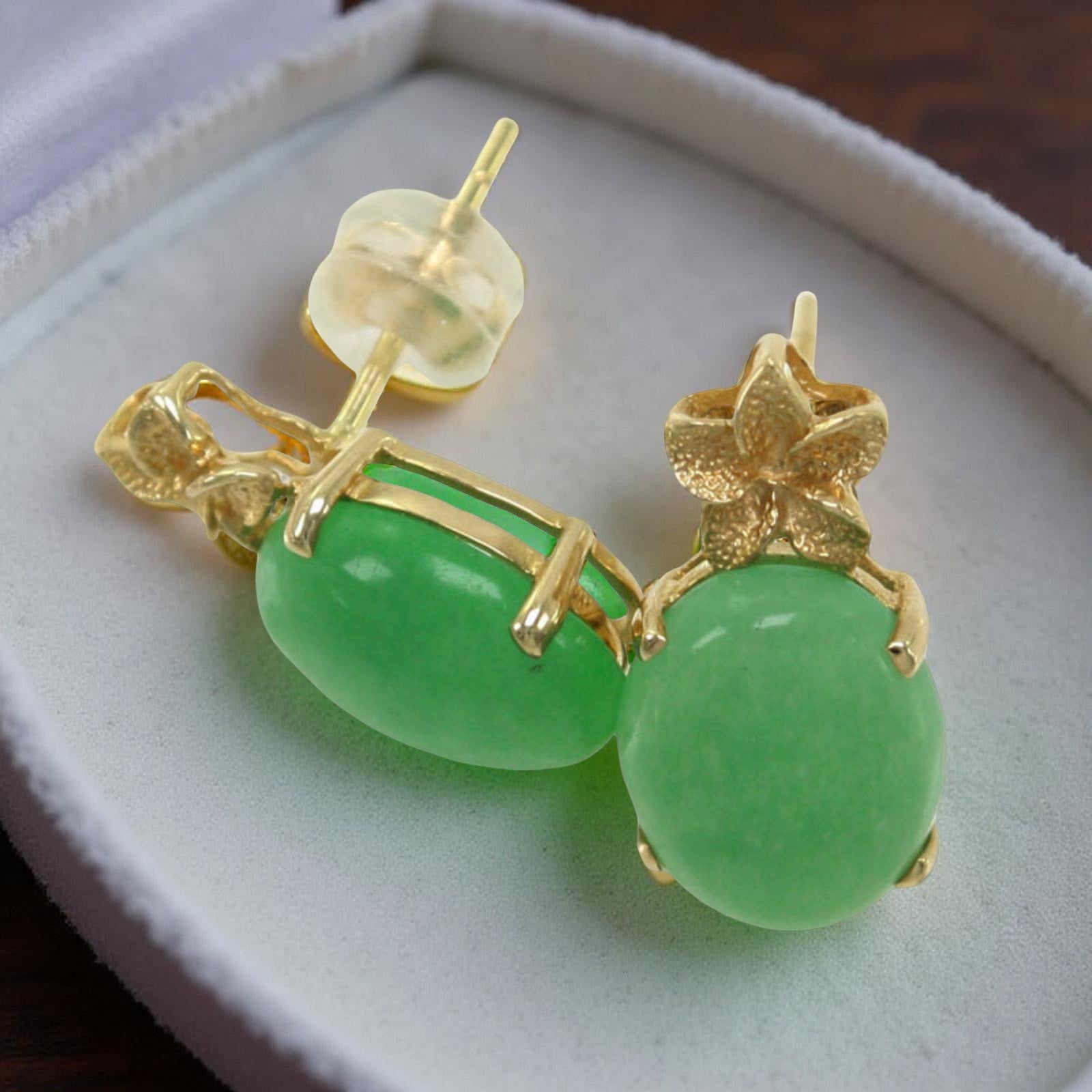 Crafted in solid 14K yellow gold, these Hawaiian-inspired earrings feature green jade cabochons, offering a delicate and tropical elegance, designed for comfort and dependable daily wear.