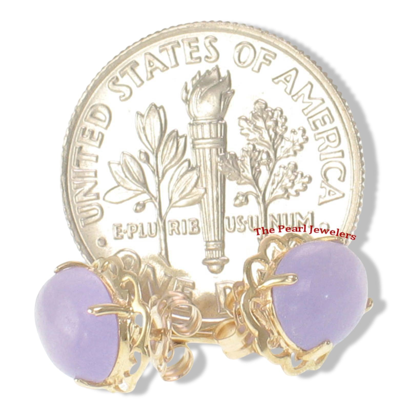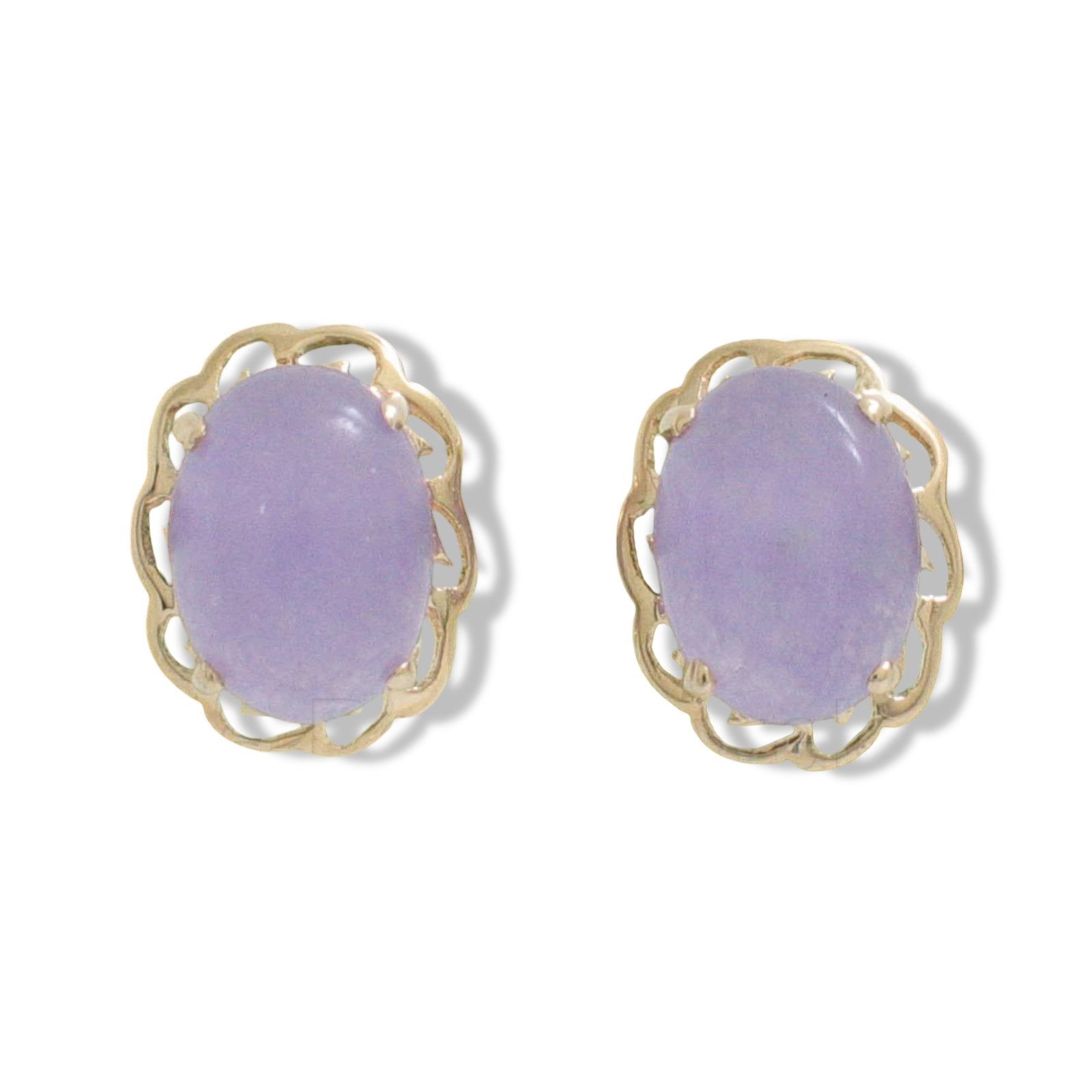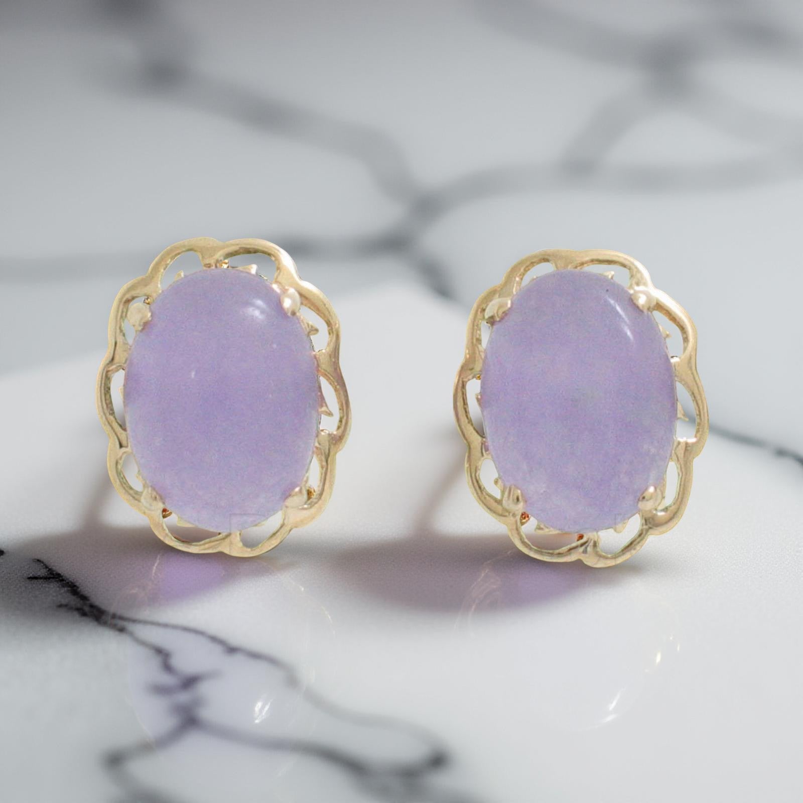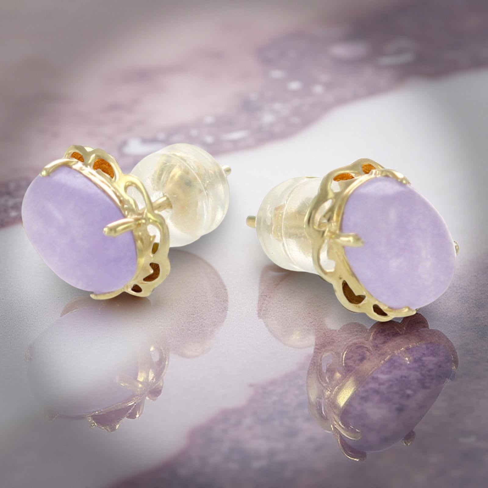 Crafted in solid 14k yellow gold, these oval cabochon lavender jade stud earrings feature a delicate wave prong setting, adding an elegant touch, designed for comfort and dependable daily wear.