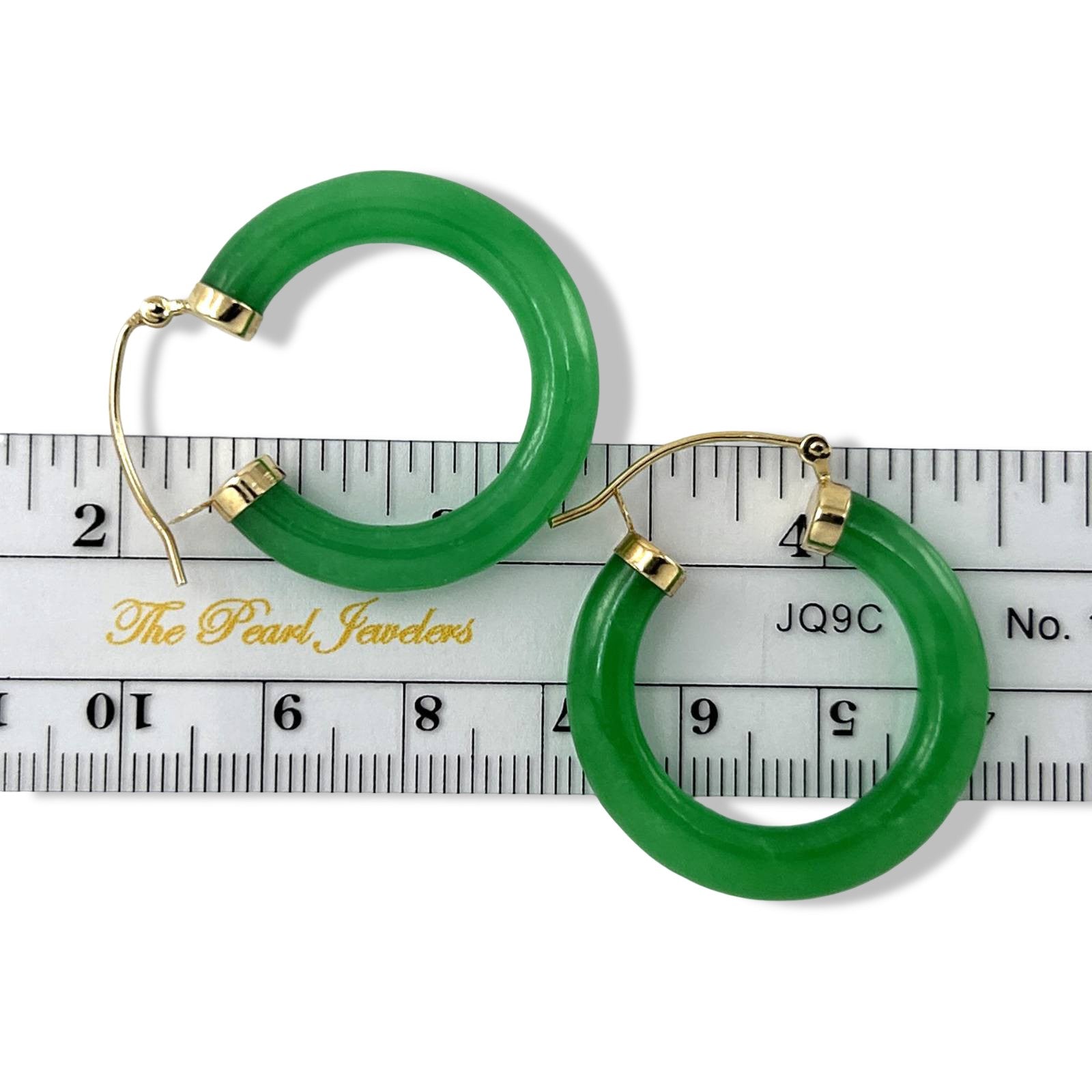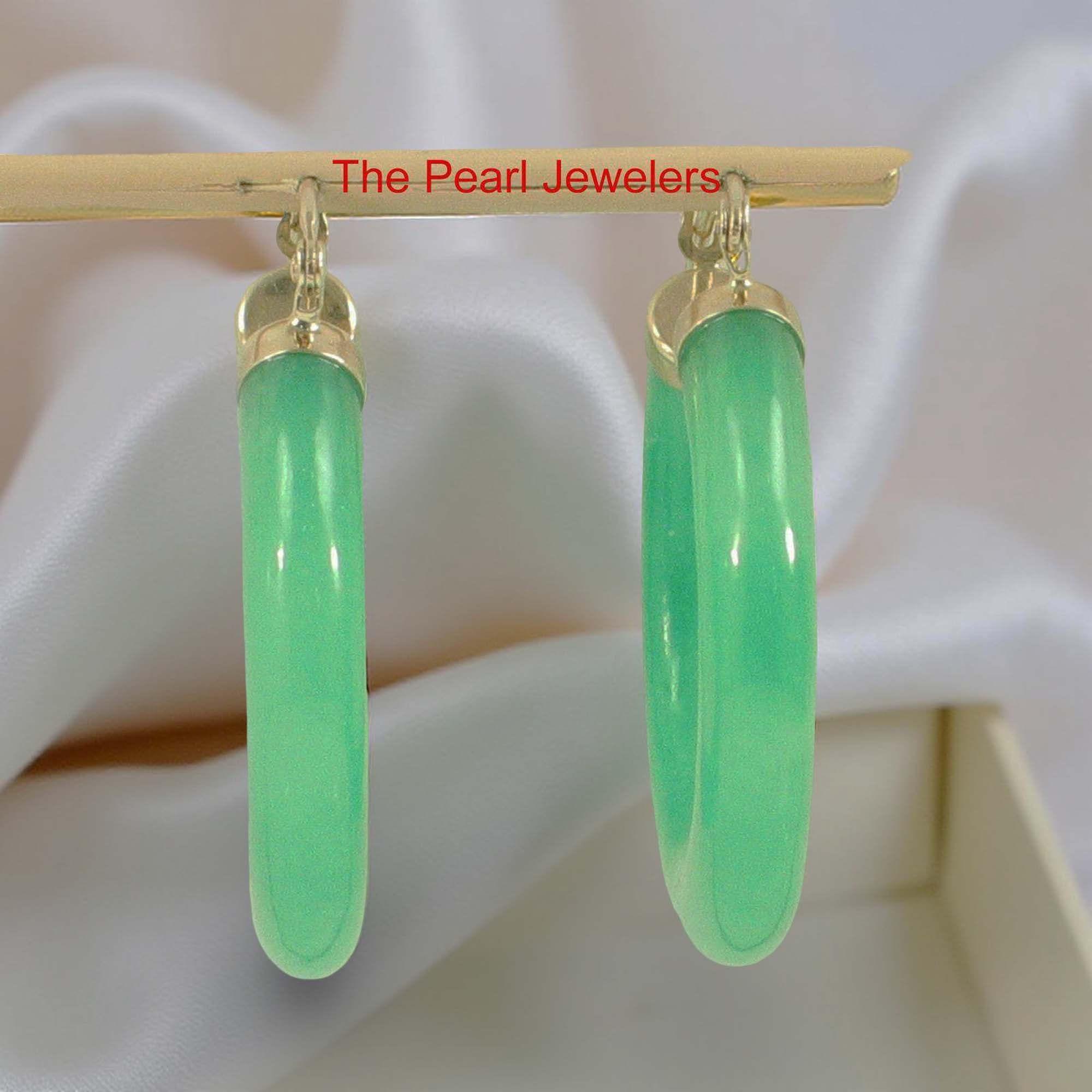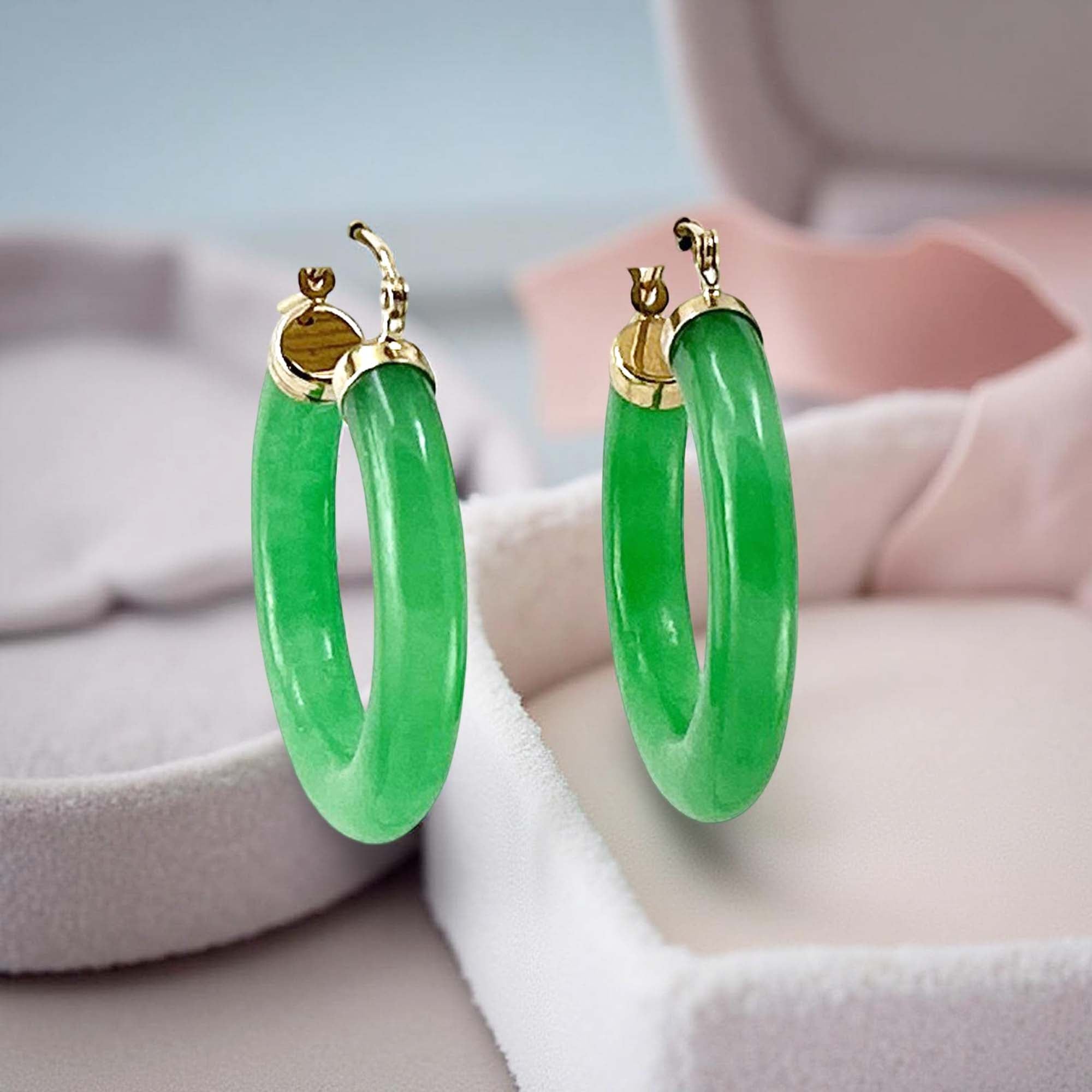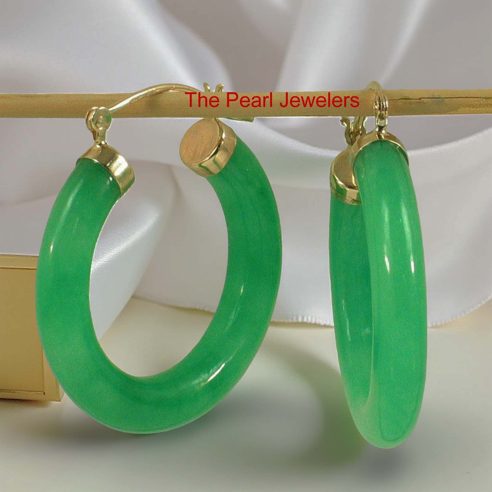 Designed in solid 14k yellow gold, these hoop earrings feature a 30mm green jade tube ring, offering a bold and sophisticated statement look, designed for comfort and dependable daily wear.