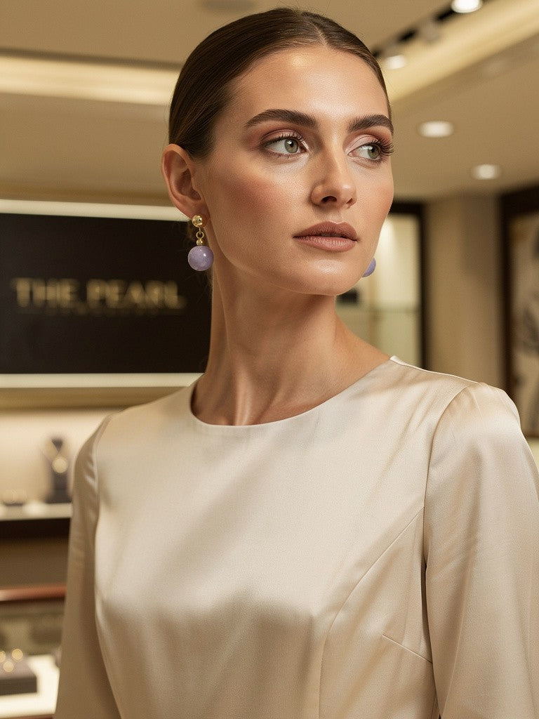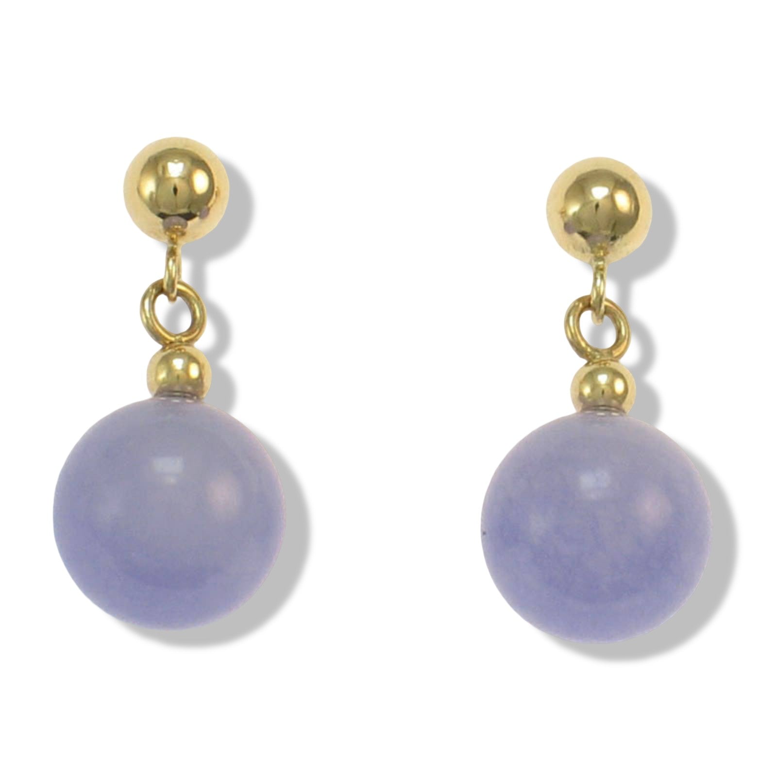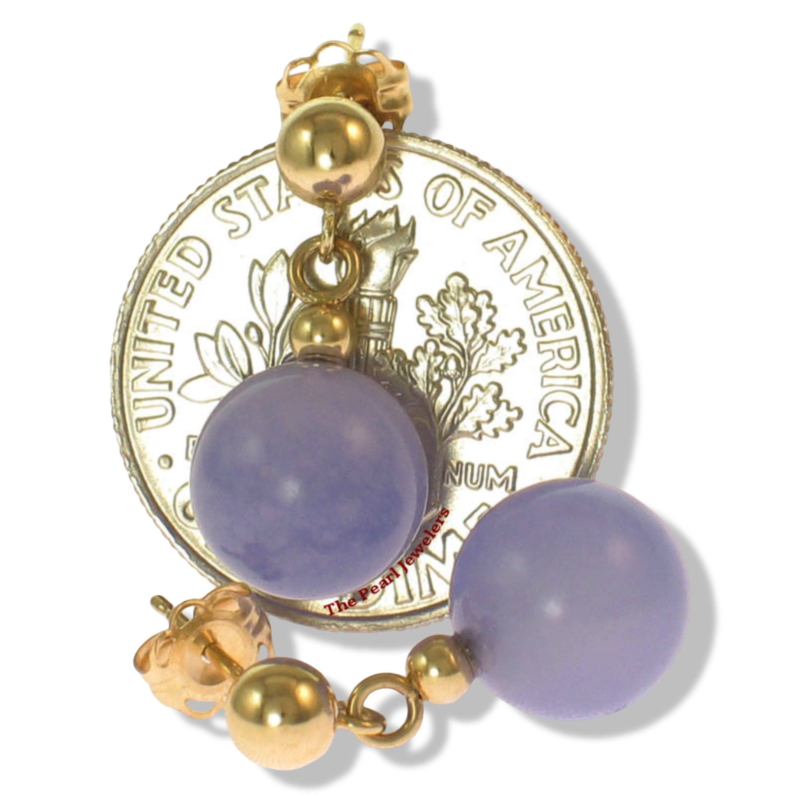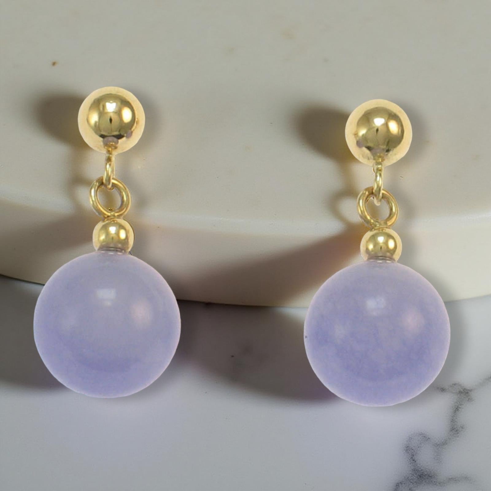 These solid 14K yellow gold earrings feature lavender jade beads, delicately hanging from gold ball studs for a graceful dangle design for comfort and dependable daily wear.