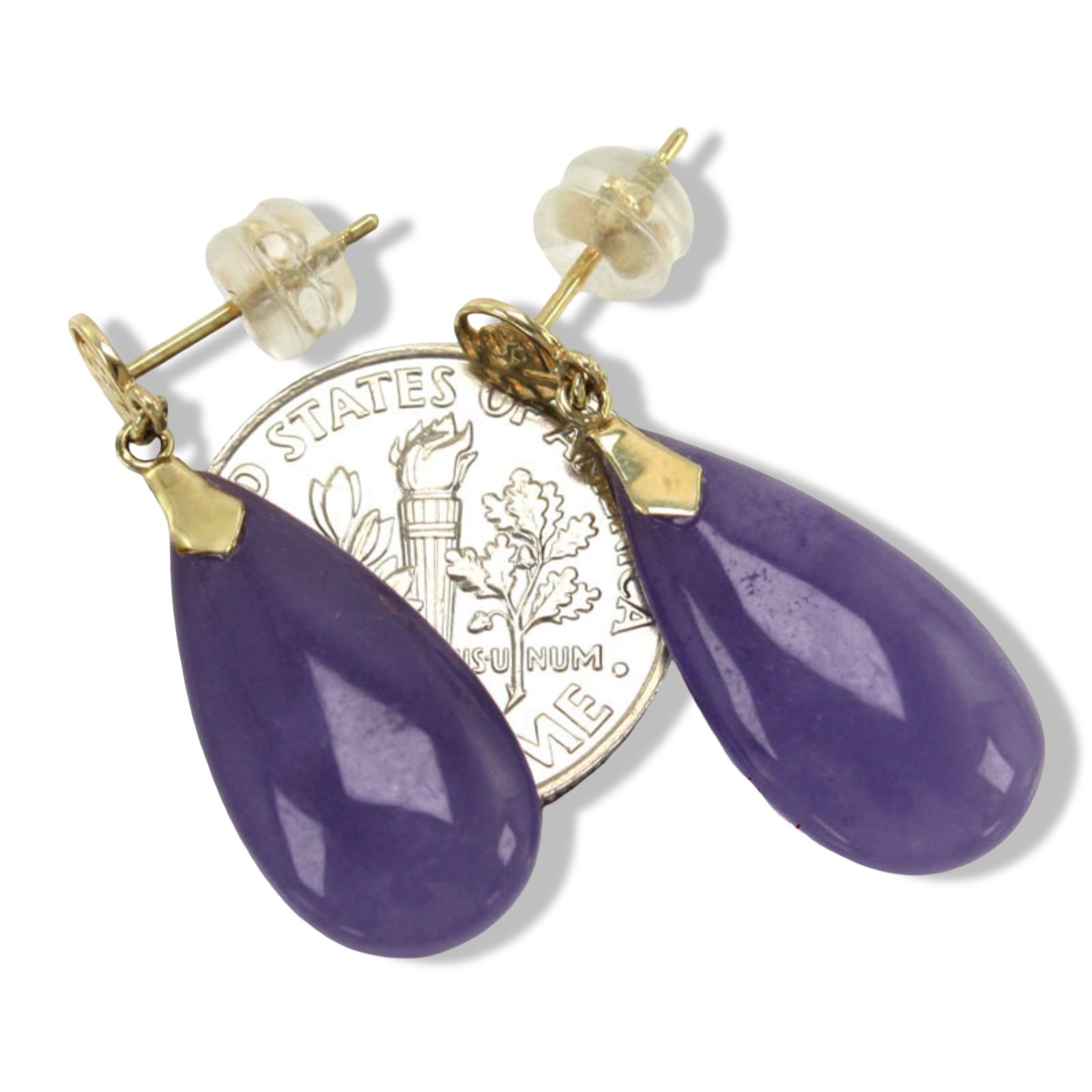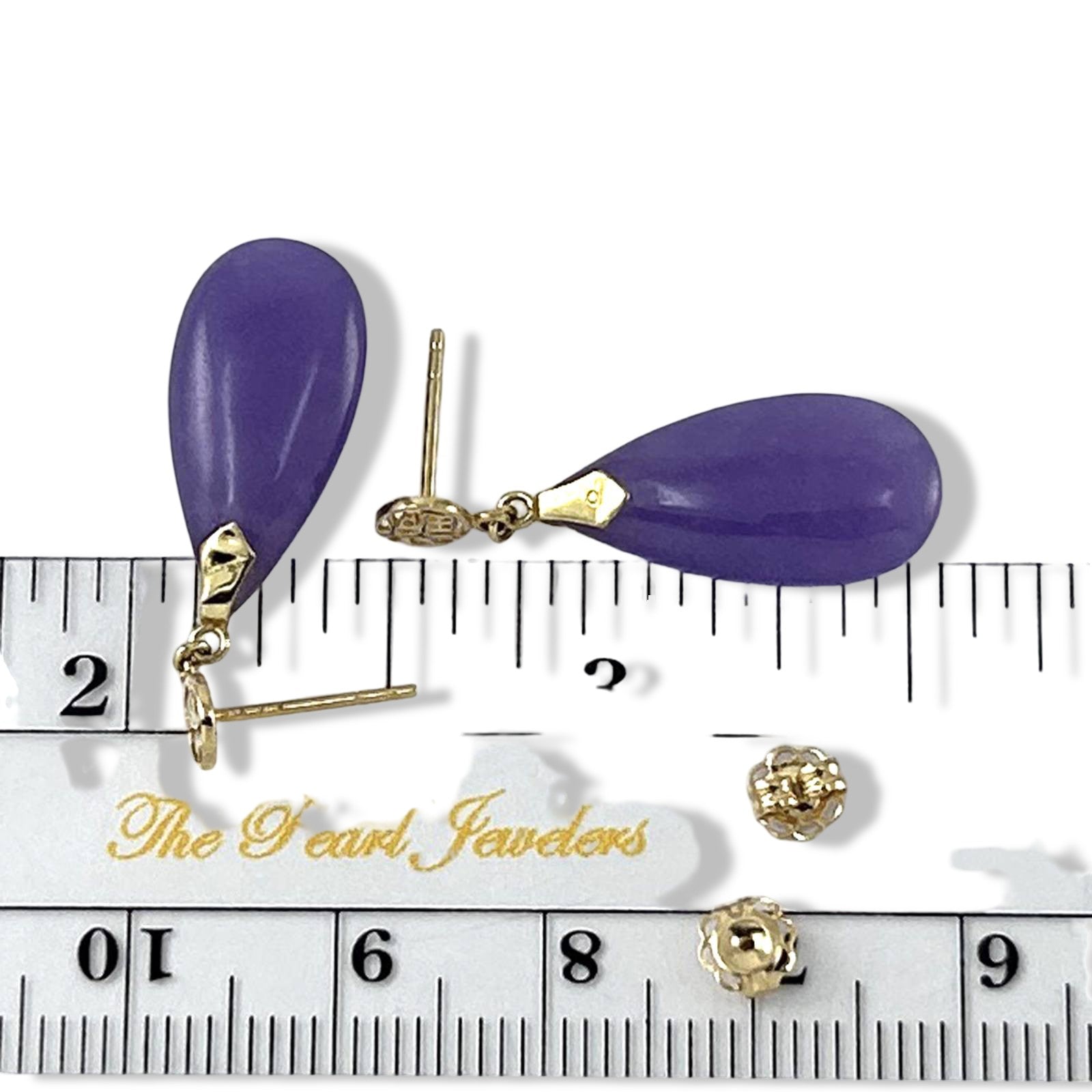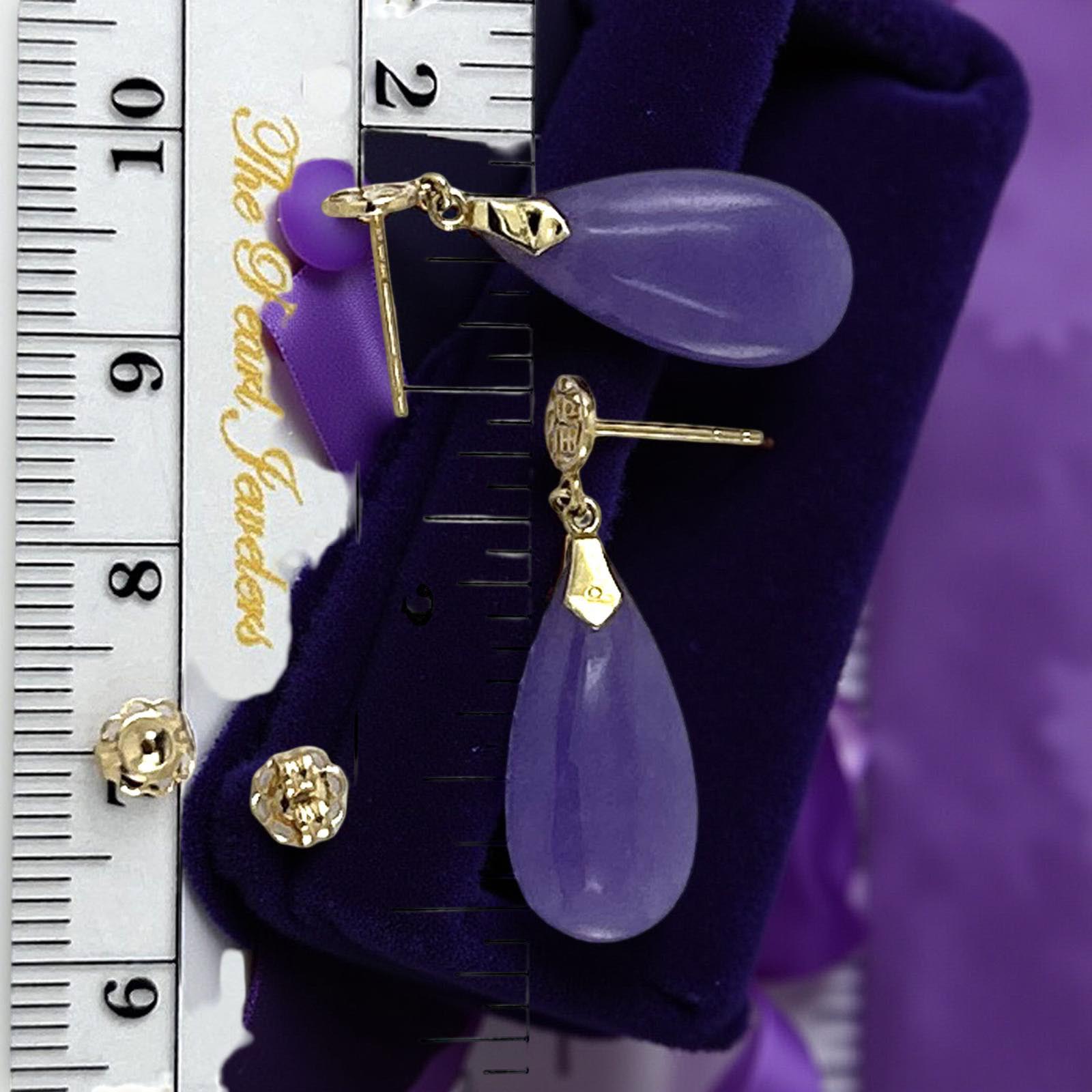 These stunning earrings feature a Chinese βFuβ (Good Fortune) symbol in solid 14K gold, elegantly dangling on a flat raindrop lavender jade gemstone, designed for comfort and dependable daily wear.