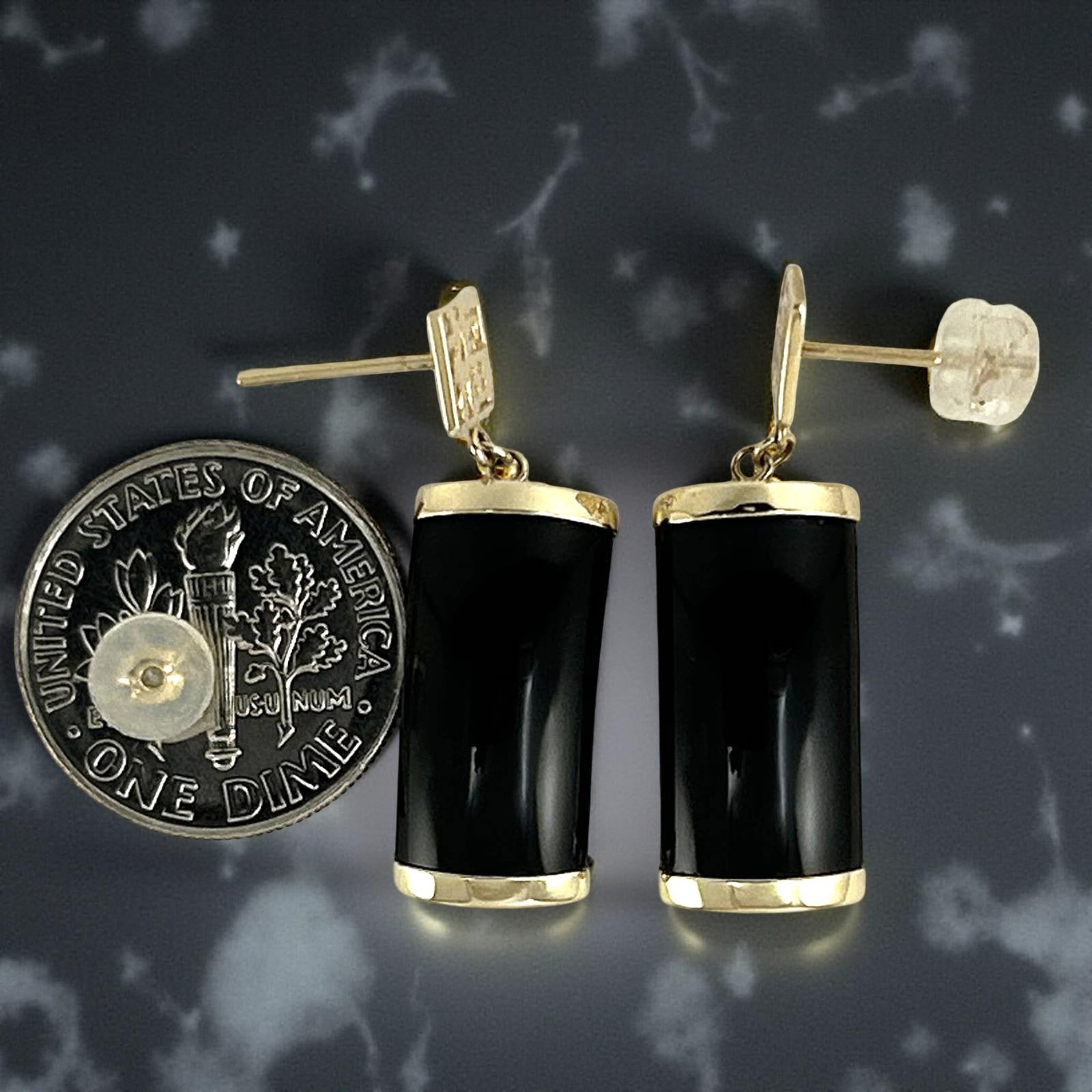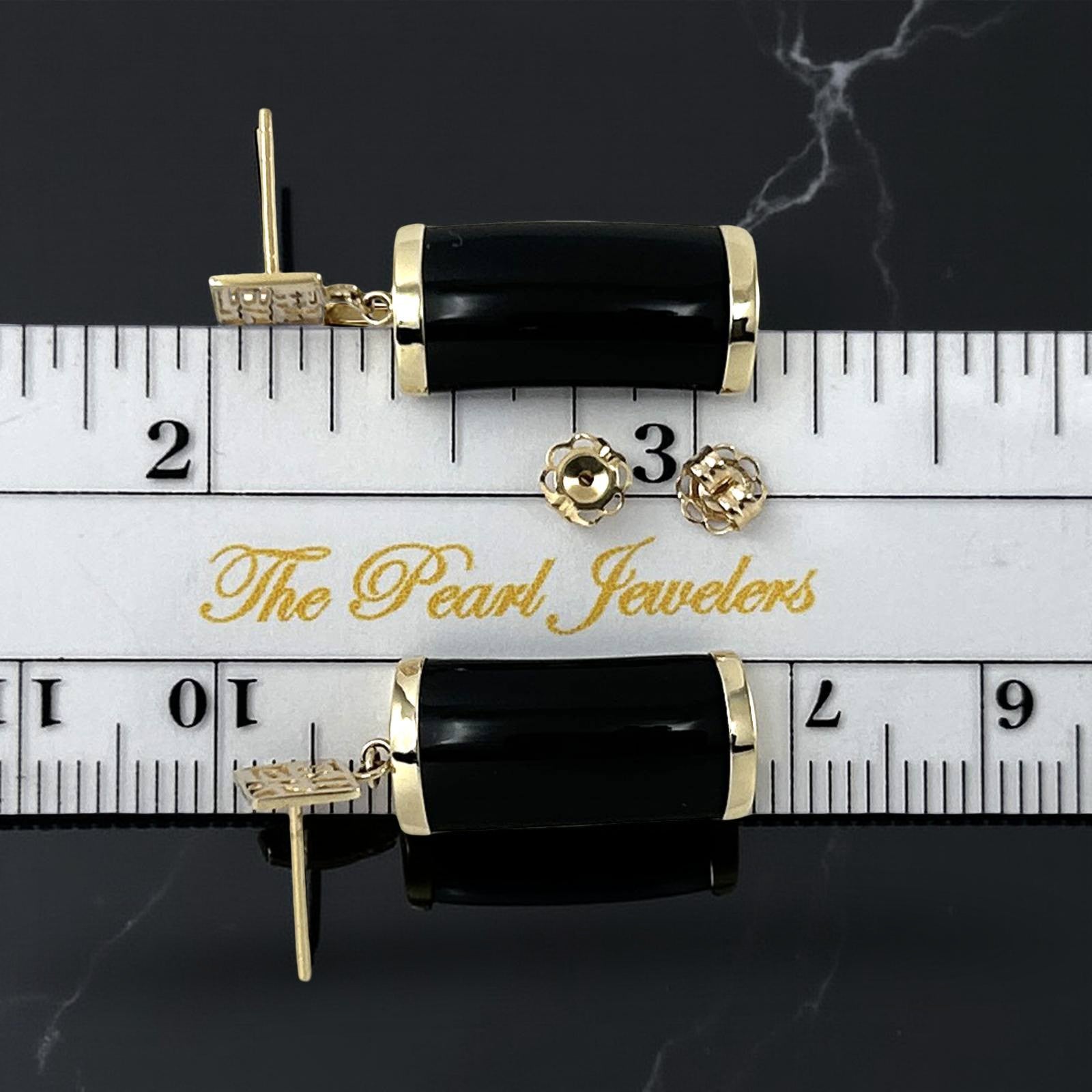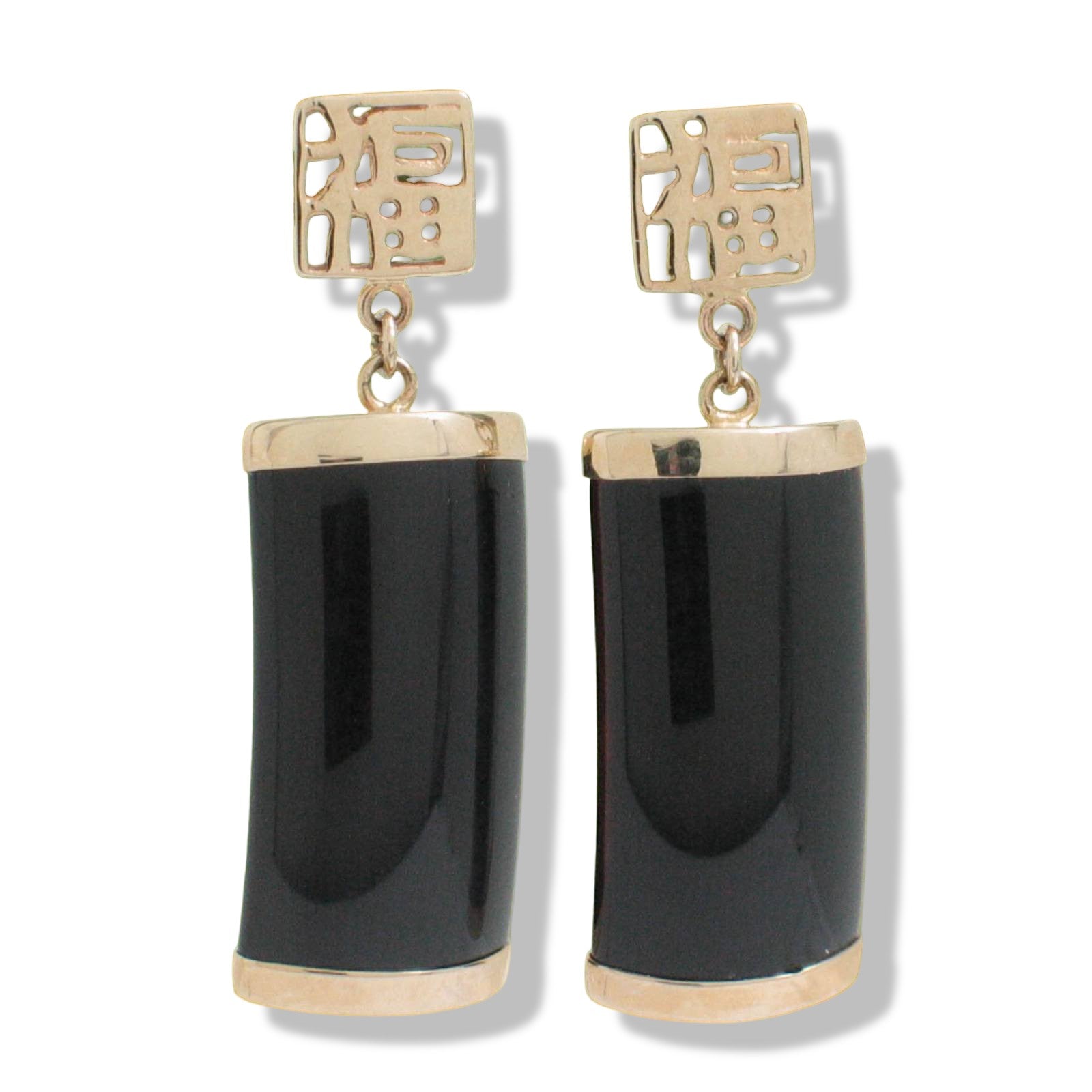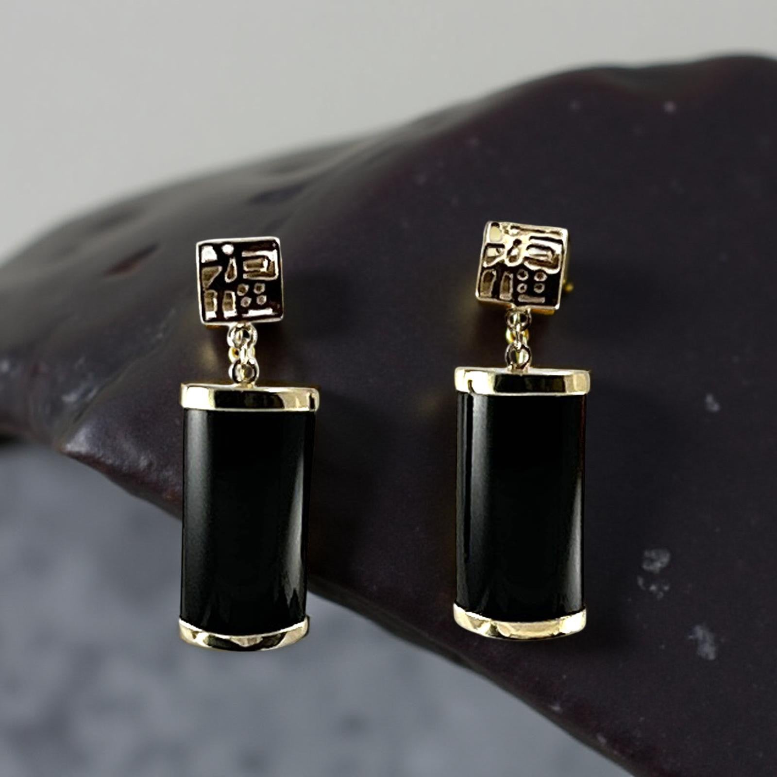 Crafted from solid 14K yellow gold, these curved black onyx earrings feature Chinese "Good Fortune" engravings, making them a powerful symbol of luck and elegance, designed for comfort and dependable daily wear.