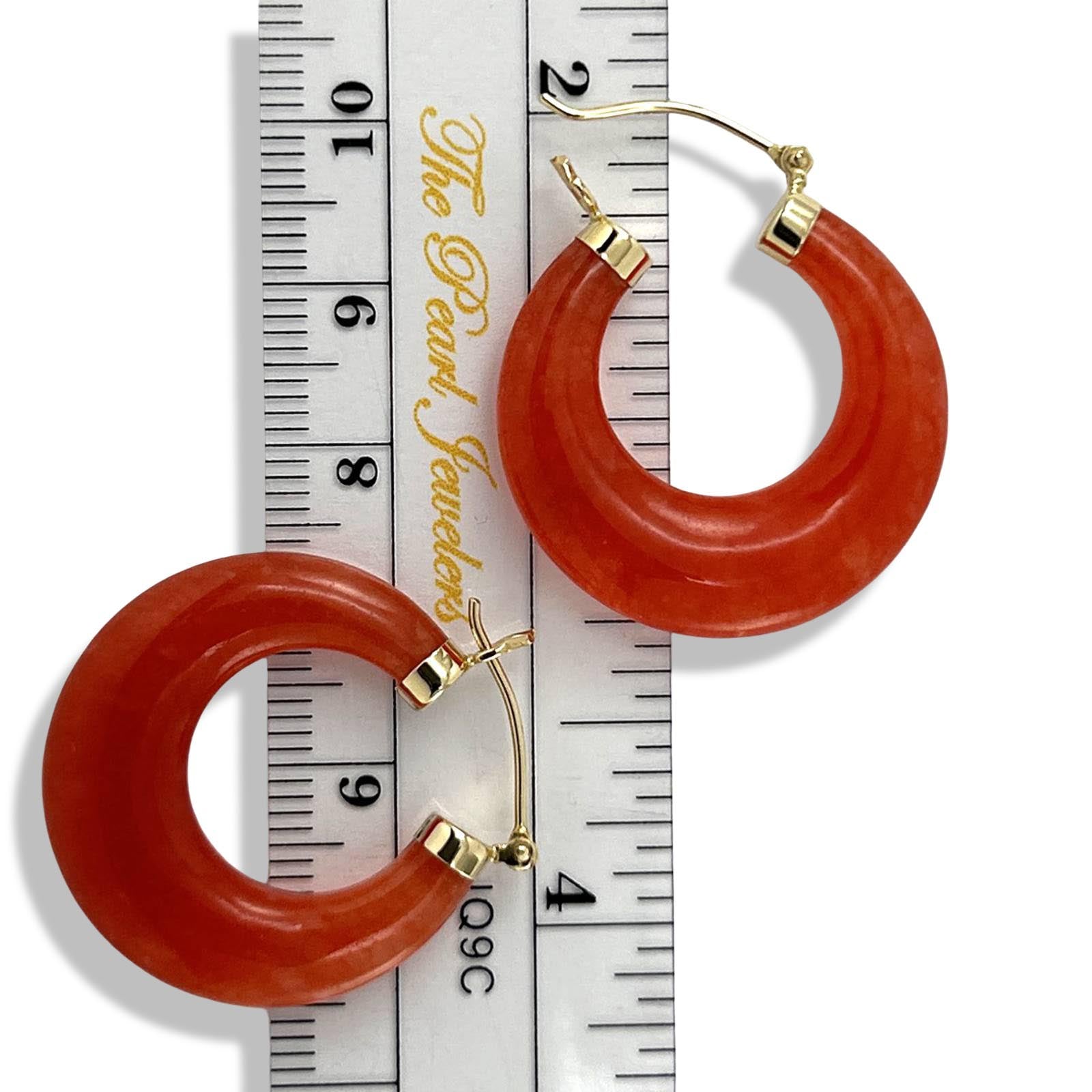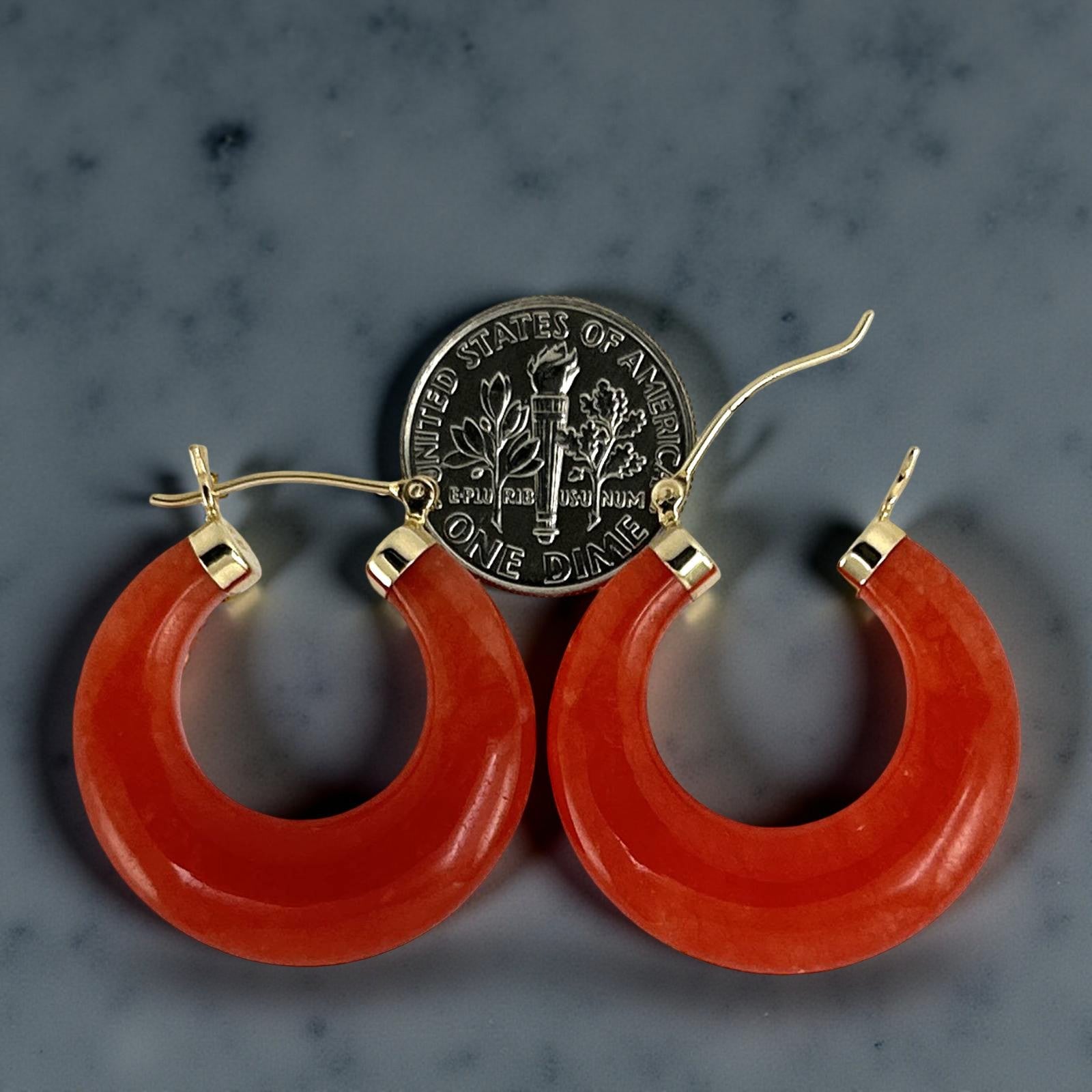 These solid 14K yellow gold hoop earrings feature a moon-shaped red jade design, symbolizing prosperity and passion, designed for comfort and dependable daily wear.