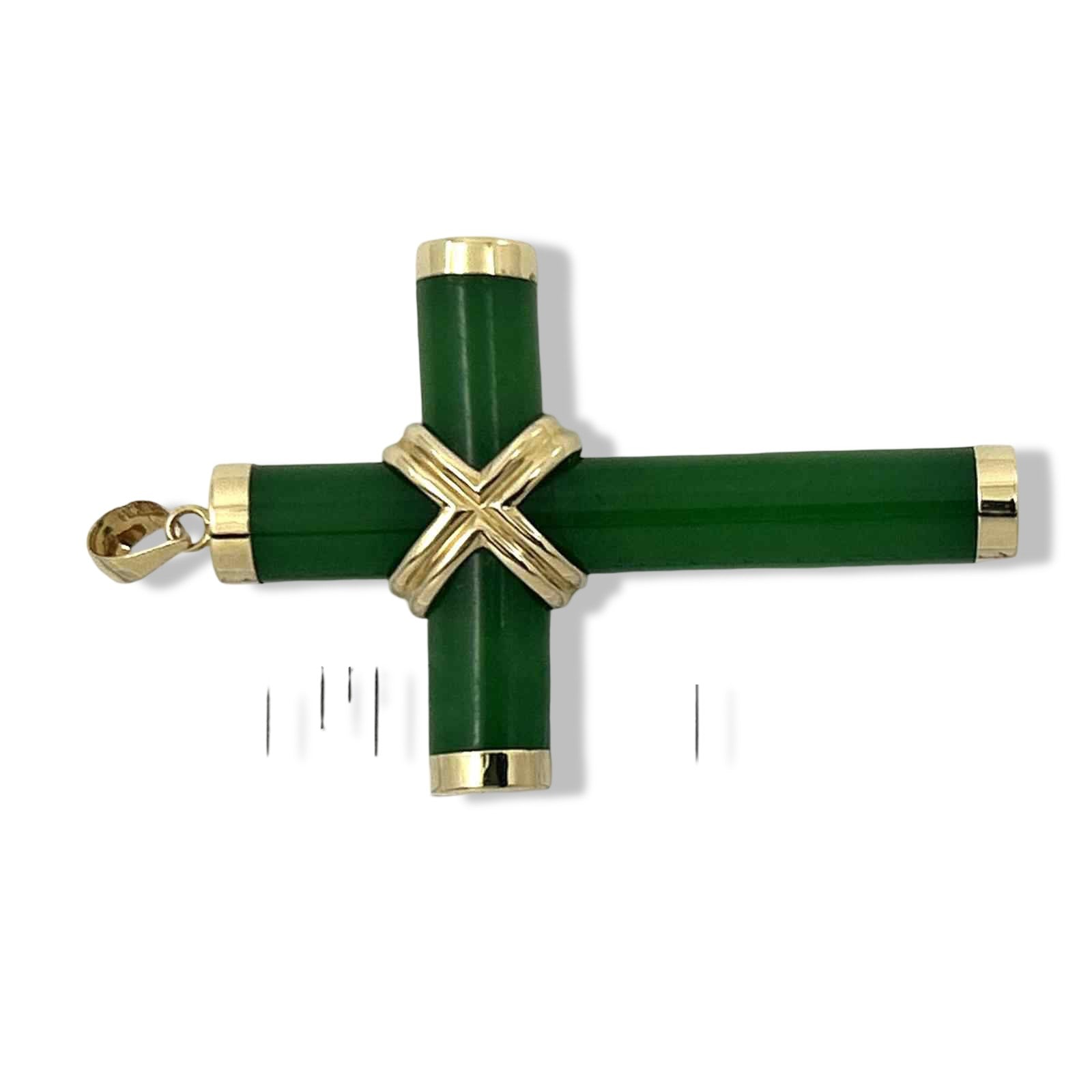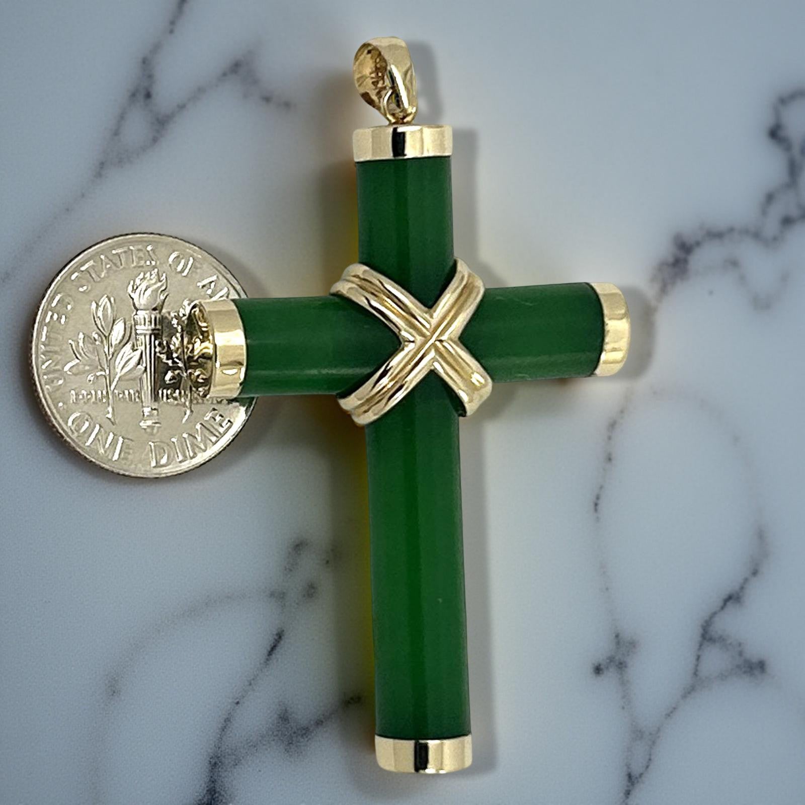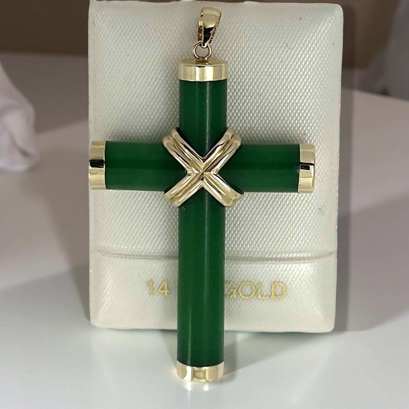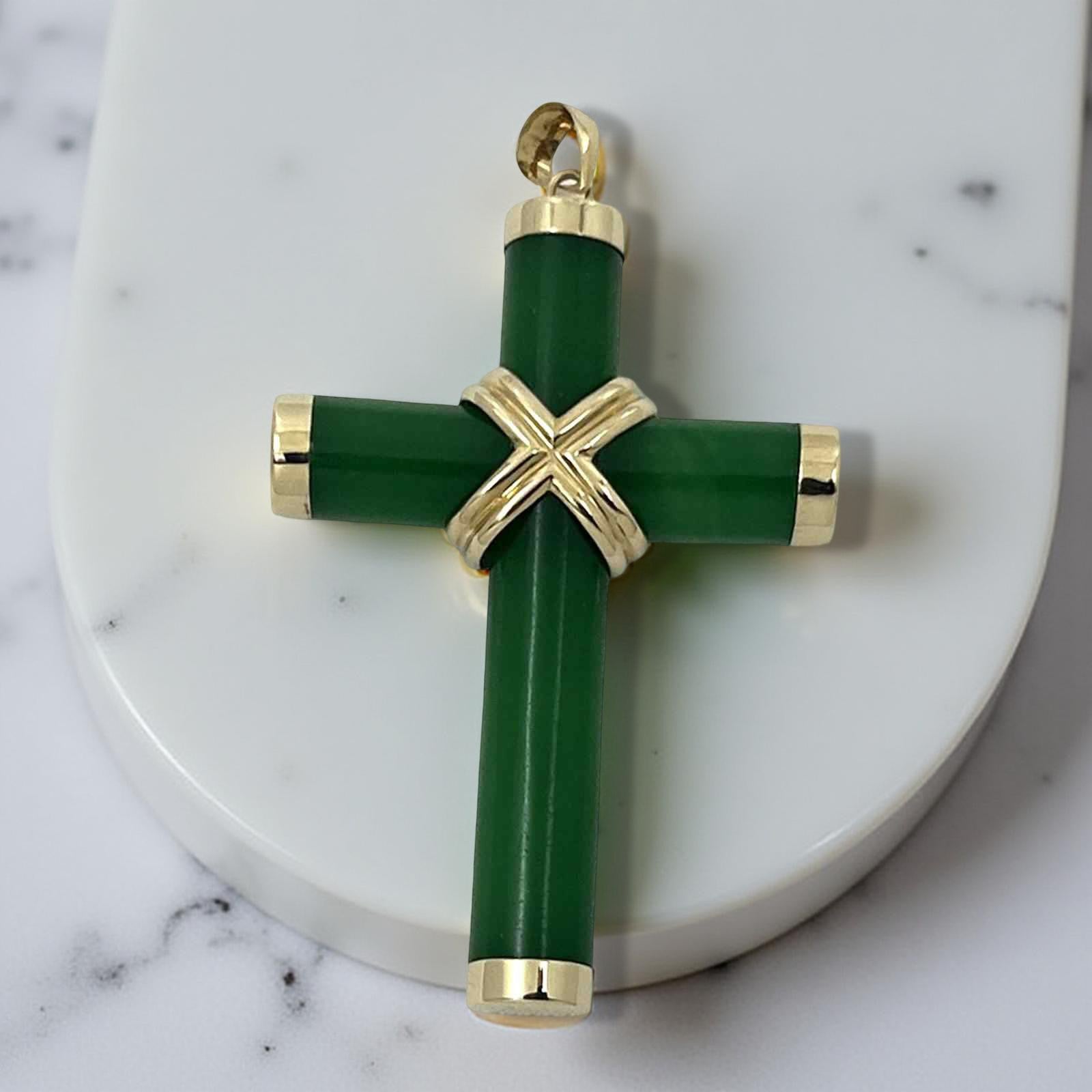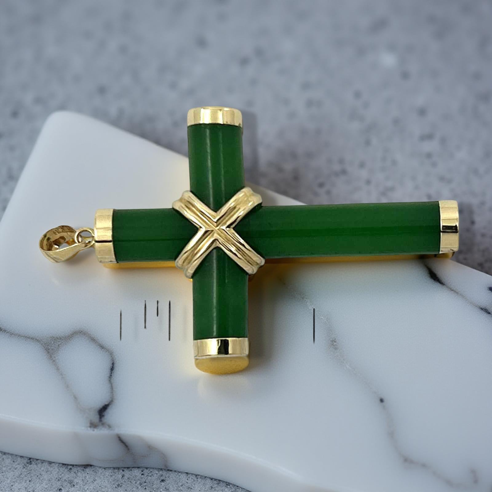 Elegant green jade cross hand-carved and set within a solid 14k yellow gold frame. A timeless religious symbol that adds sophistication to any ensemble.