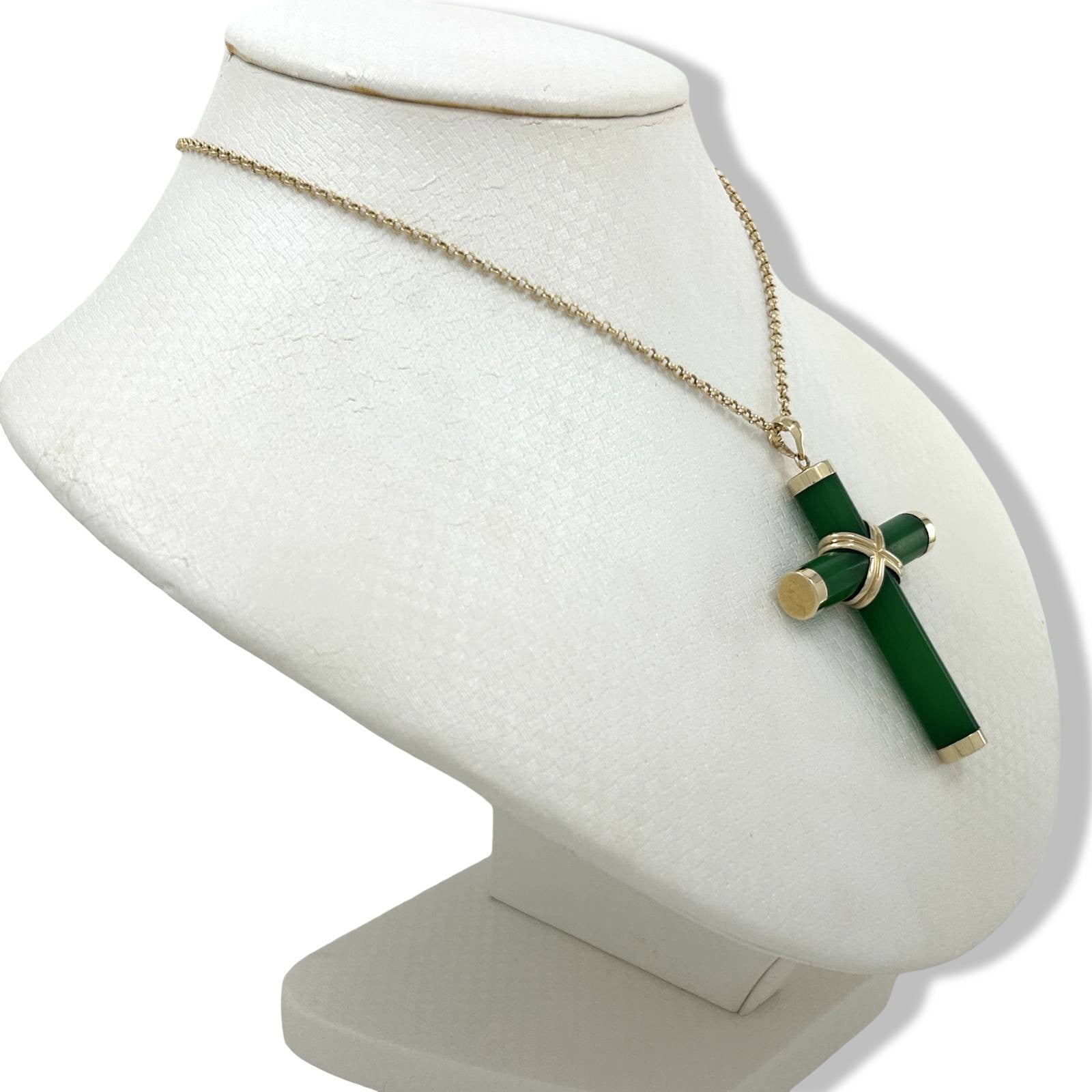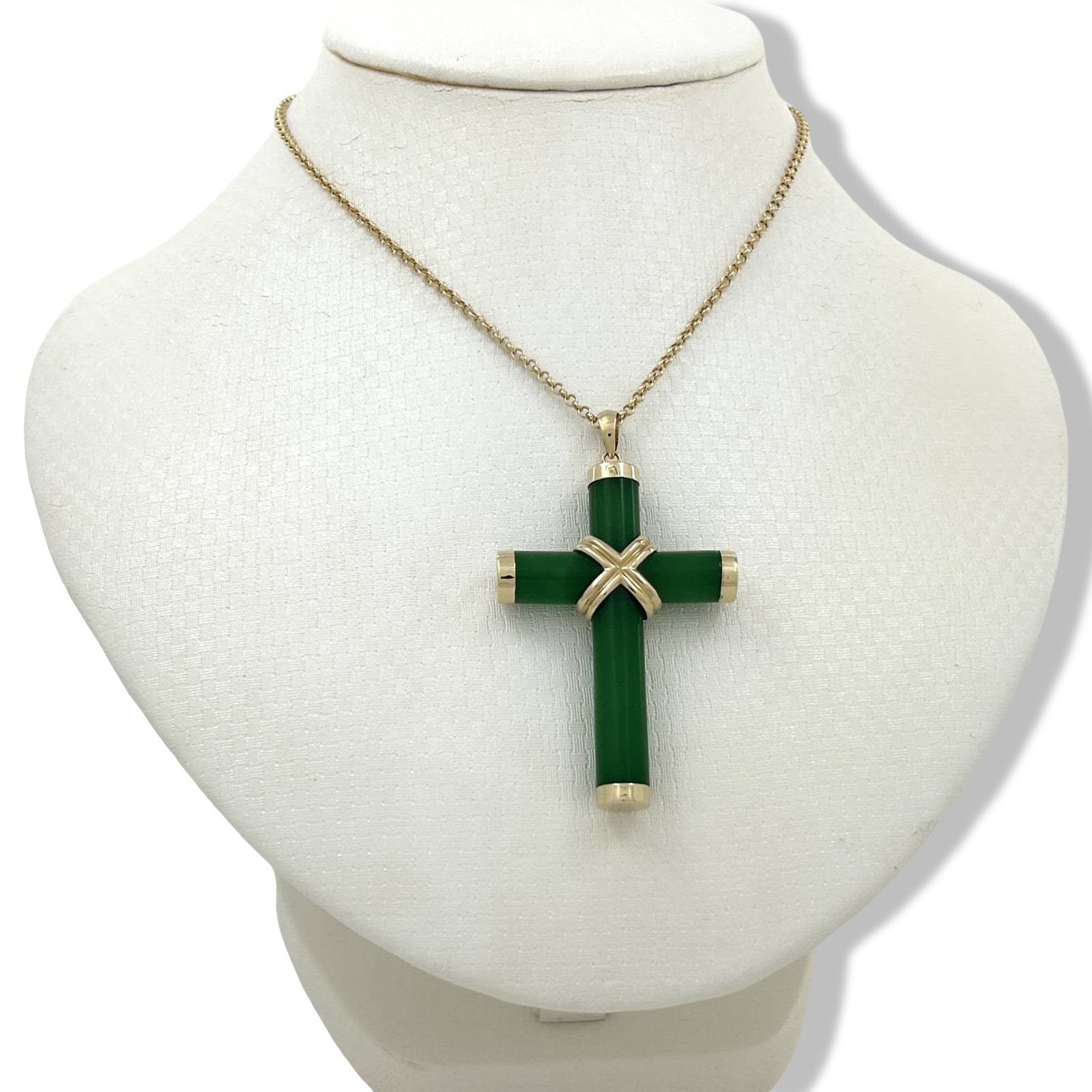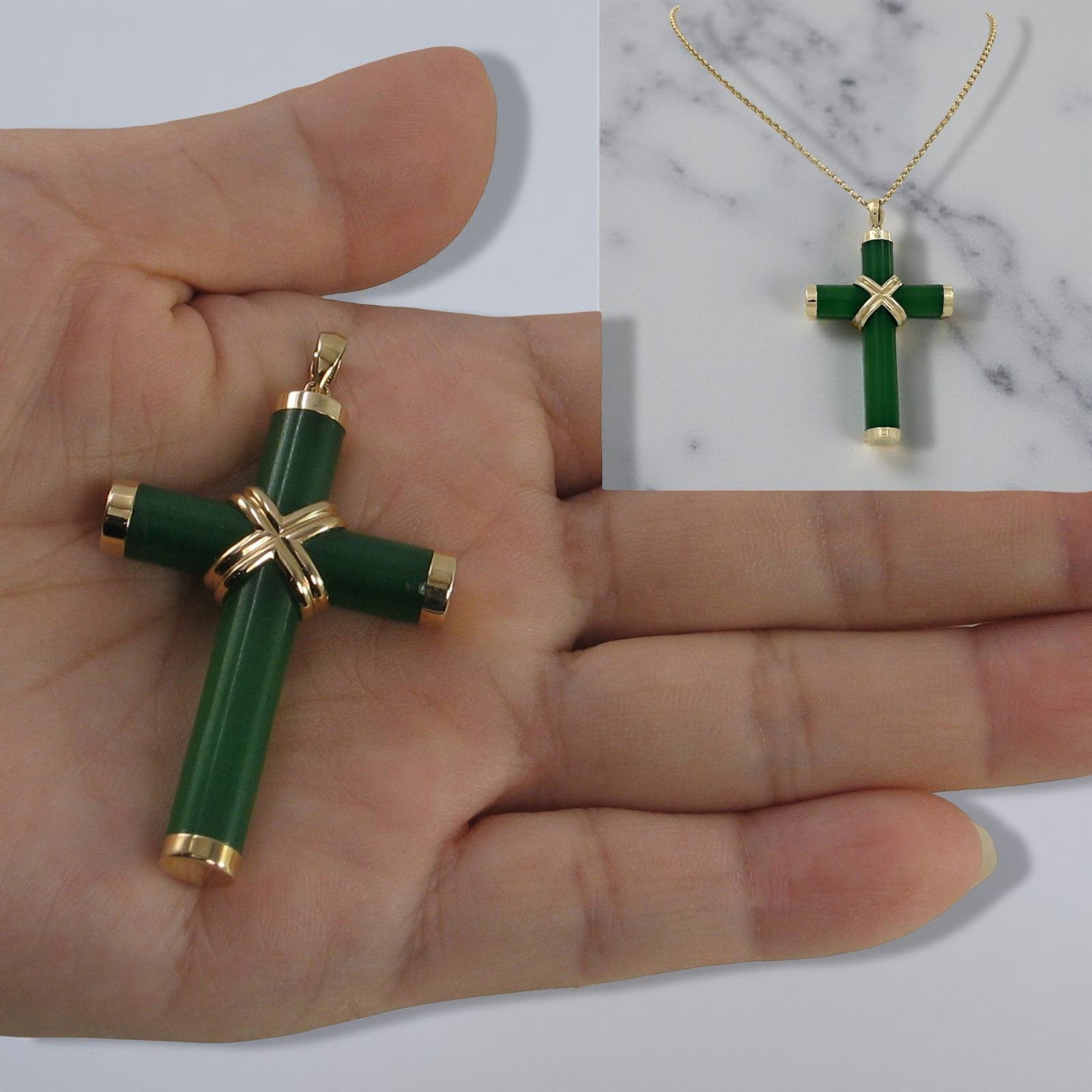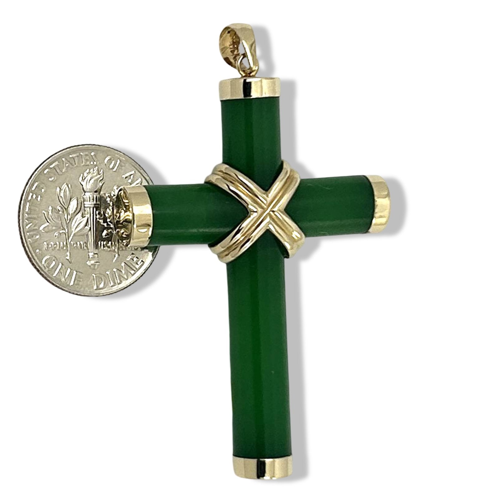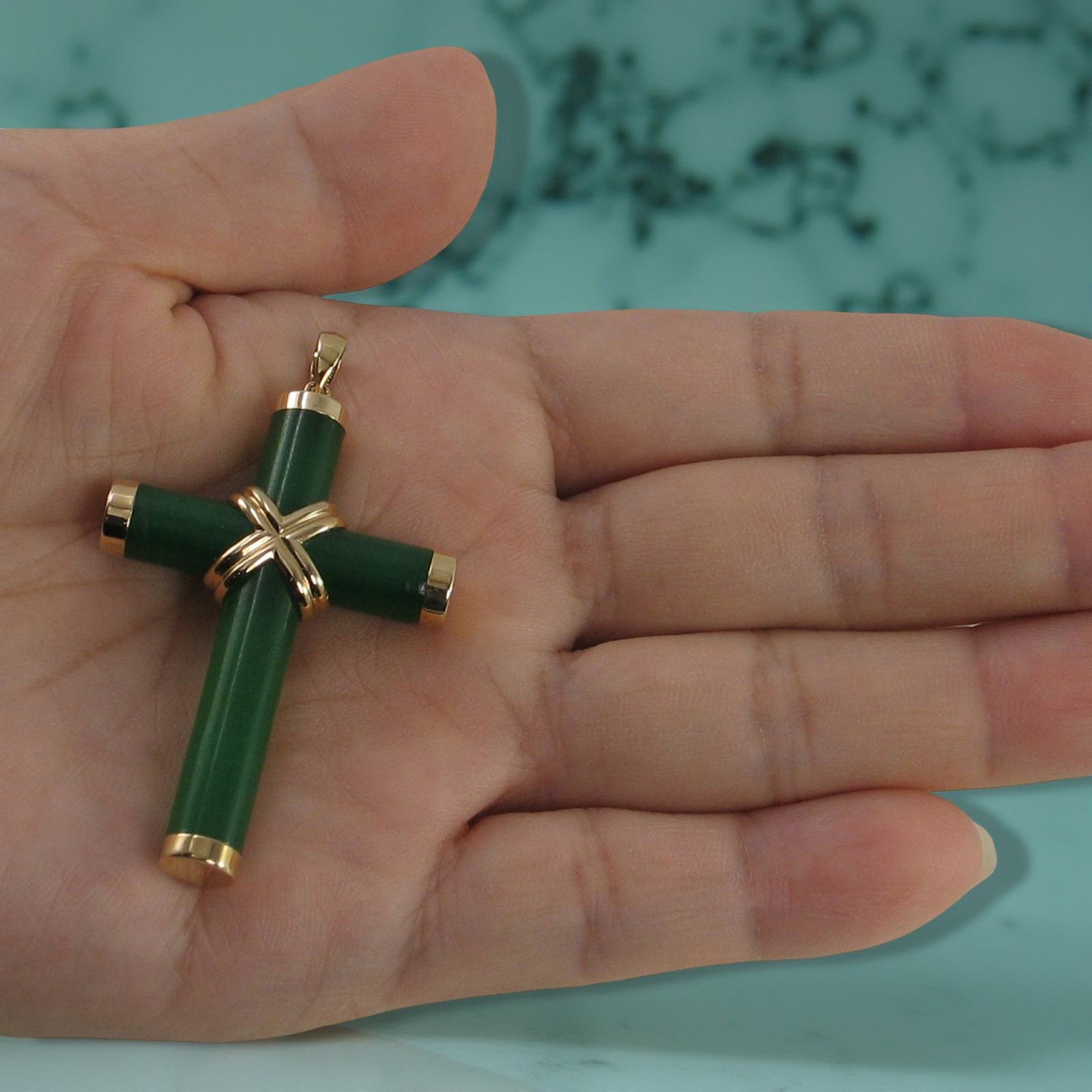 Elegant green jade cross hand-carved and set within a solid 14k yellow gold frame. A timeless religious symbol that adds sophistication to any ensemble.