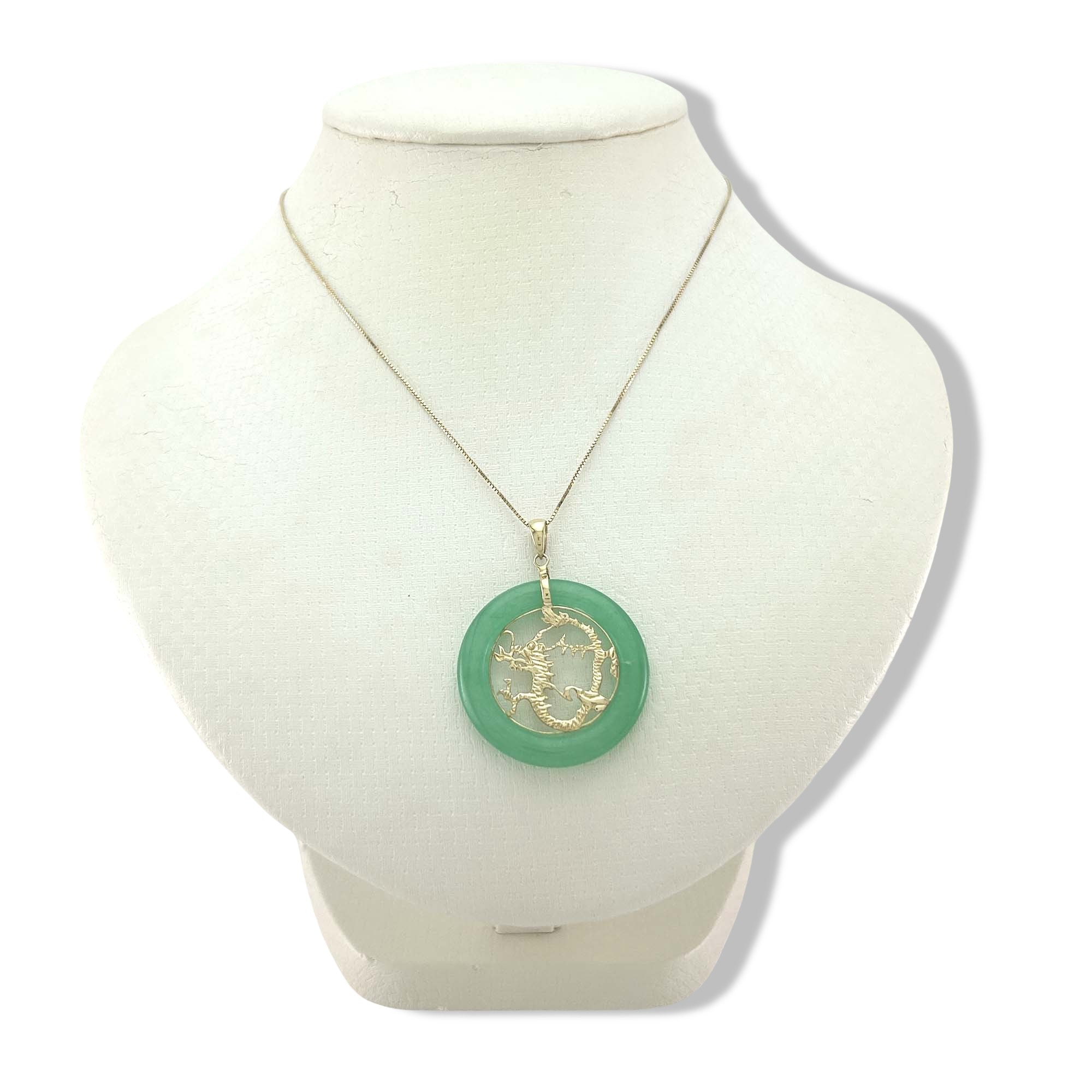 A beautifully carved green jade donut pendant featuring an intricate solid 14K yellow gold dragon. A timeless symbol of strength, protection, and prosperity—perfect for meaningful daily wear.