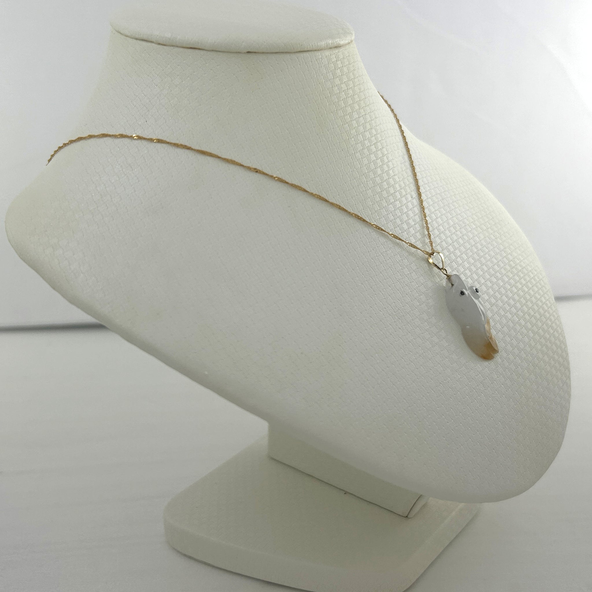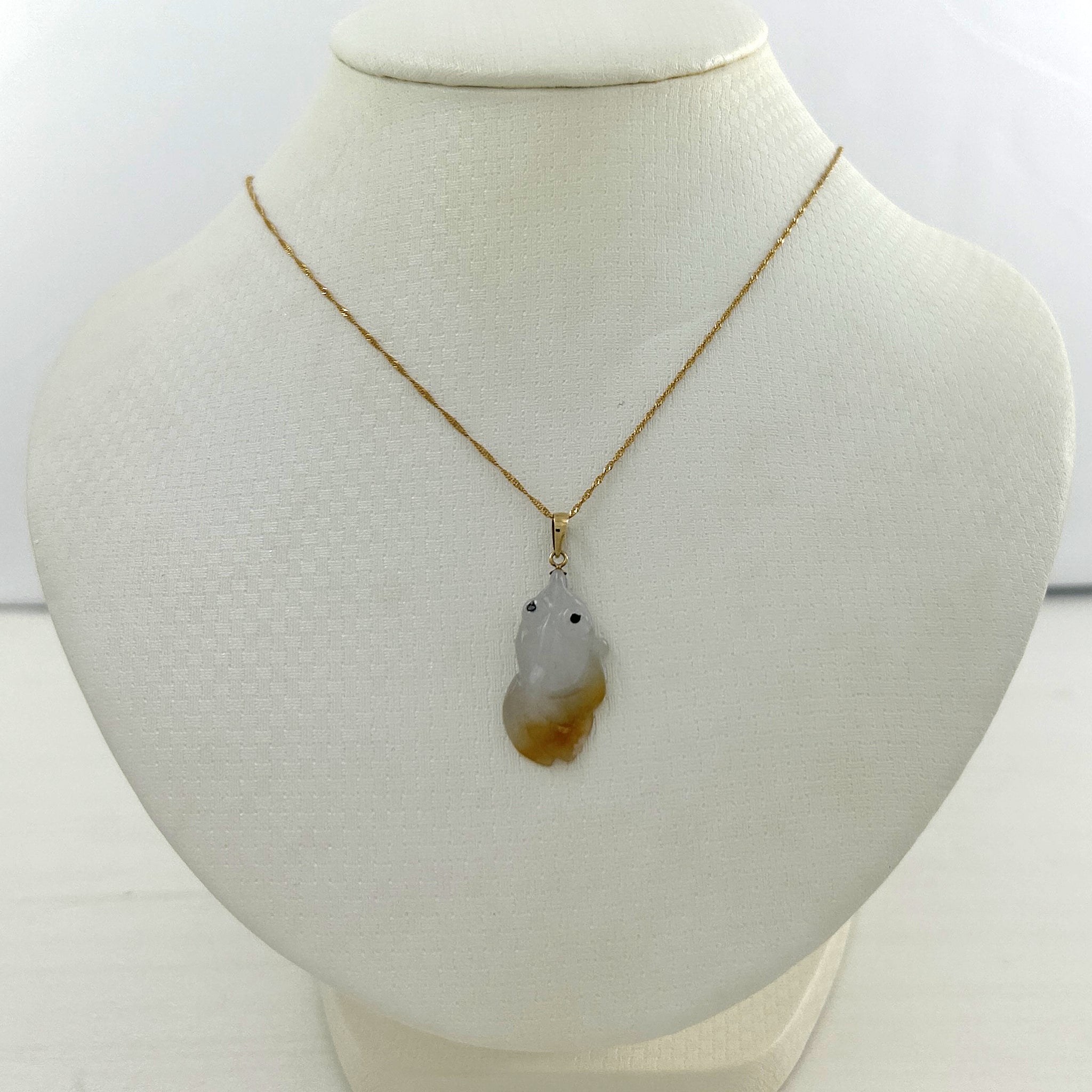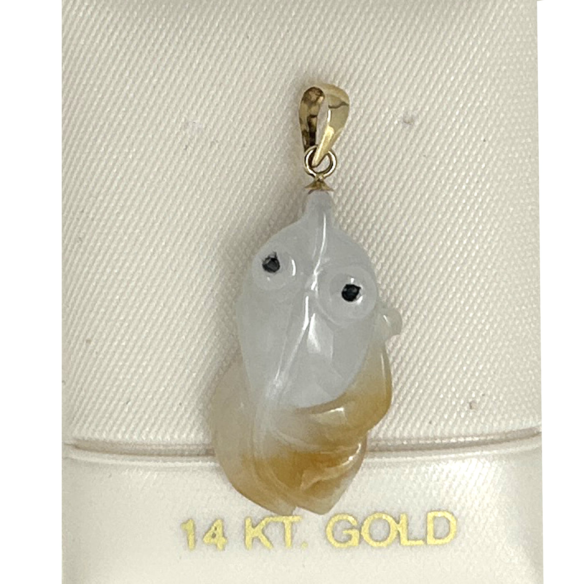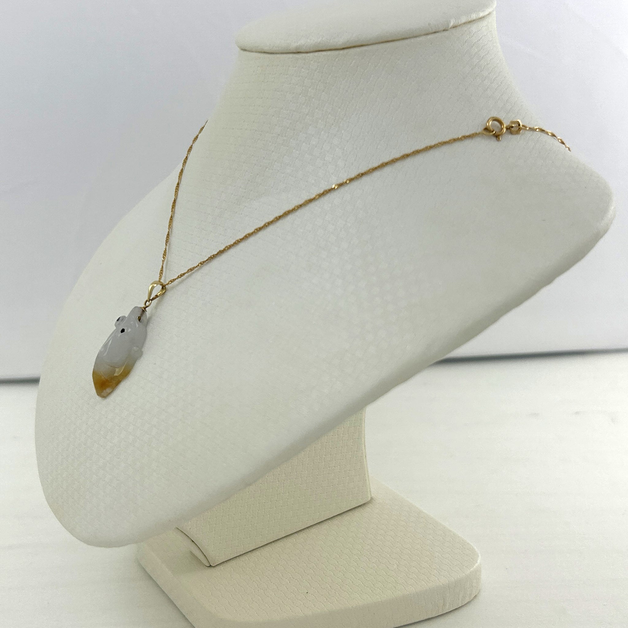 A delicate white jadeite slab is handcrafted into a goldfish design and suspended from a 14k yellow gold bale. The crisp white hue and auspicious carving evoke calm and good fortune—perfect for layering or wearing alone.