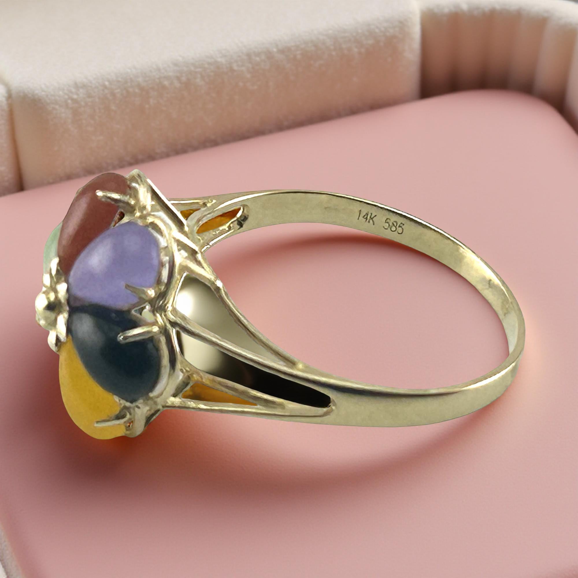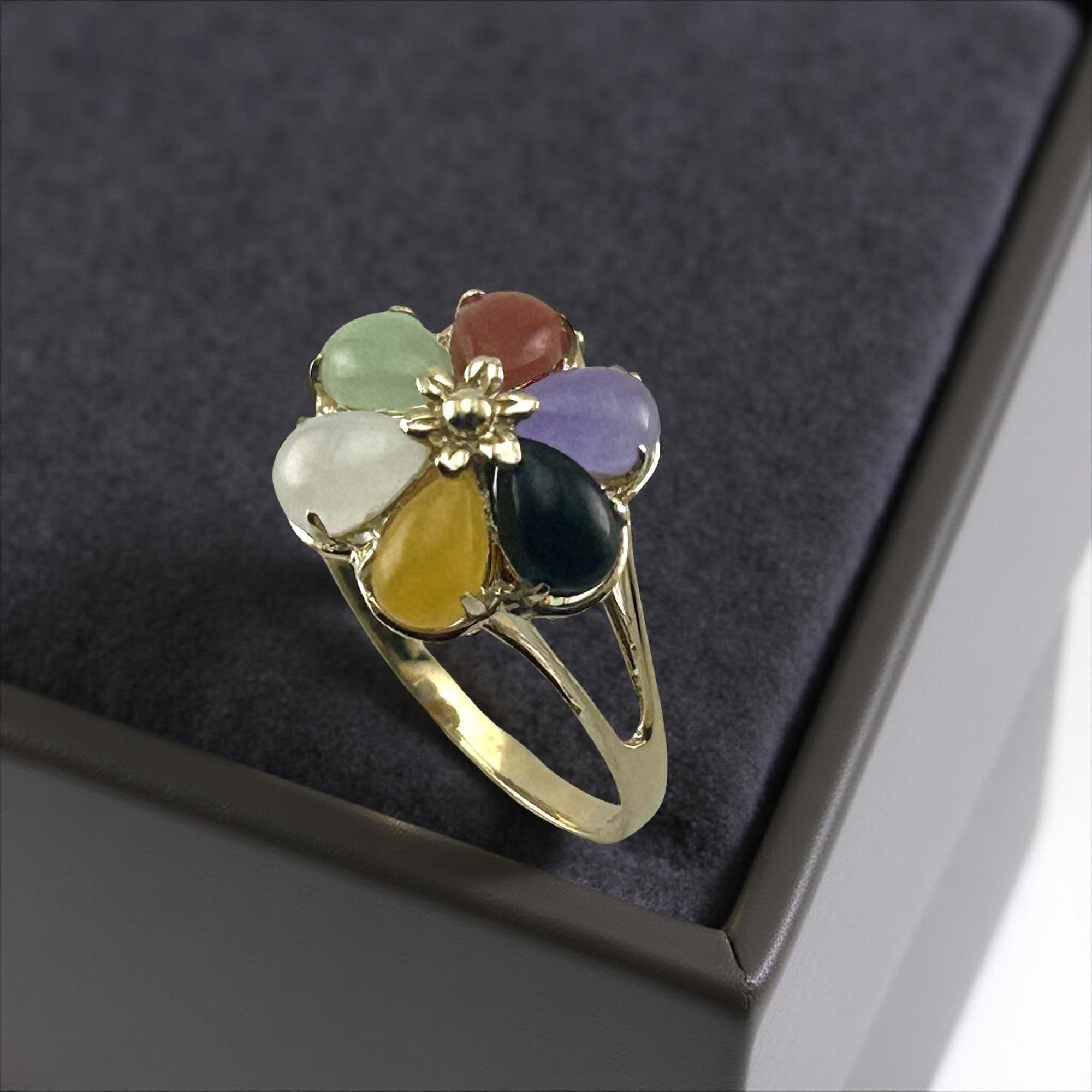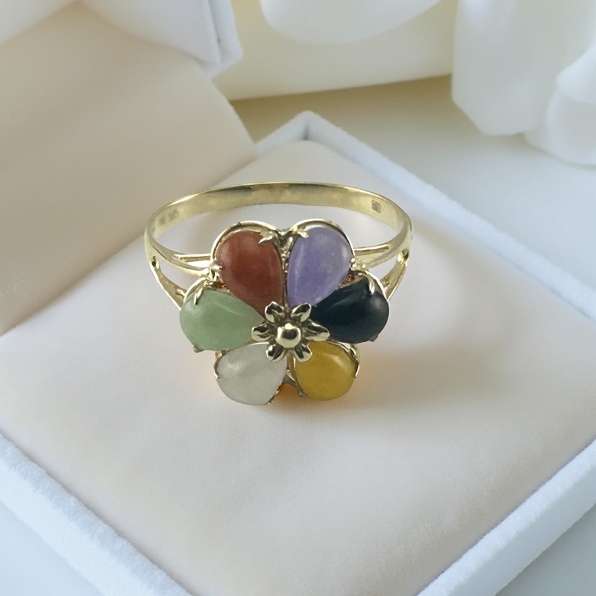 π A beautiful multi-color jade flower ring set in genuine 14K gold (585). Each petal is hand-cut jade in six traditional lucky colors, creating a vibrant floral design that symbolizes harmony and good fortune. The lightweight, elegant band highlights the jade colors beautifully, making it perfect for daily wear or gifting.