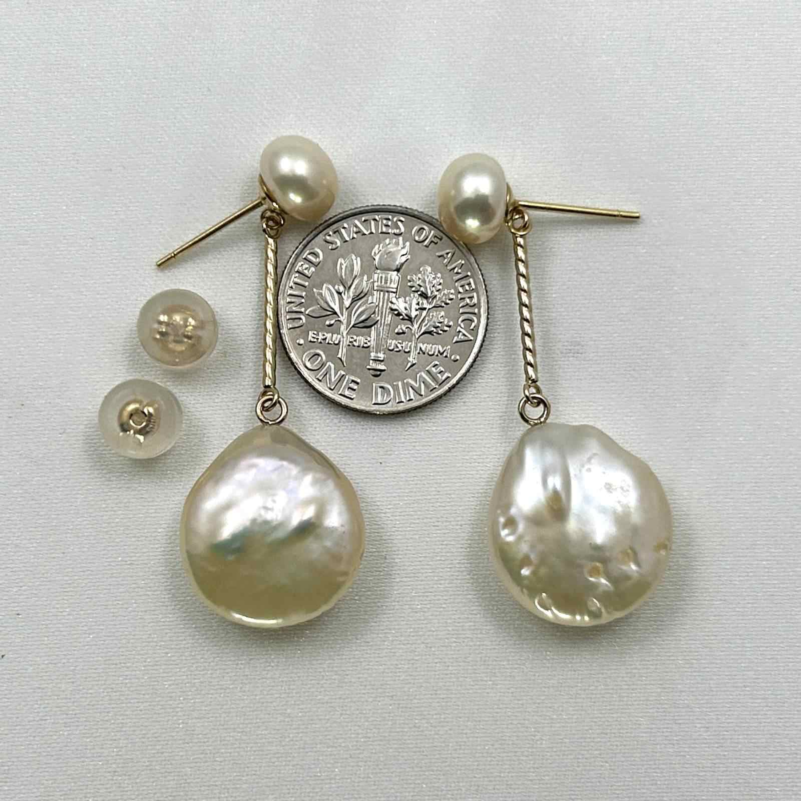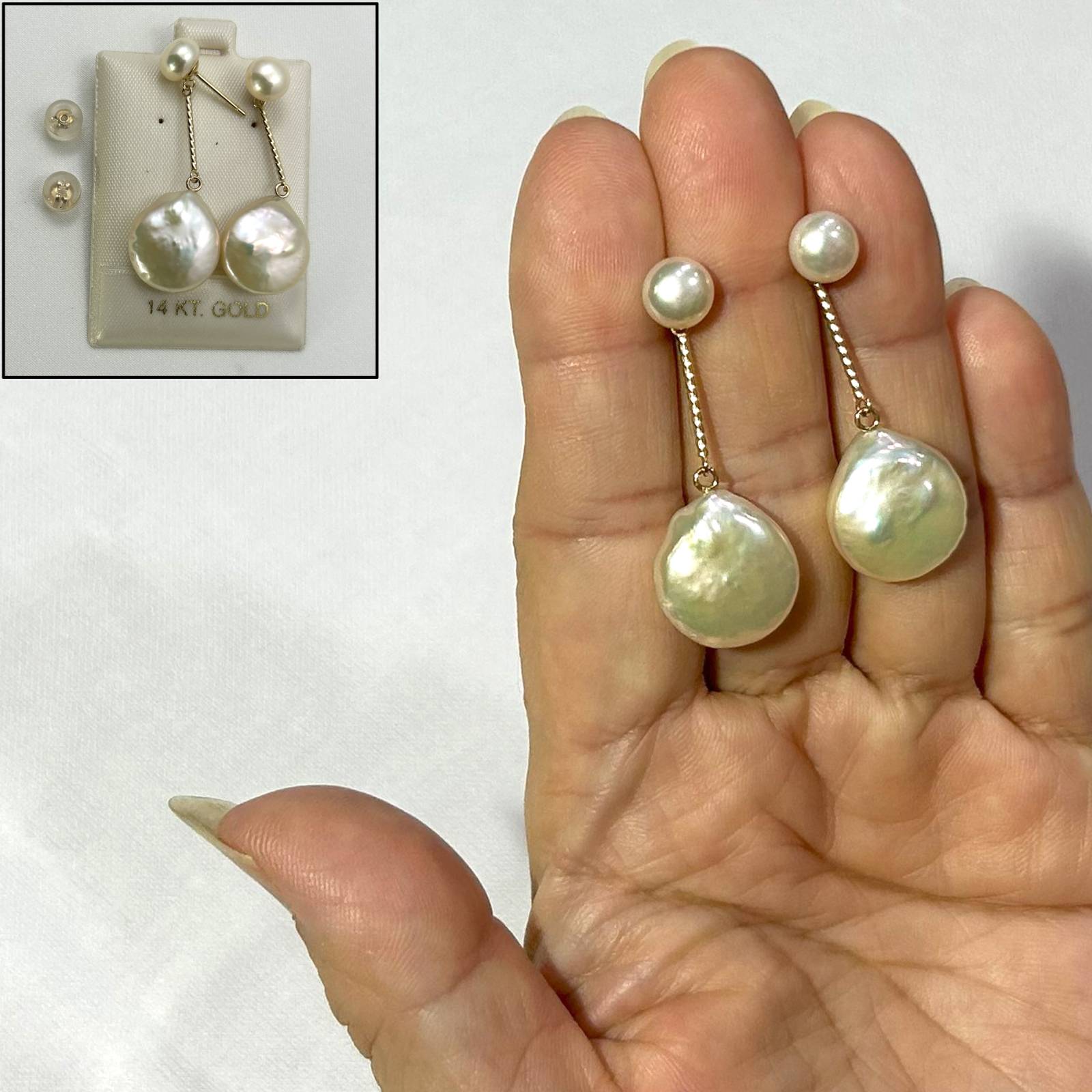 **Real Light Pink Coin Pearl Drop Earrings ā 14 k Yellow Gold**