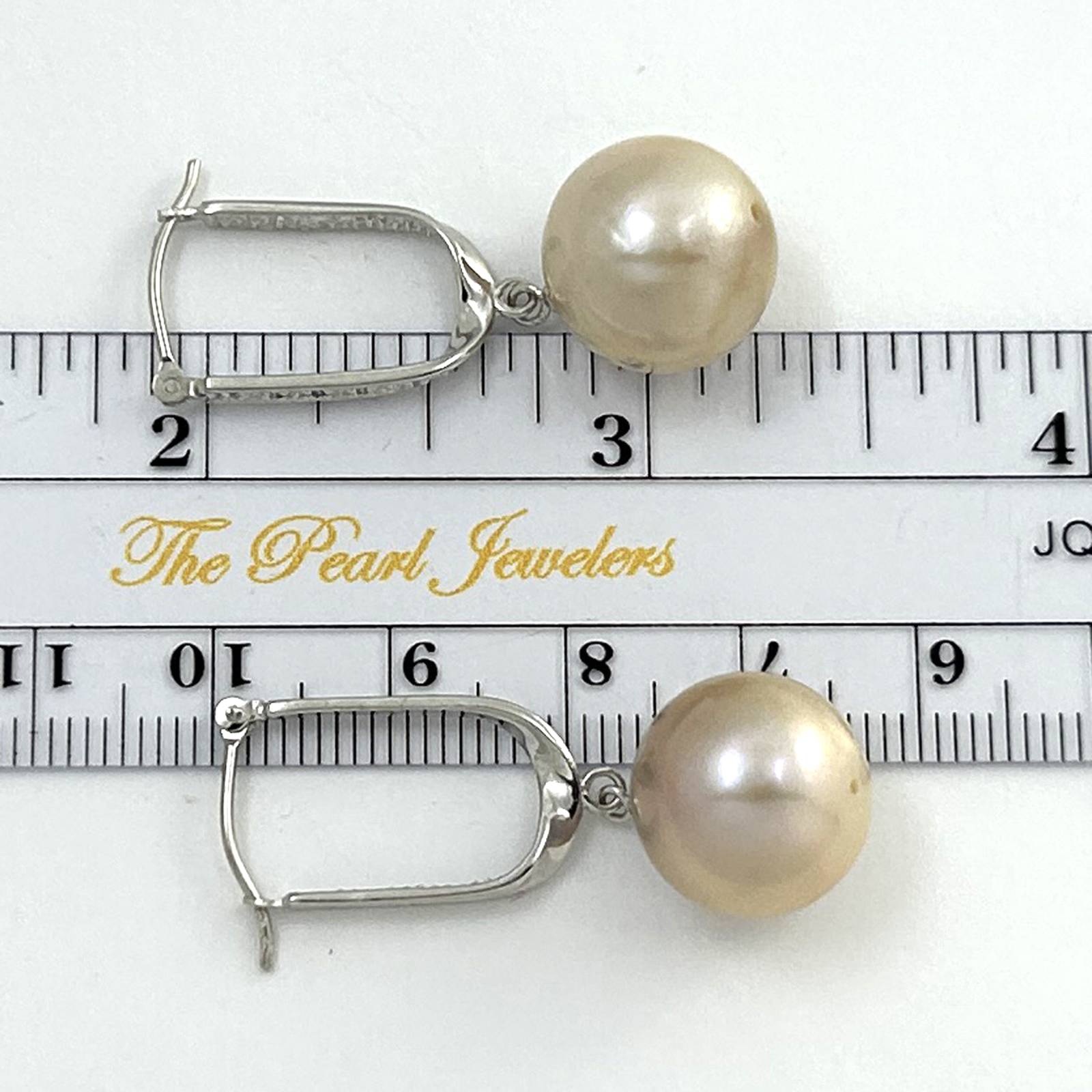 These 13.5mm natural pink pearls dangle from 14K white gold accented with 8 diamonds in a graceful water-flow design.