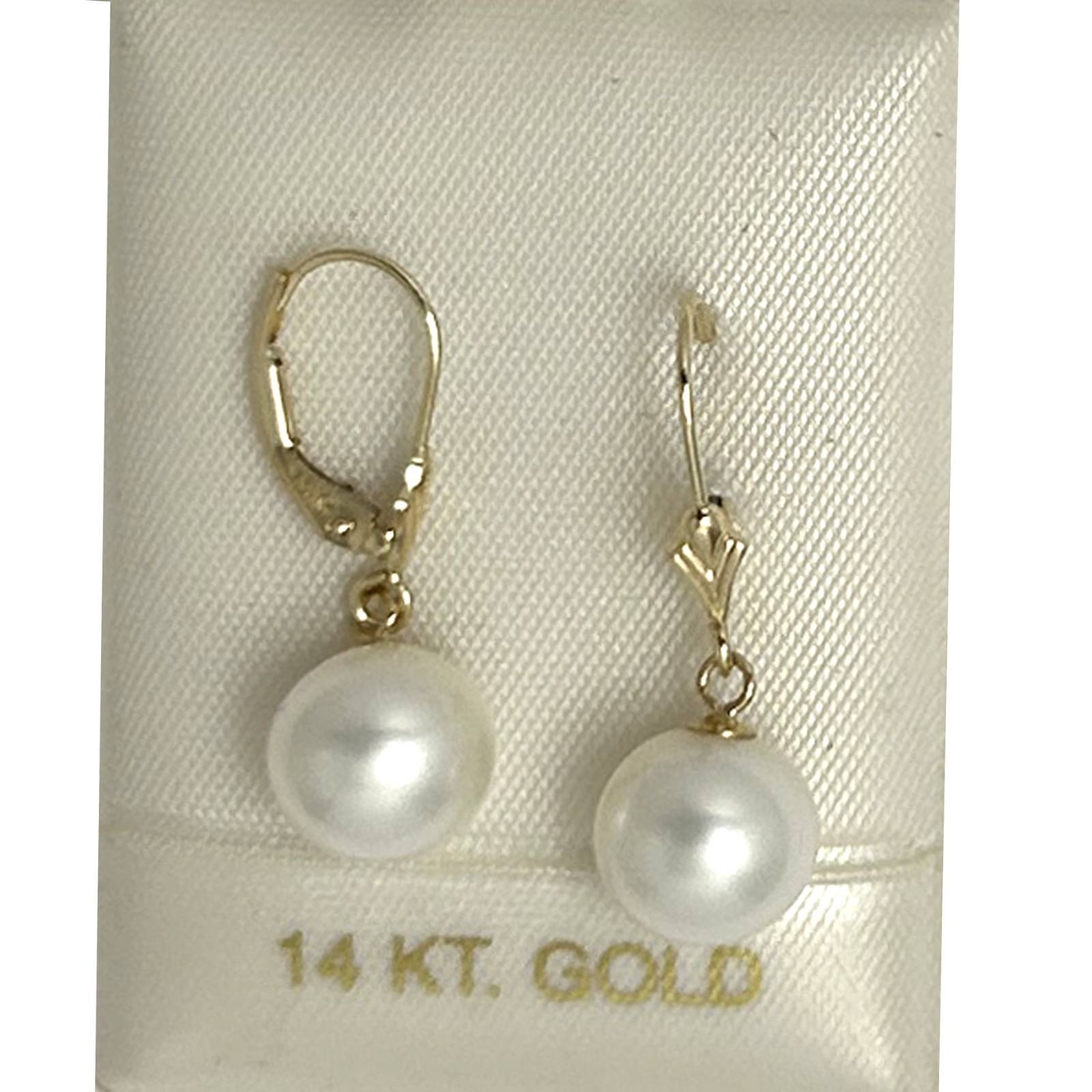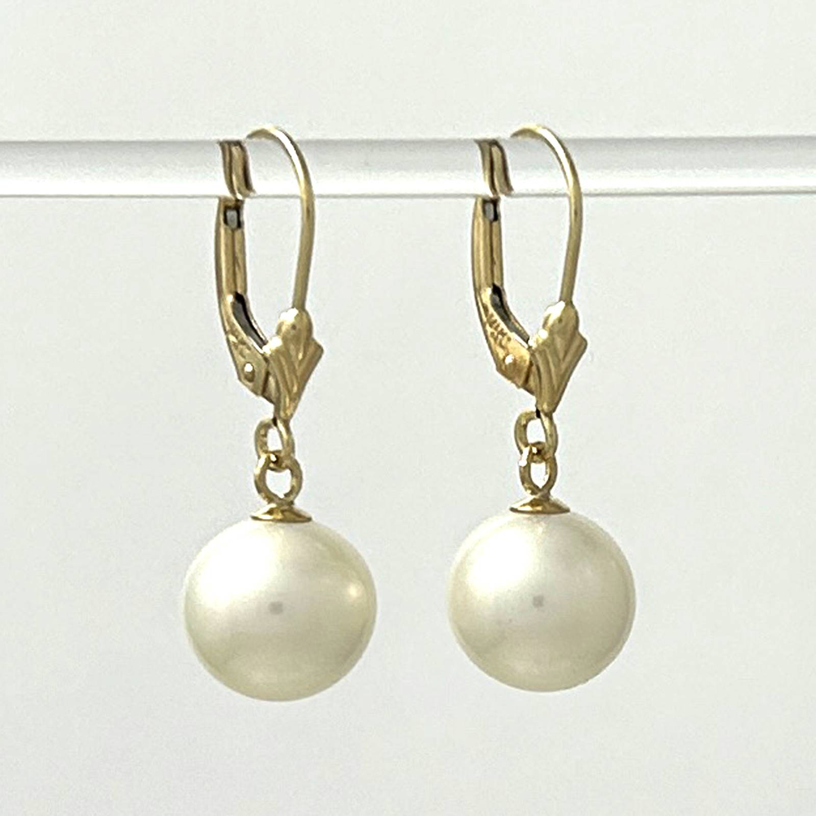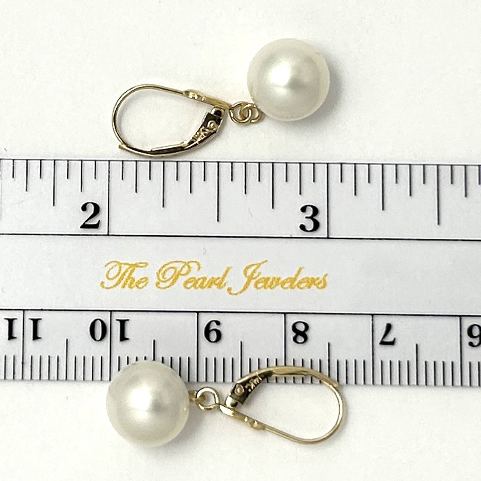 These 9–10mm round white pearls hang from solid 14K yellow gold leverbacks—refined, lightweight, and perfect for daily or bridal wear.