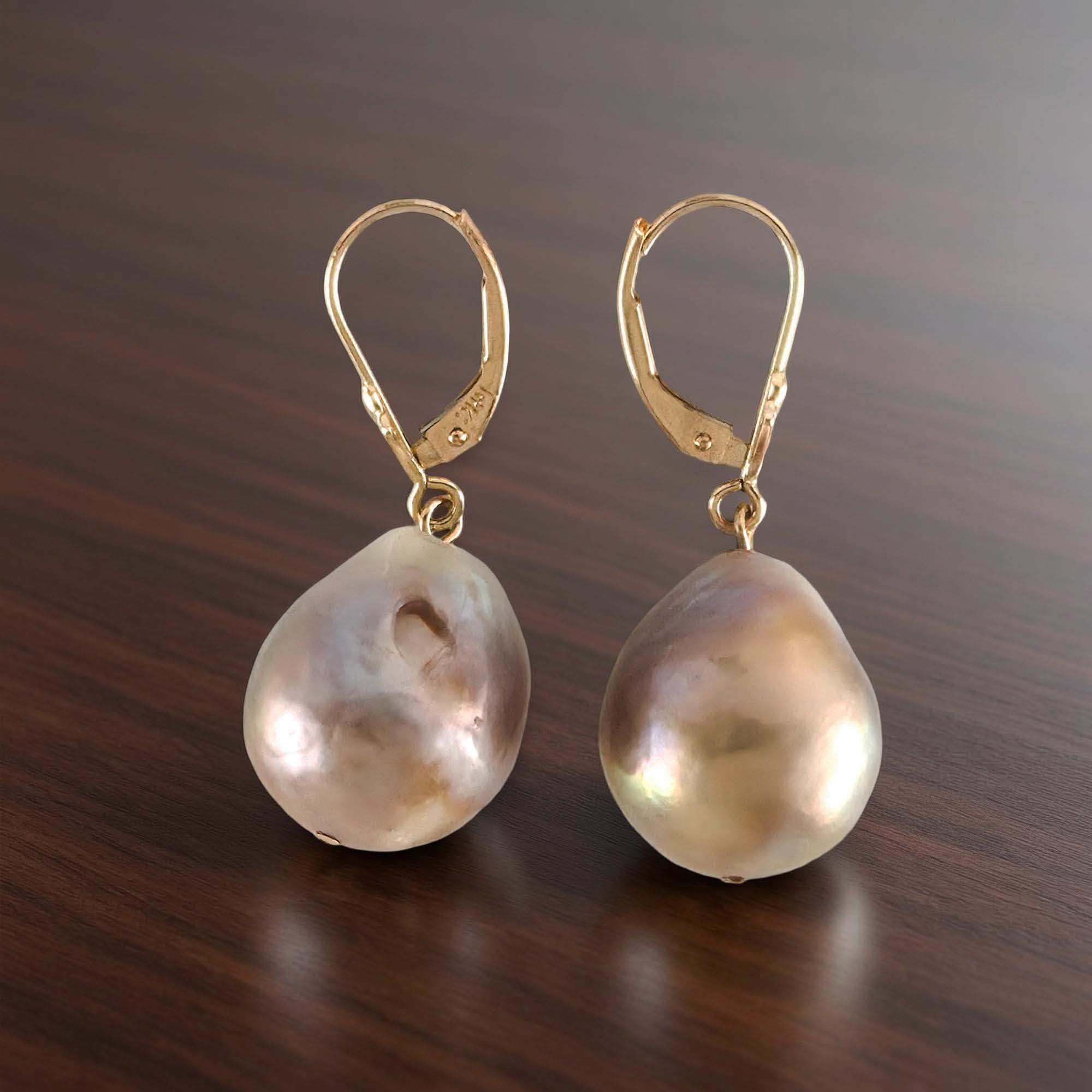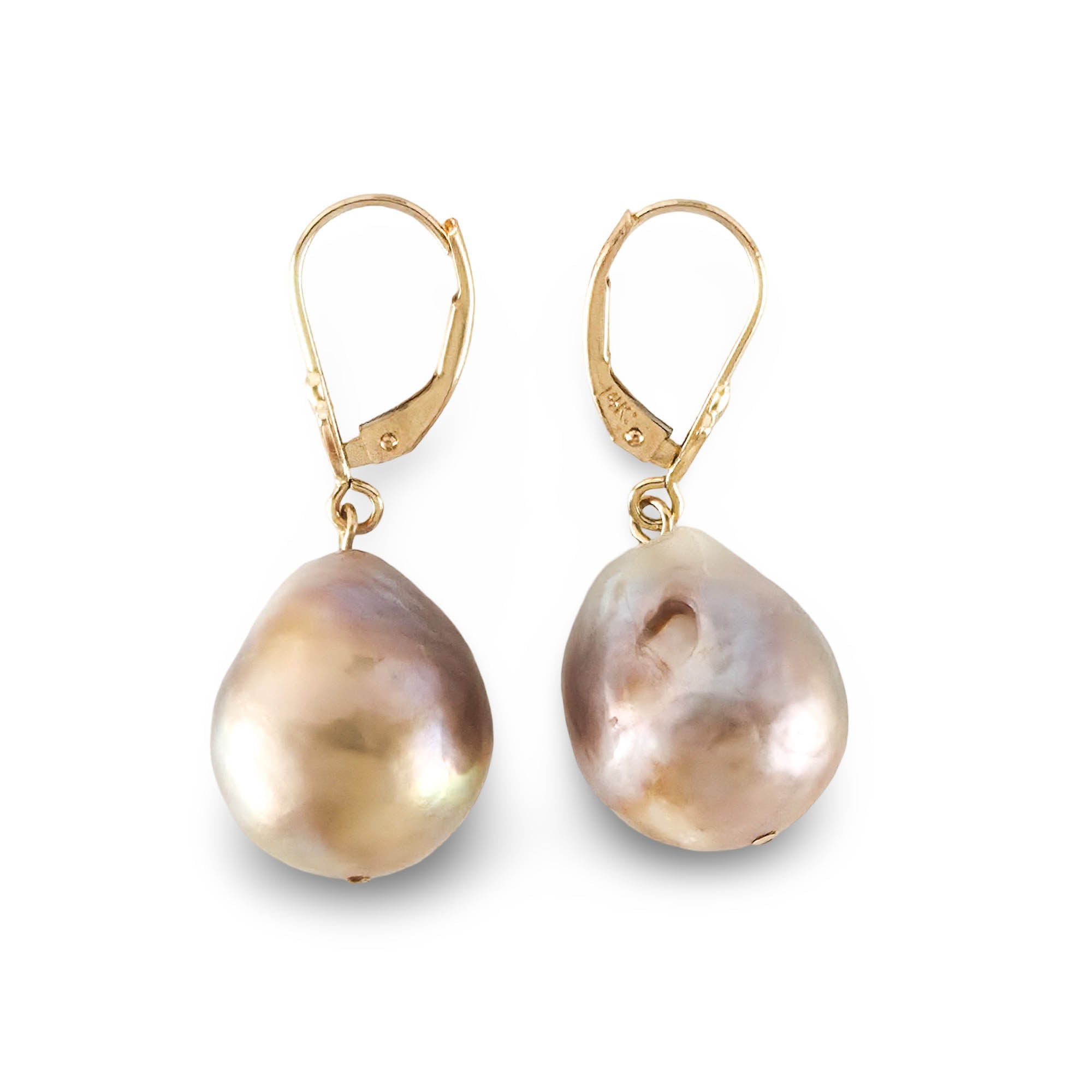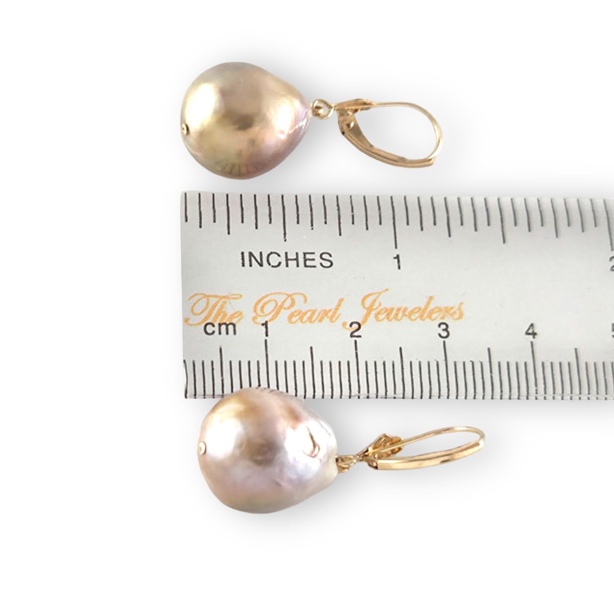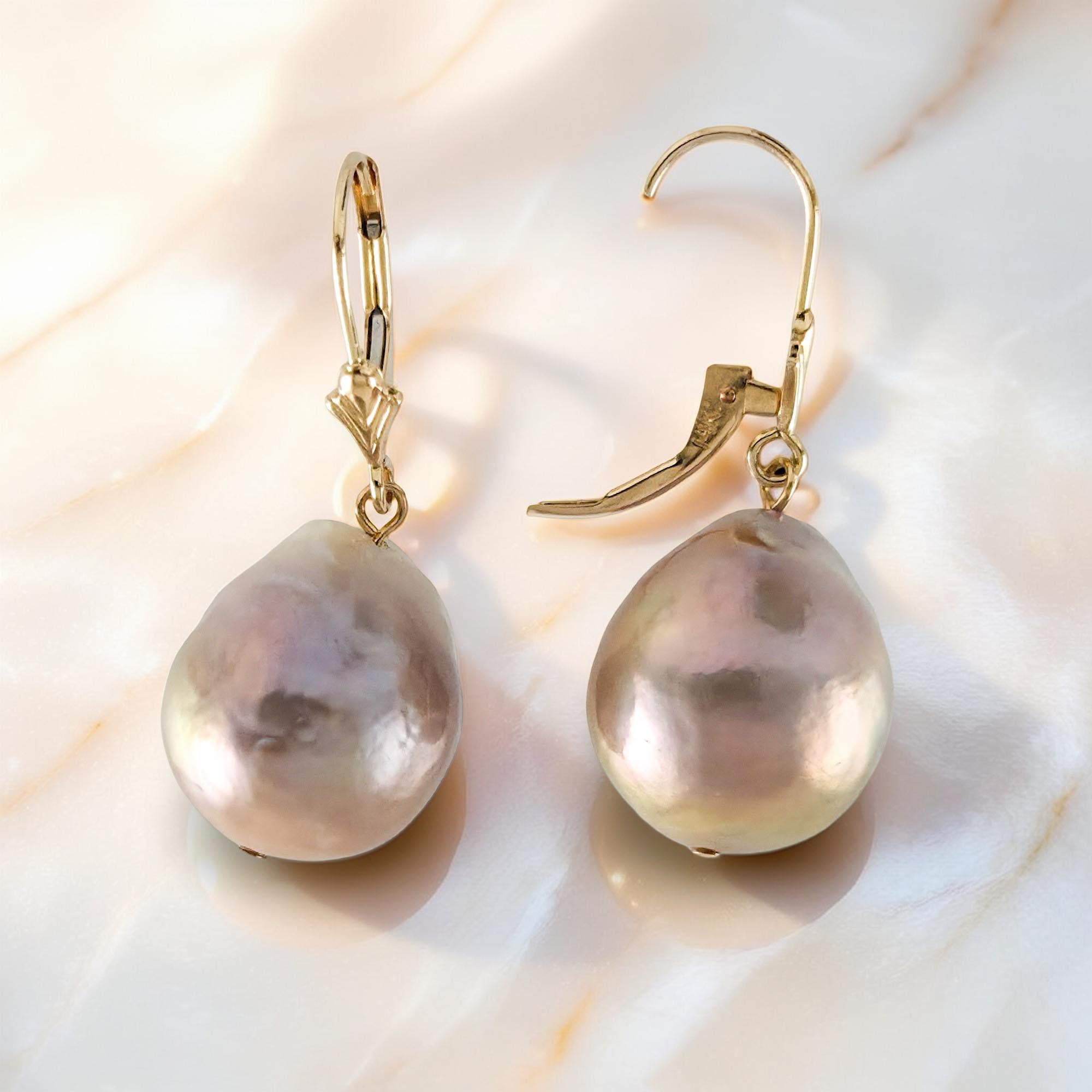These dangle earrings feature genuine 13–15 mm nucleated cultured baroque lavender pearls suspended from solid 14k yellow gold leverback closures for a luxurious pop of color. Designed for comfort and dependable daily wear.