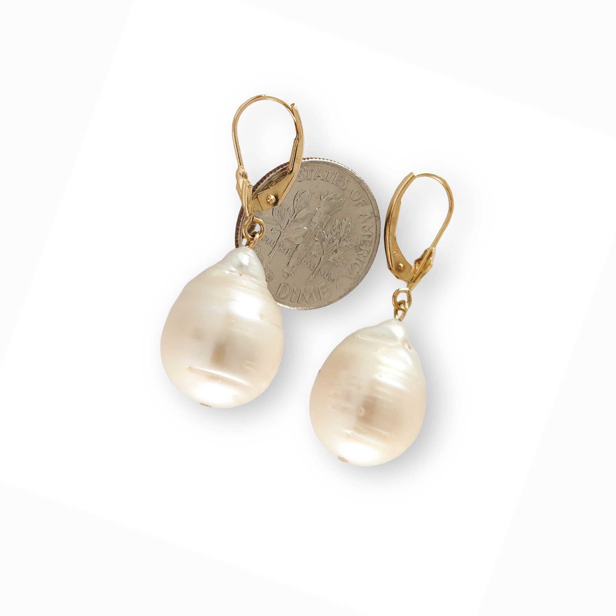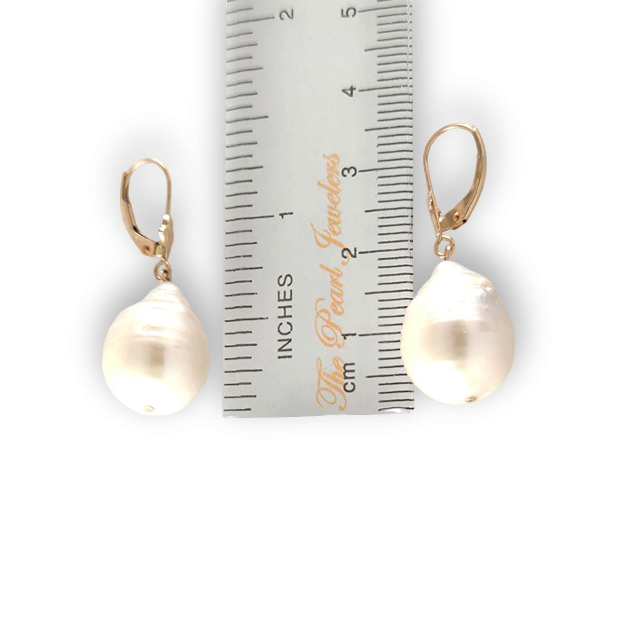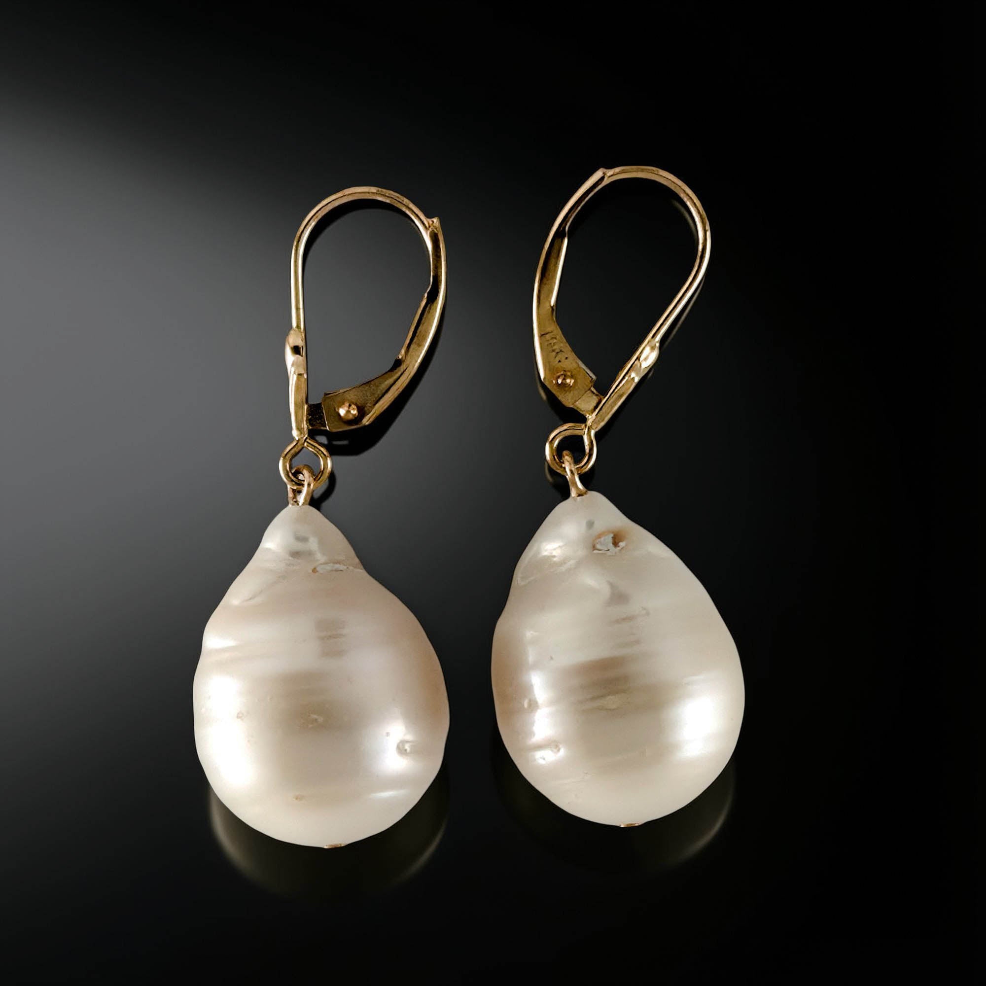 These dangle earrings feature genuine 13 mm nucleated cultured baroque pearls on solid 14k yellow gold leverback closures for a luxurious, organic drop. Designed for comfort and dependable daily wear.