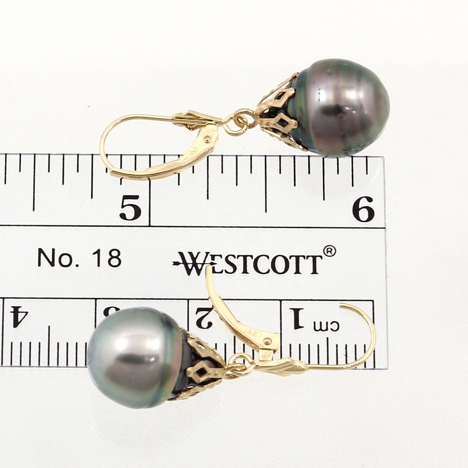 Deep black‑green baroque Tahitian pearls (~10.9 mm) with subtle ringed textures are nestled in solid 14k yellow gold cap leverbacks, merging organic artistry with tropical luxury.