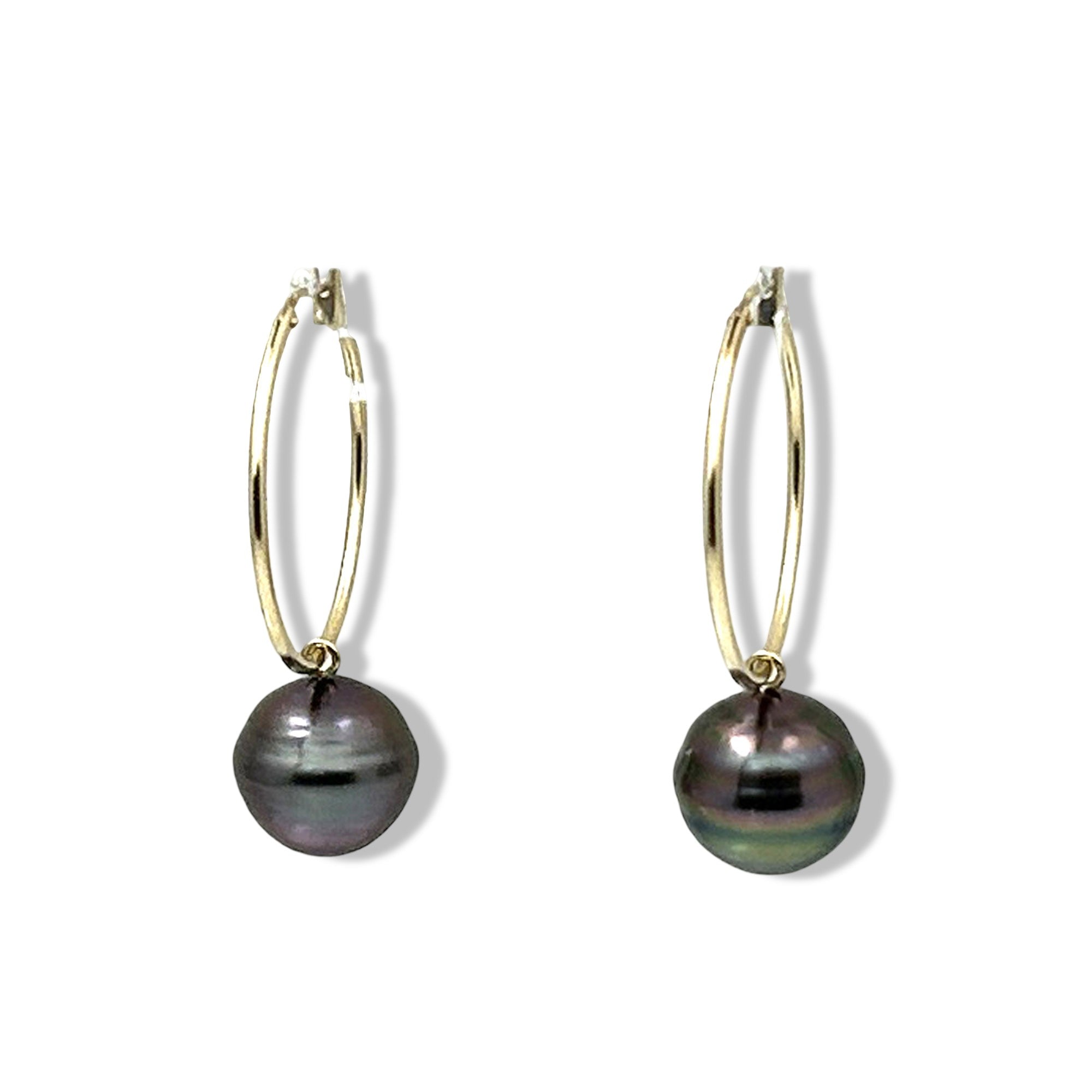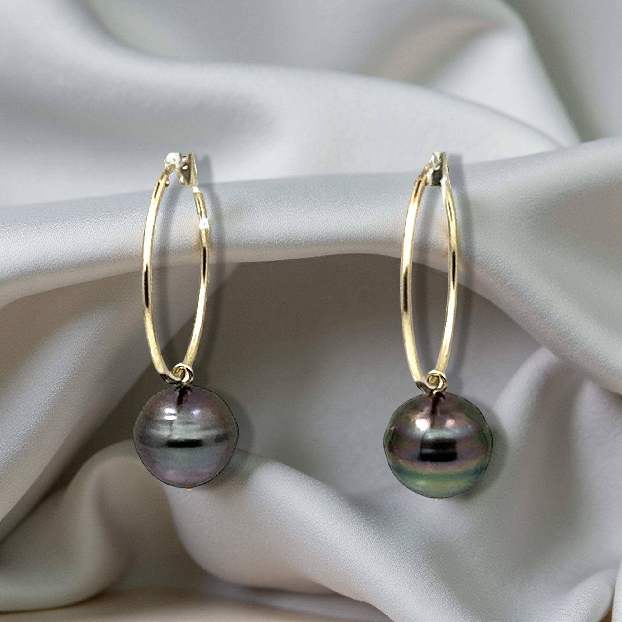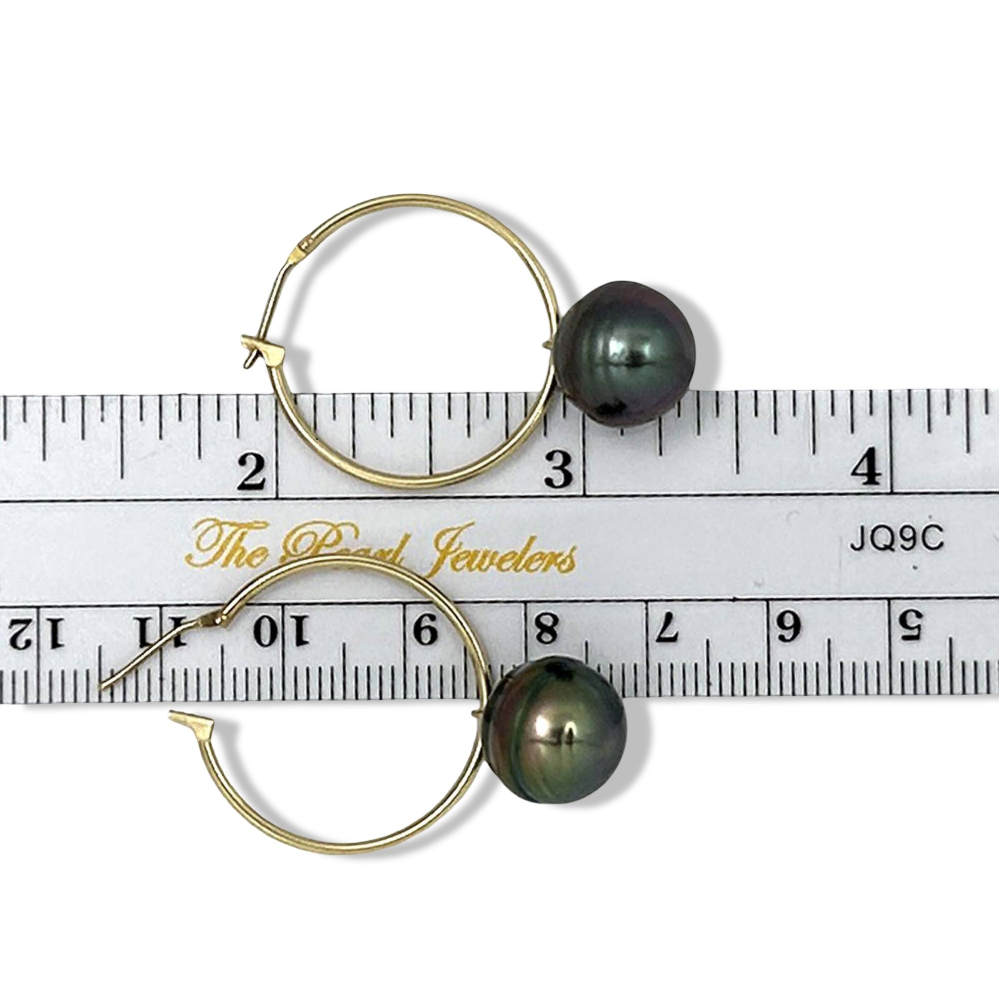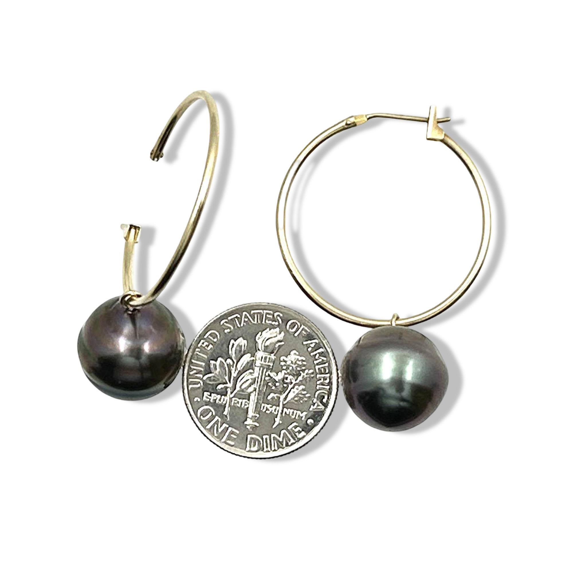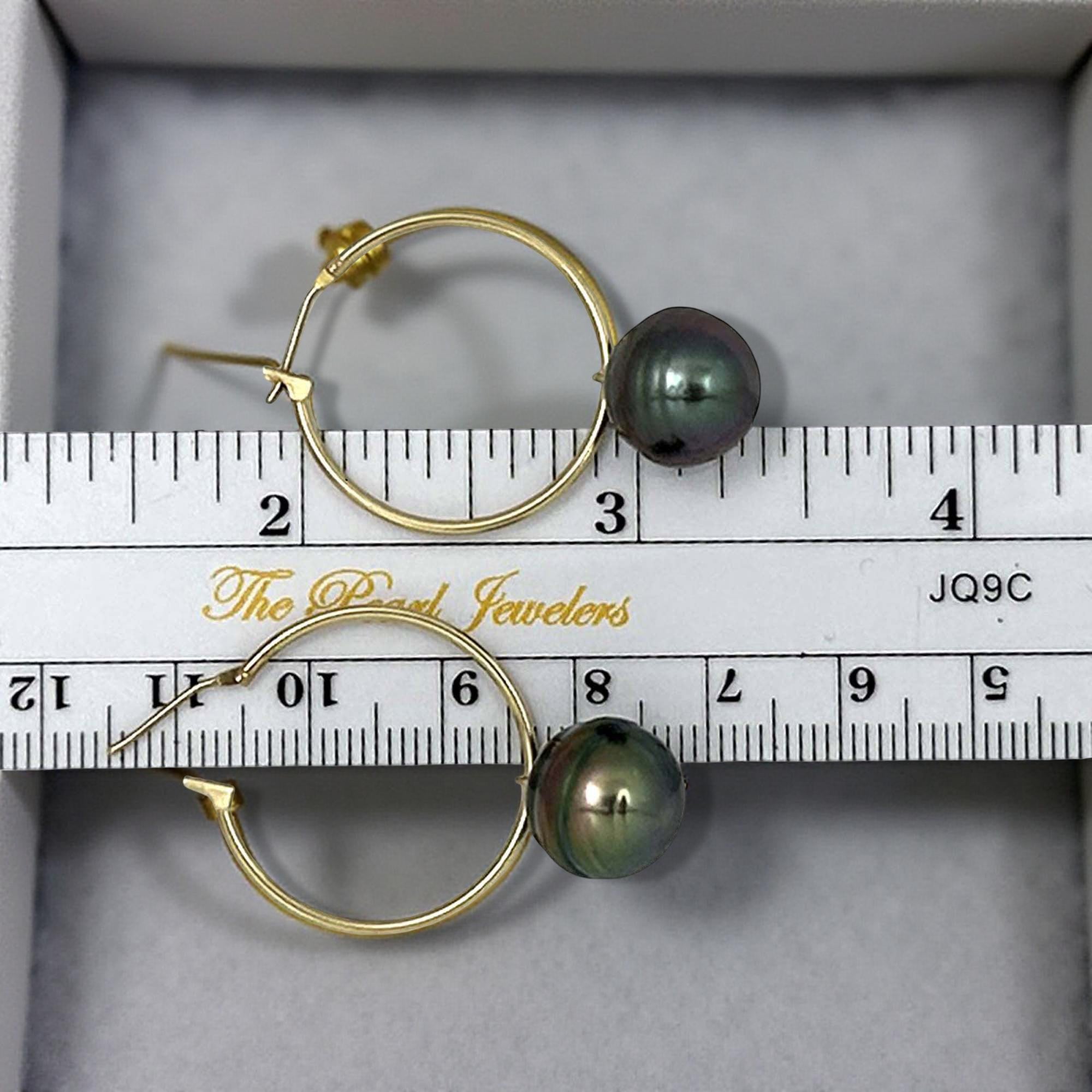 Unique baroque 12.1 mm black‑peacock Tahitian pearls hang from 25 mm solid 14k yellow gold U‑hoops, their iridescent overtones dancing in vivid hues, designed for comfort and dependable daily wear.