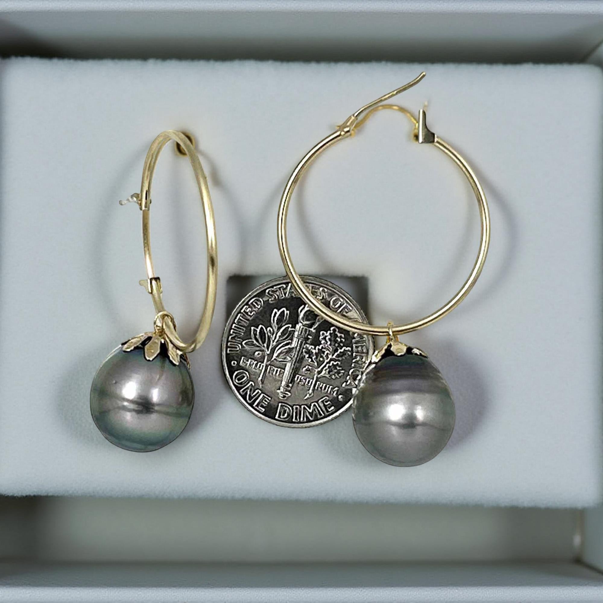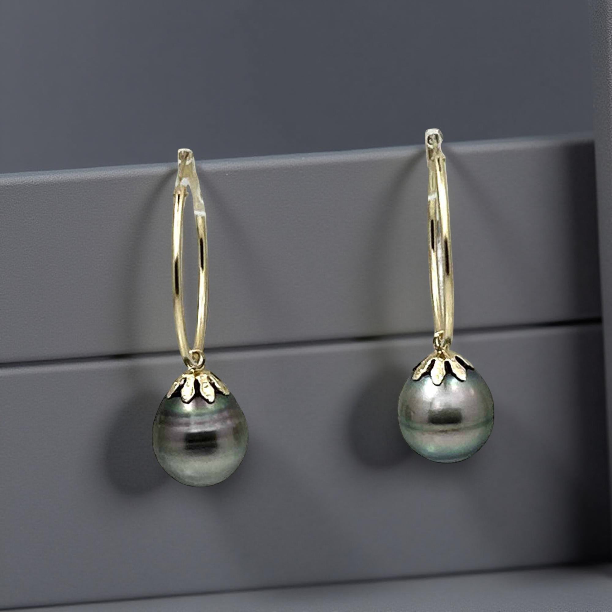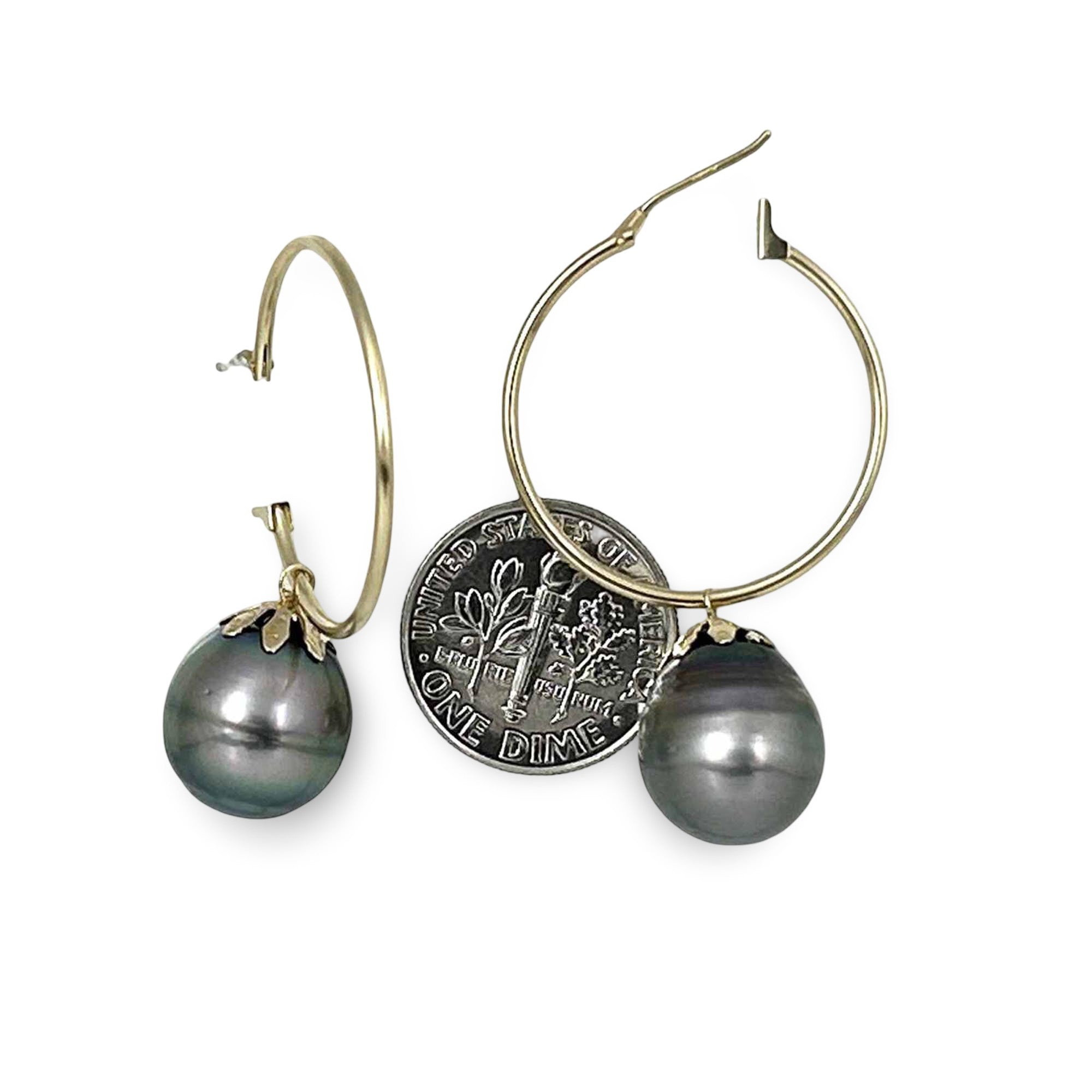 Ringed Teardrop Tahitian Pearl Hoop Earrings – 14k Yellow Gold