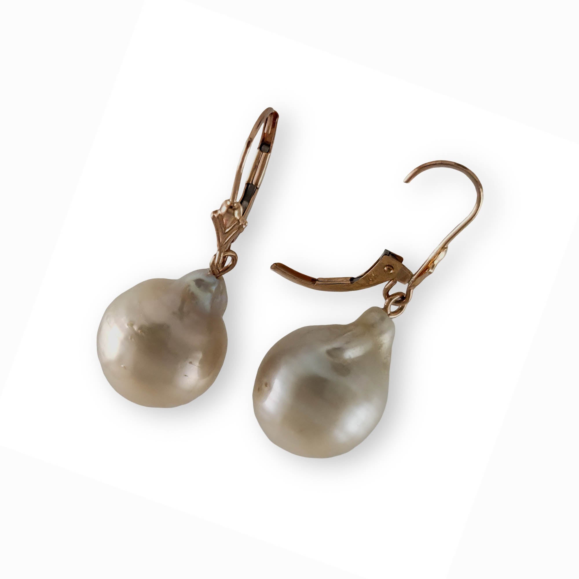 These earrings present genuine 12.3 mm nucleated cultured baroque pearls on solid 14k rose gold leverback closures for a refined, organic drop. Designed for comfort and dependable daily wear.