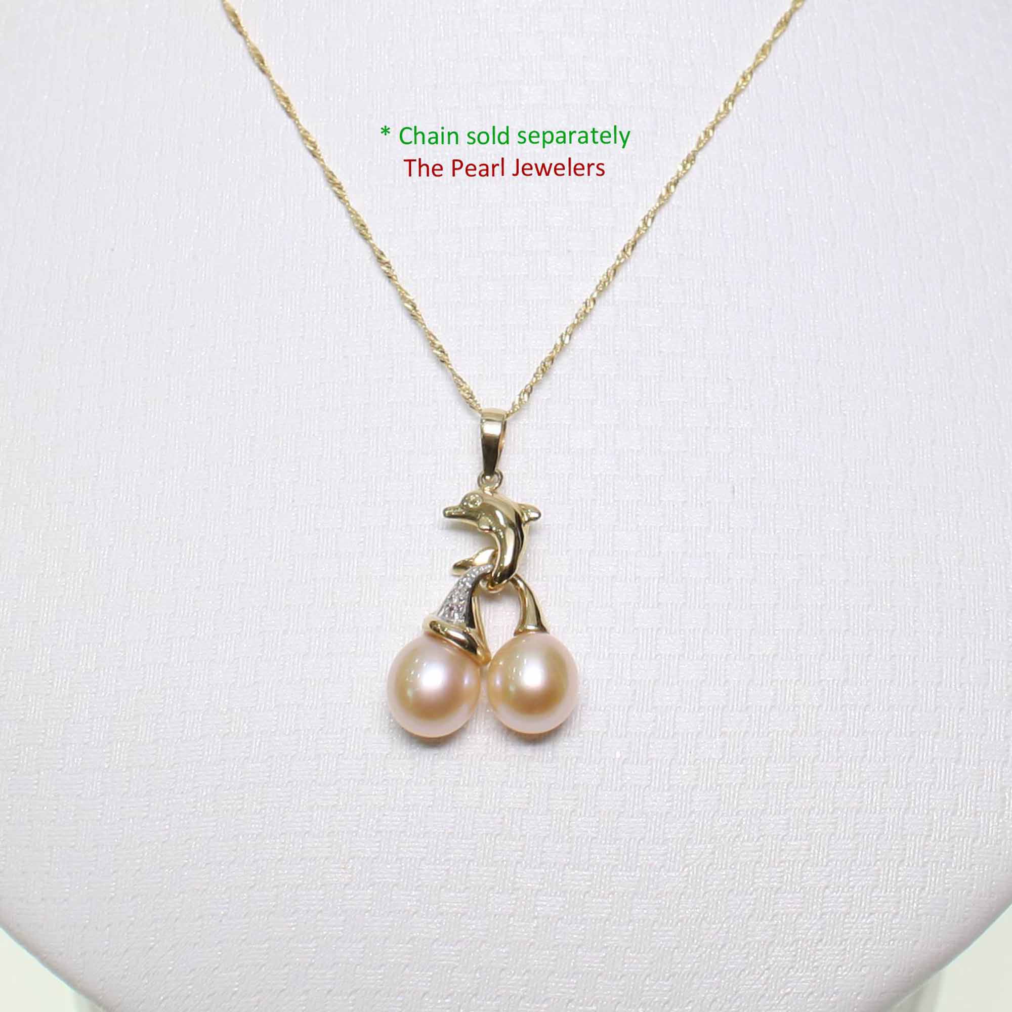 Two natural pink freshwater pearls shine in this solid 14k yellow gold dolphin pendant with diamond. Designed for comfort and dependable daily wear.