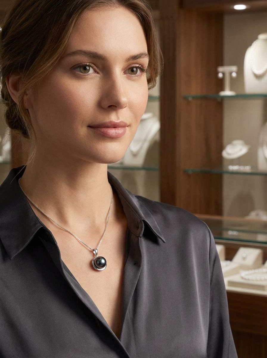 This elegant pendant features a 9–9.5mm black pearl in a 14k white gold encircles designed for comfort and dependable daily wear.