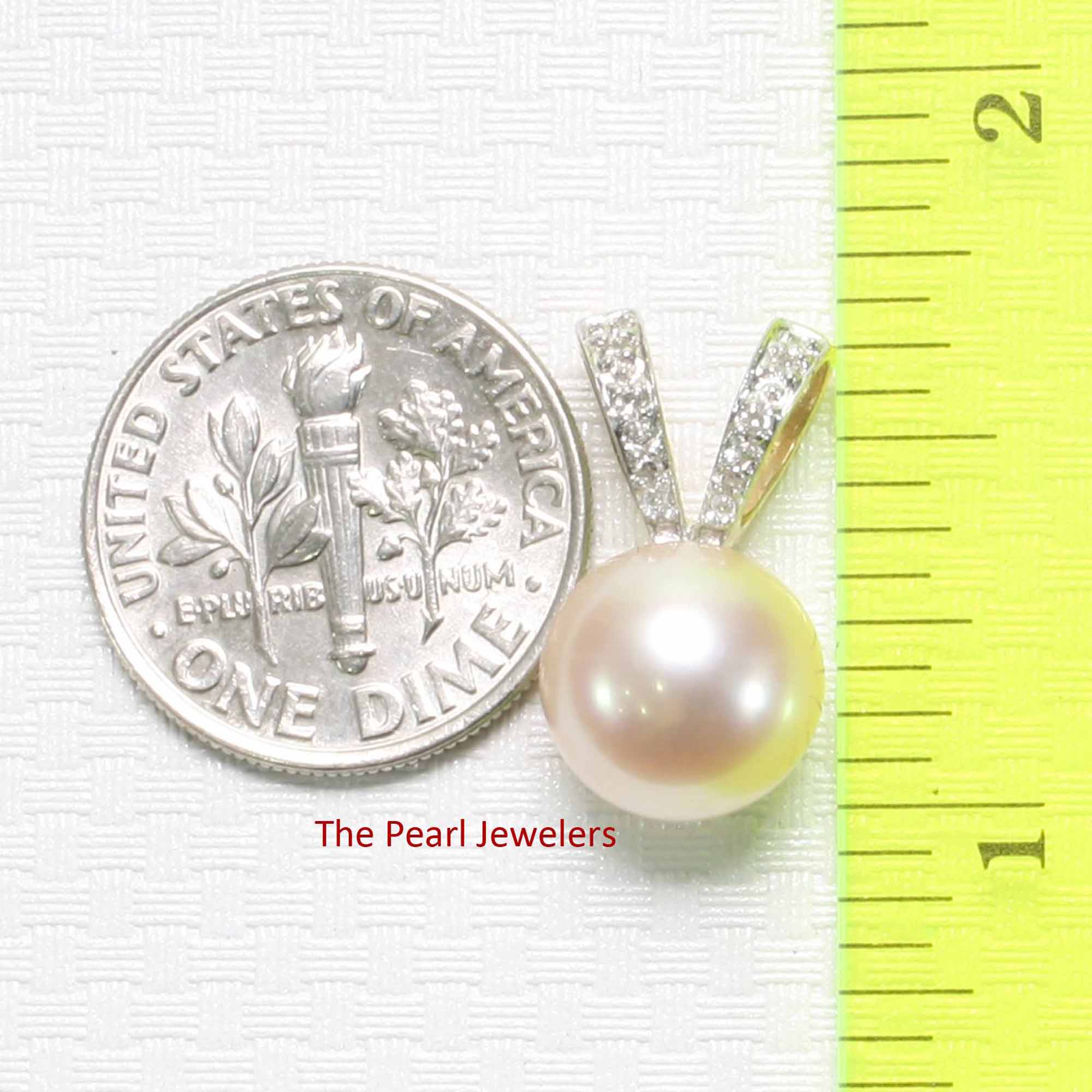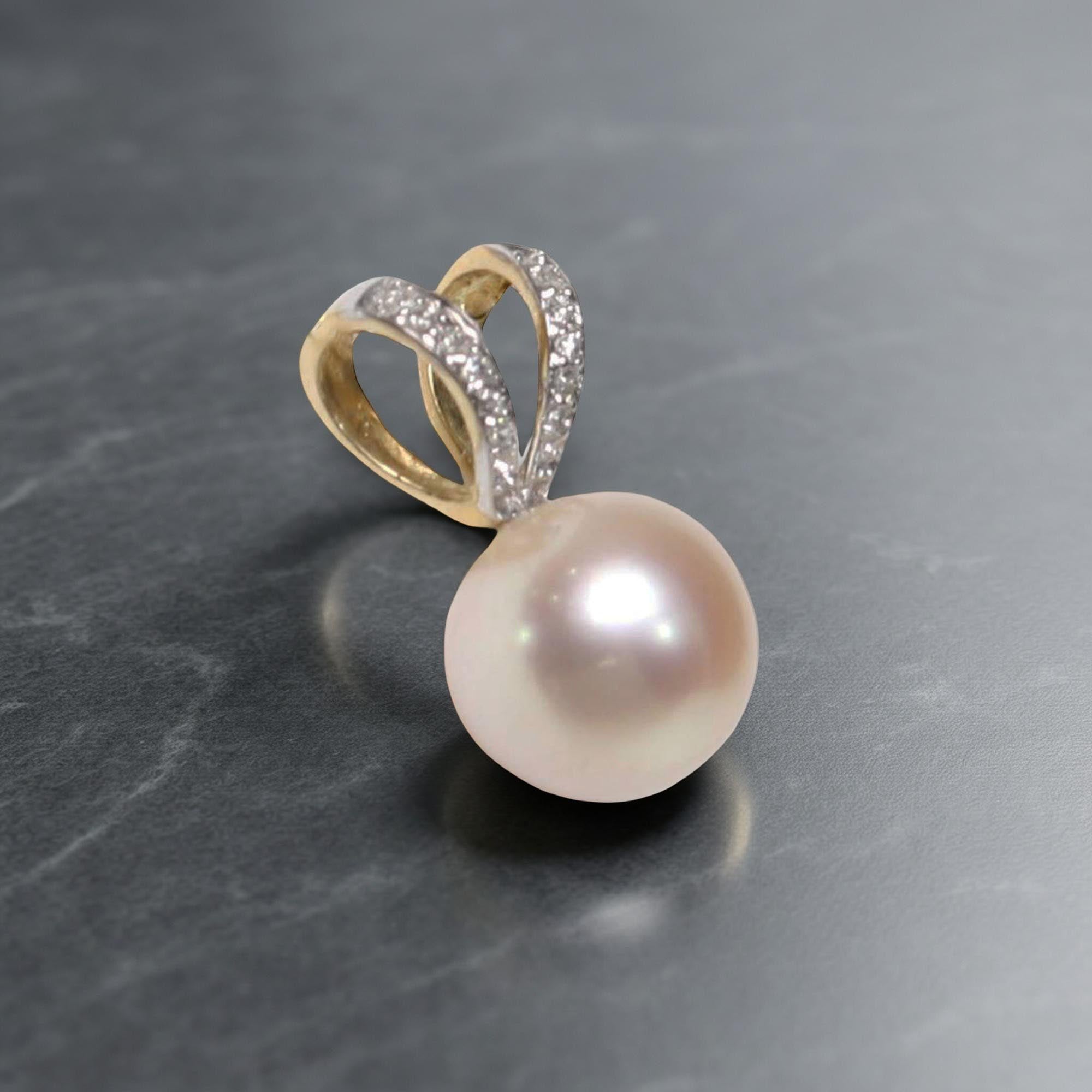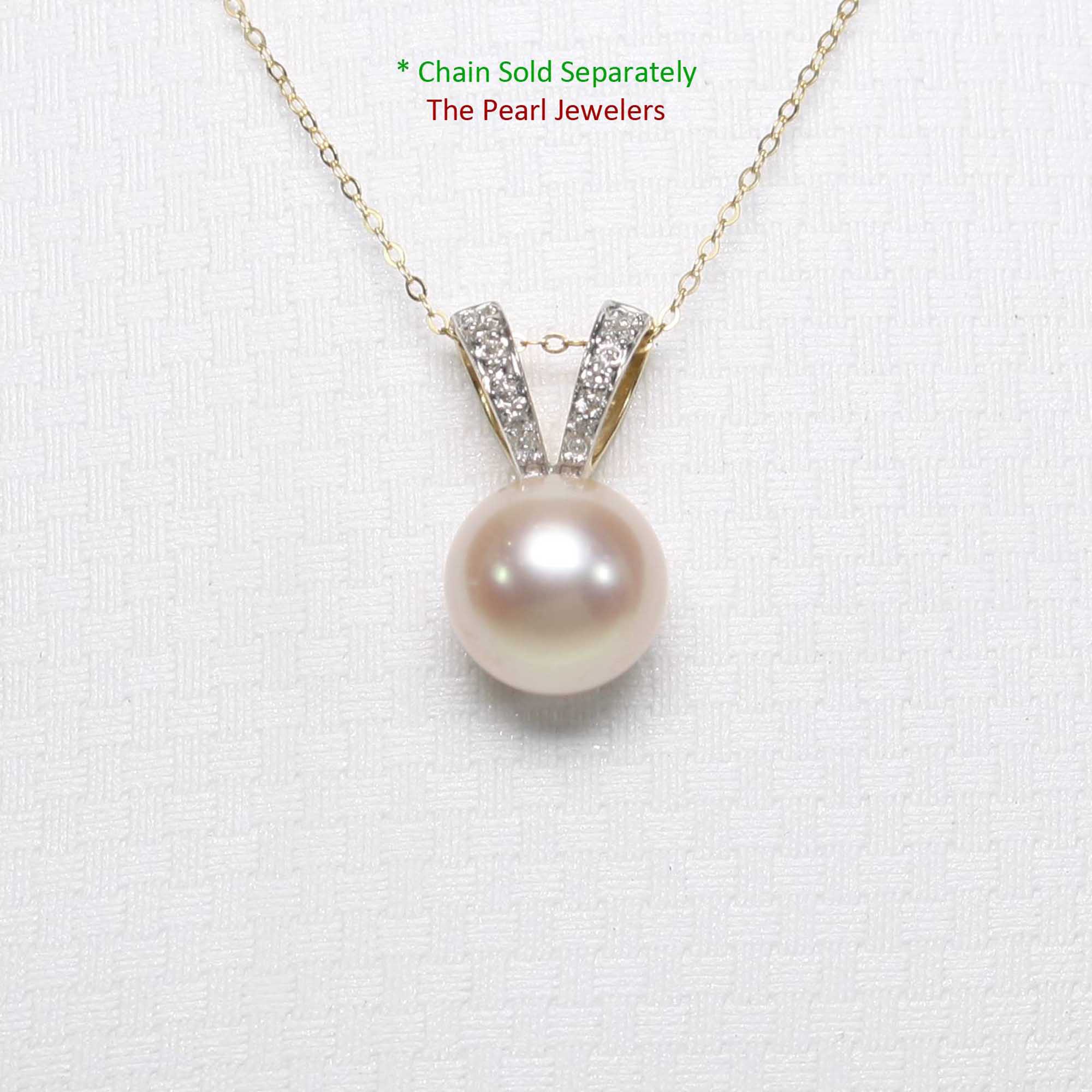 A softly hued 9.5β10mm pink-peach pearl paired with a rabbit-ear 14k yellow gold bail set with six diamonds. Feminine, elegant, and versatile. A thoughtful gift choice and an easy match for casual or dressy looks.