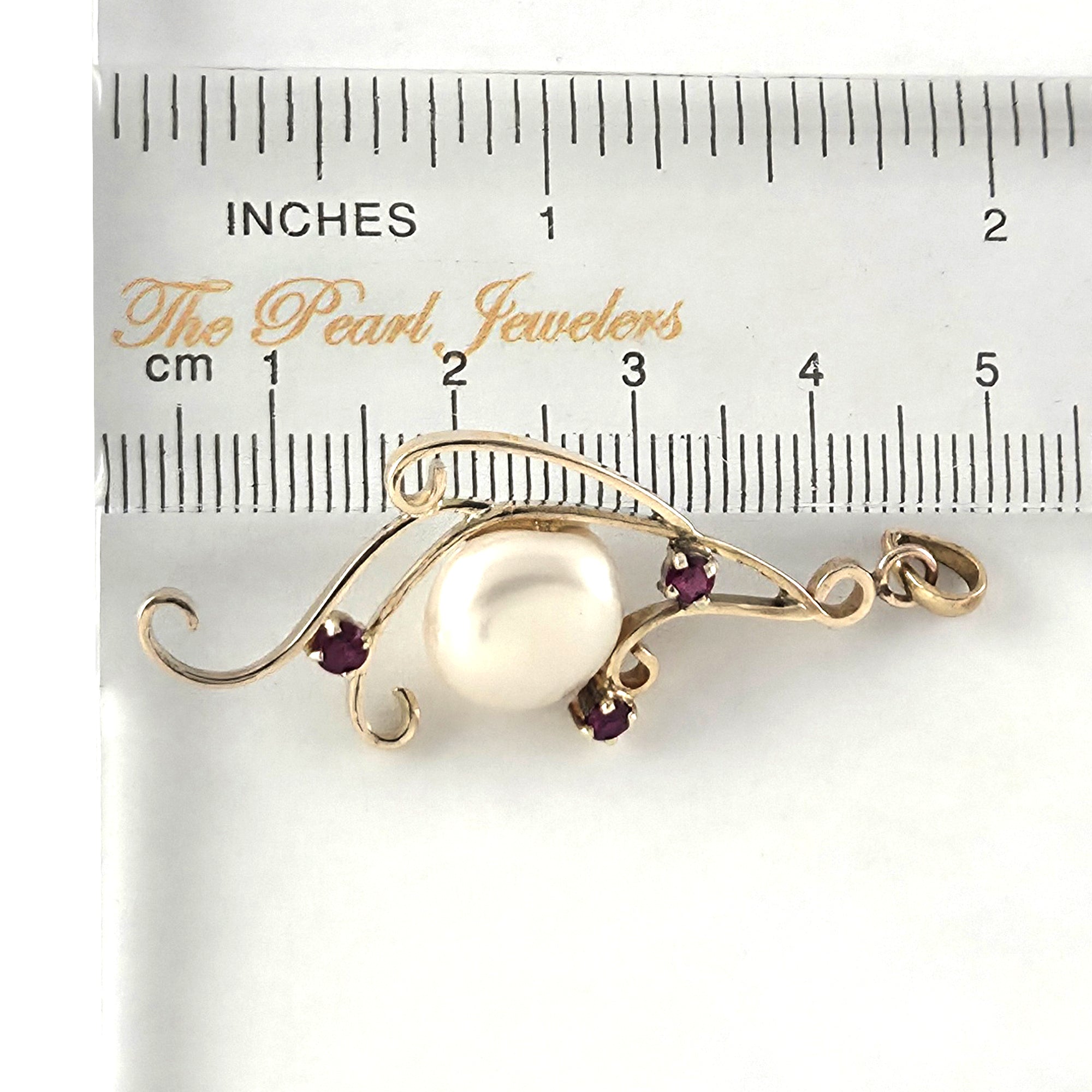 A one-of-a-kind design made pre-1986 featuring a 50mm white baroque pearl accented by three rubies in 14k yellow gold. Designed for comfort and dependable daily wear.