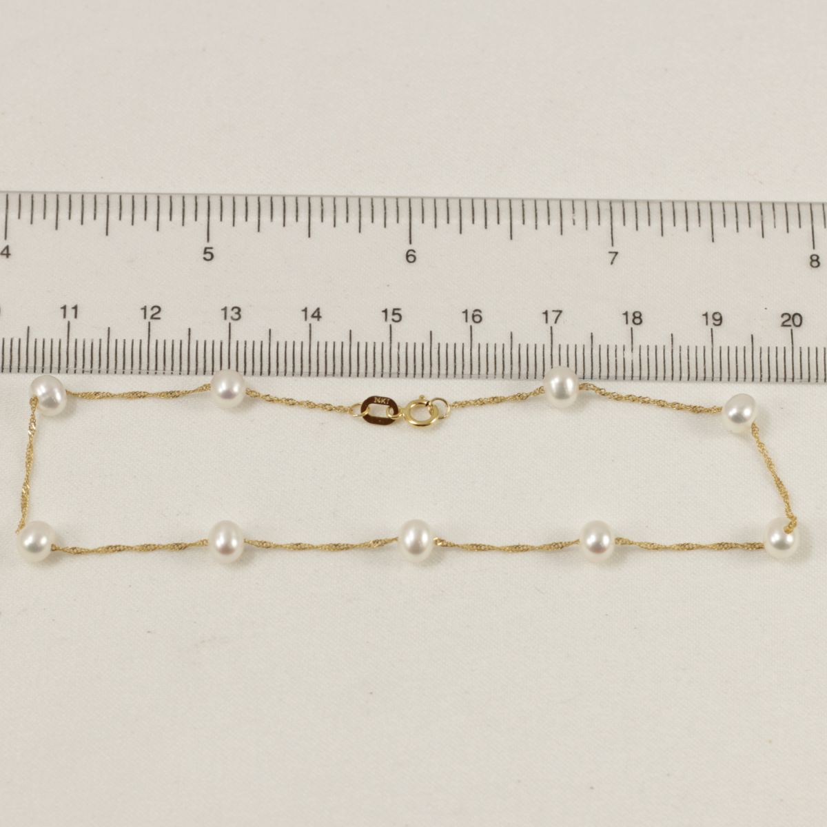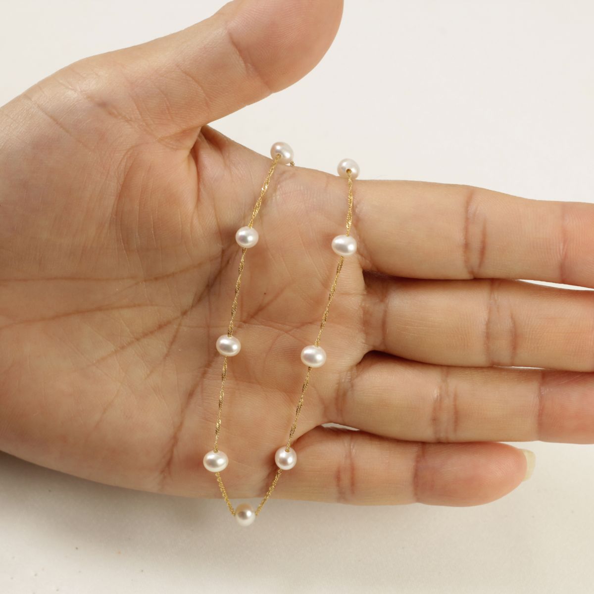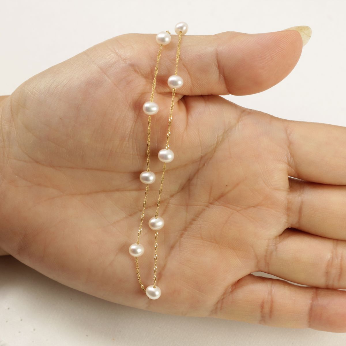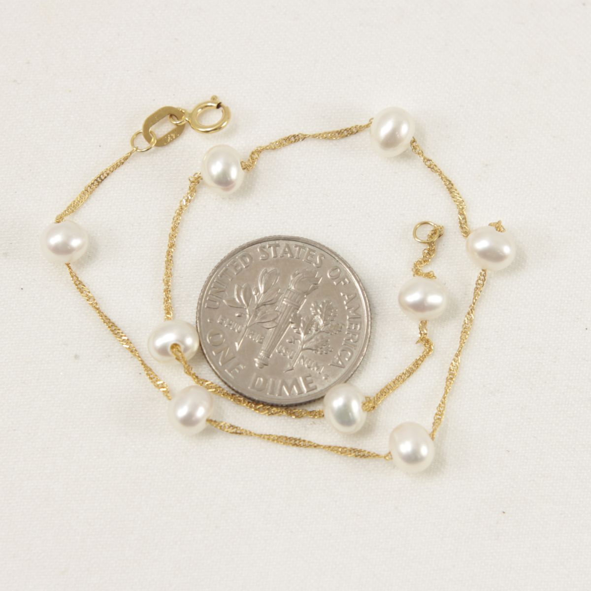 A dainty tin-cup bracelet with nine 4.5β5mm white freshwater pearls, linked on a 14k yellow gold Singapore chain for a refined look.