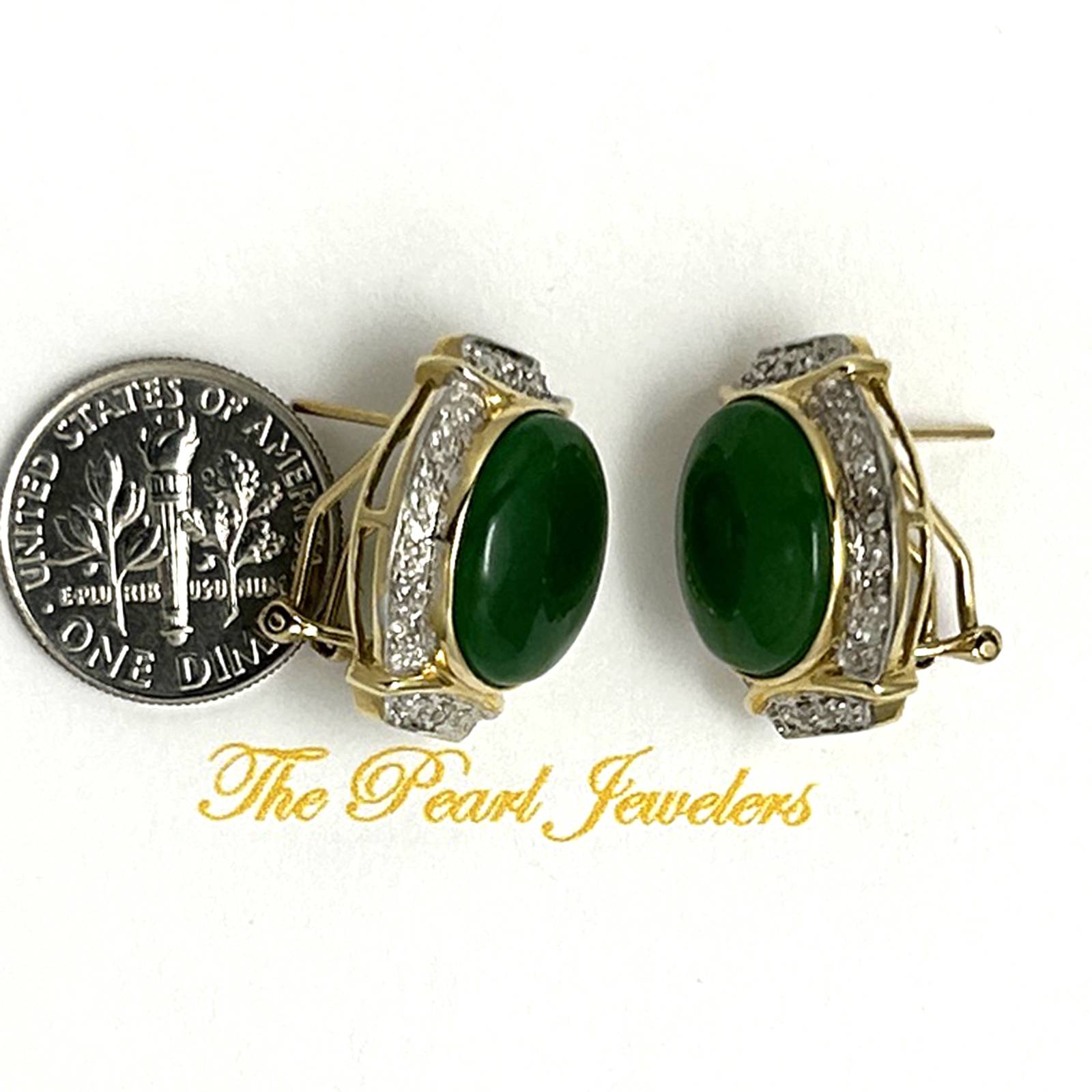14K Yellow Gold Omega Clip Diamond Green Jade Earrings