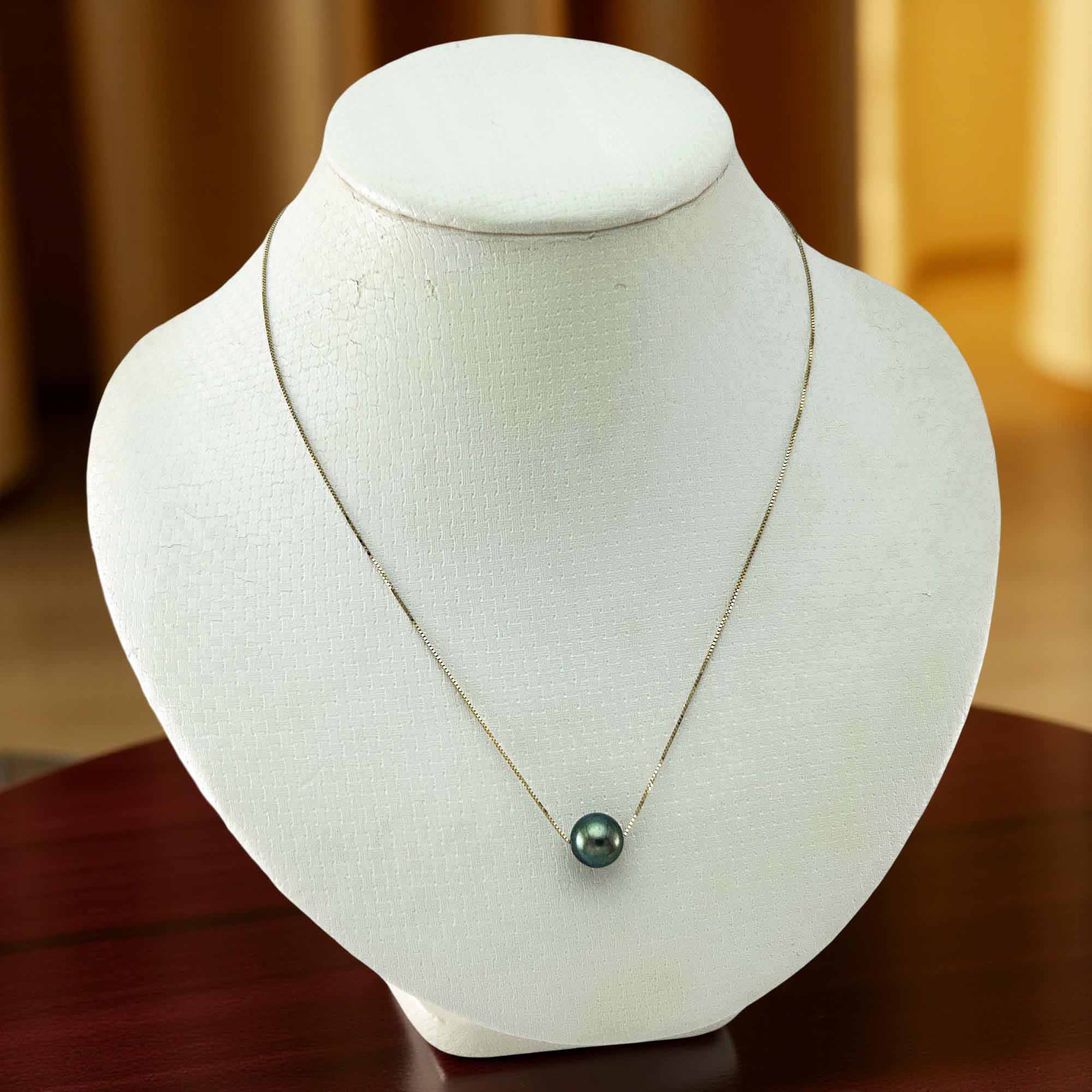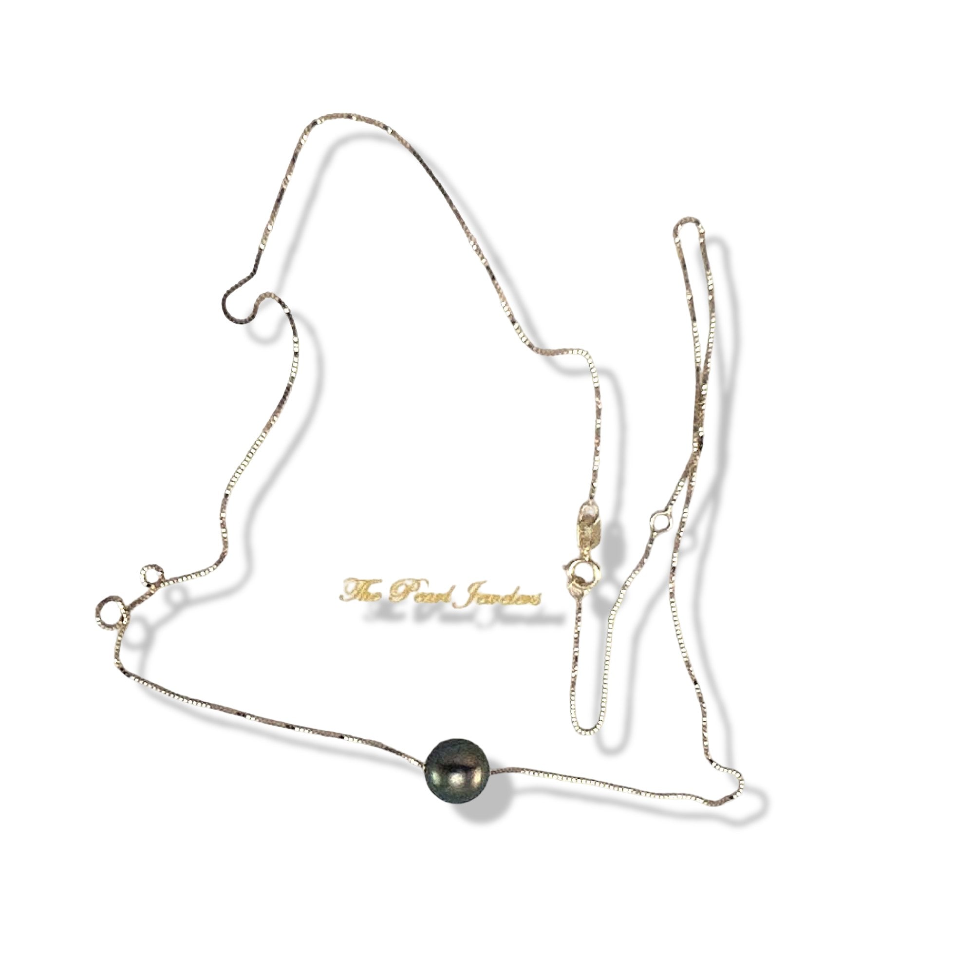 An 8-9mm black pearl slides between 14k gold rings on an adjustable 14k box chain—sophisticated and feminine, designed for comfort and dependable daily wear.